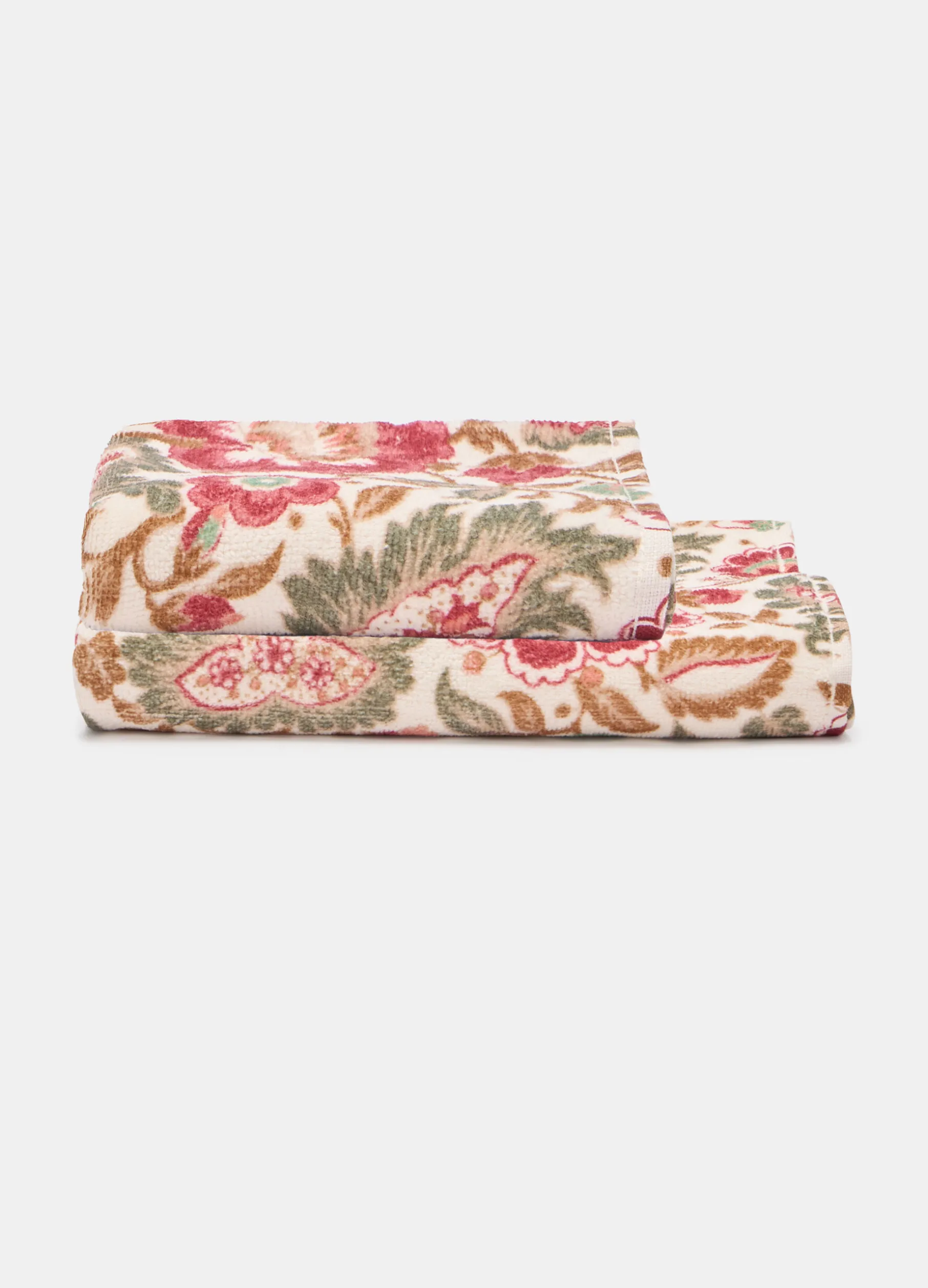Asciugamano per mani e viso di forma rettangolare, realizzato in spugna di puro cotone leggera e avvolgente, per assorbire l’acqua senza irritare la pelle. Il tessuto è arricchito dalla stampa con motivo floreale rosso. Dimensioni: 90 x 50 cm.