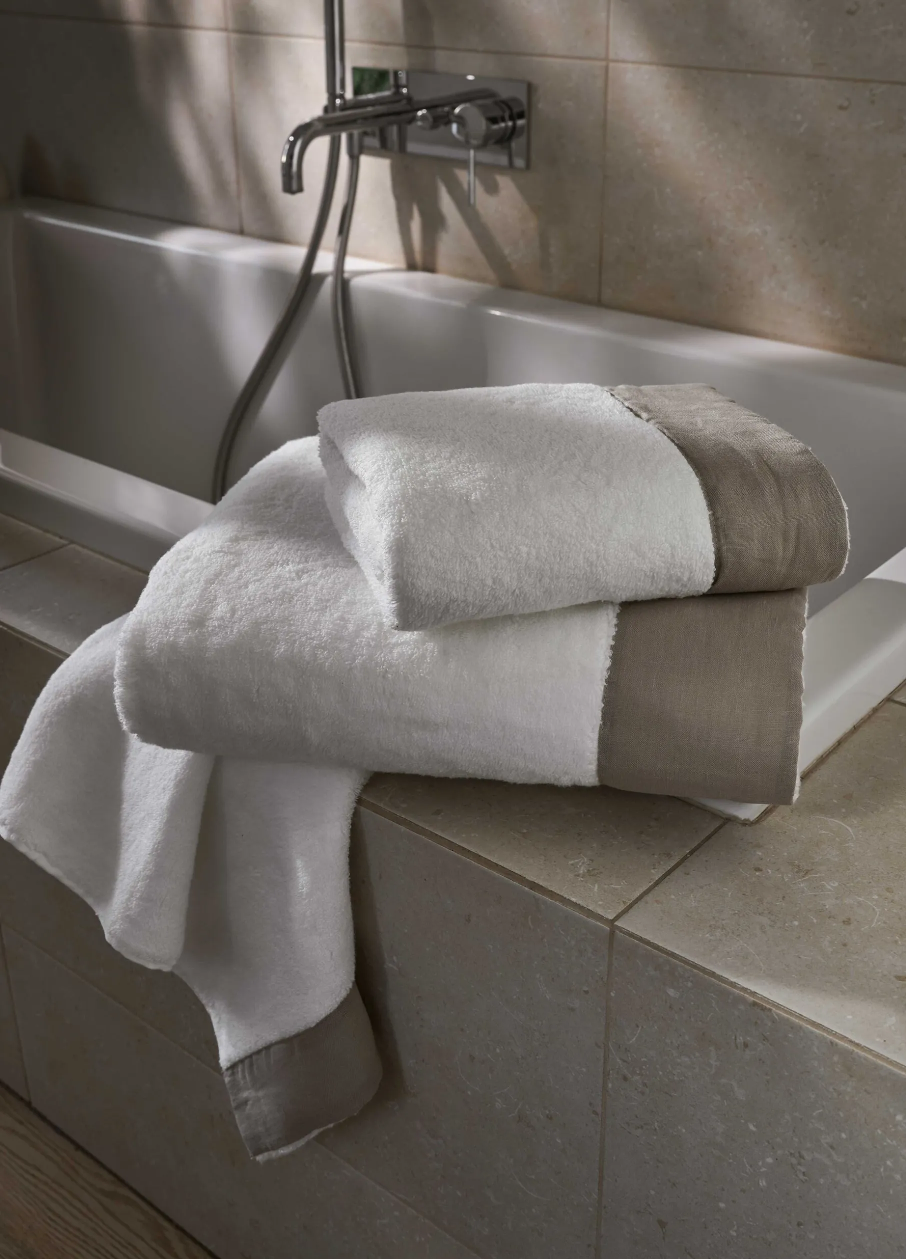 Asciugamano viso bianco in puto cotone 480 gsm con lavorazione zero twist e bordo 100% lino color naturale. Dimensioni 60×100 cm. Fatto in Portogallo.