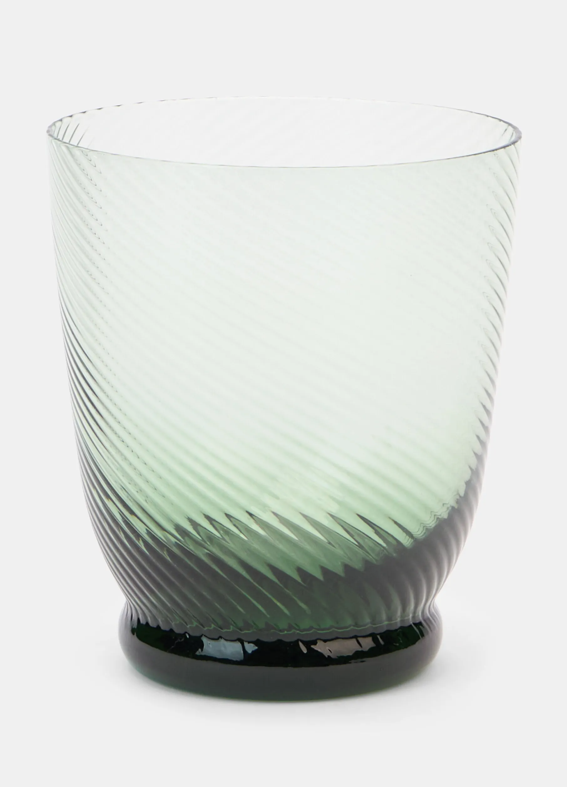 Bicchiere dal gusto eclettico e raffinato con base rotonda e rialzata, che mette in risalto l’interessante tonalità di verde. La colorazione va a sfumare verso l’alto, sostituita dalla delicata scanalatura del vetro. Altezza: 10 cm; diametro: 8,5 cm.