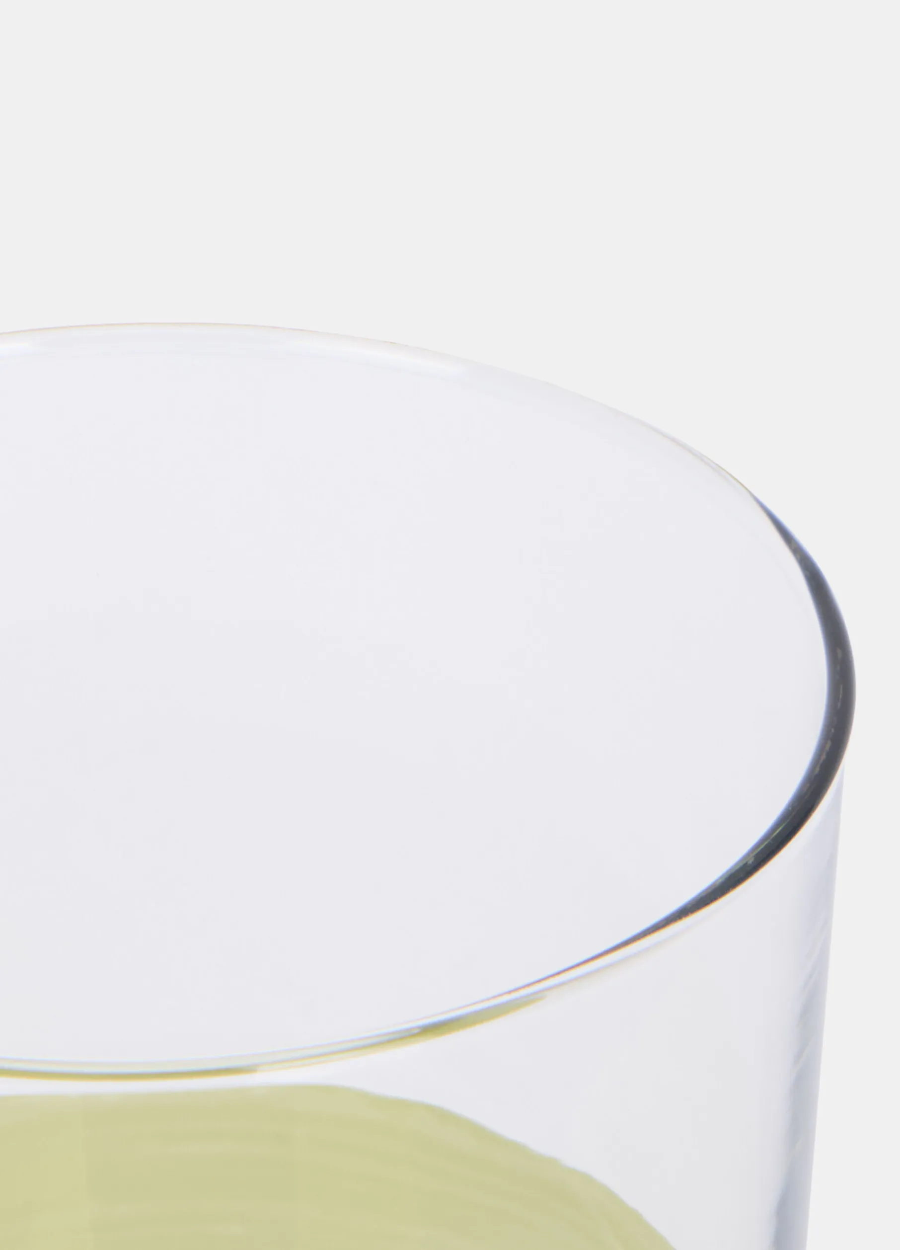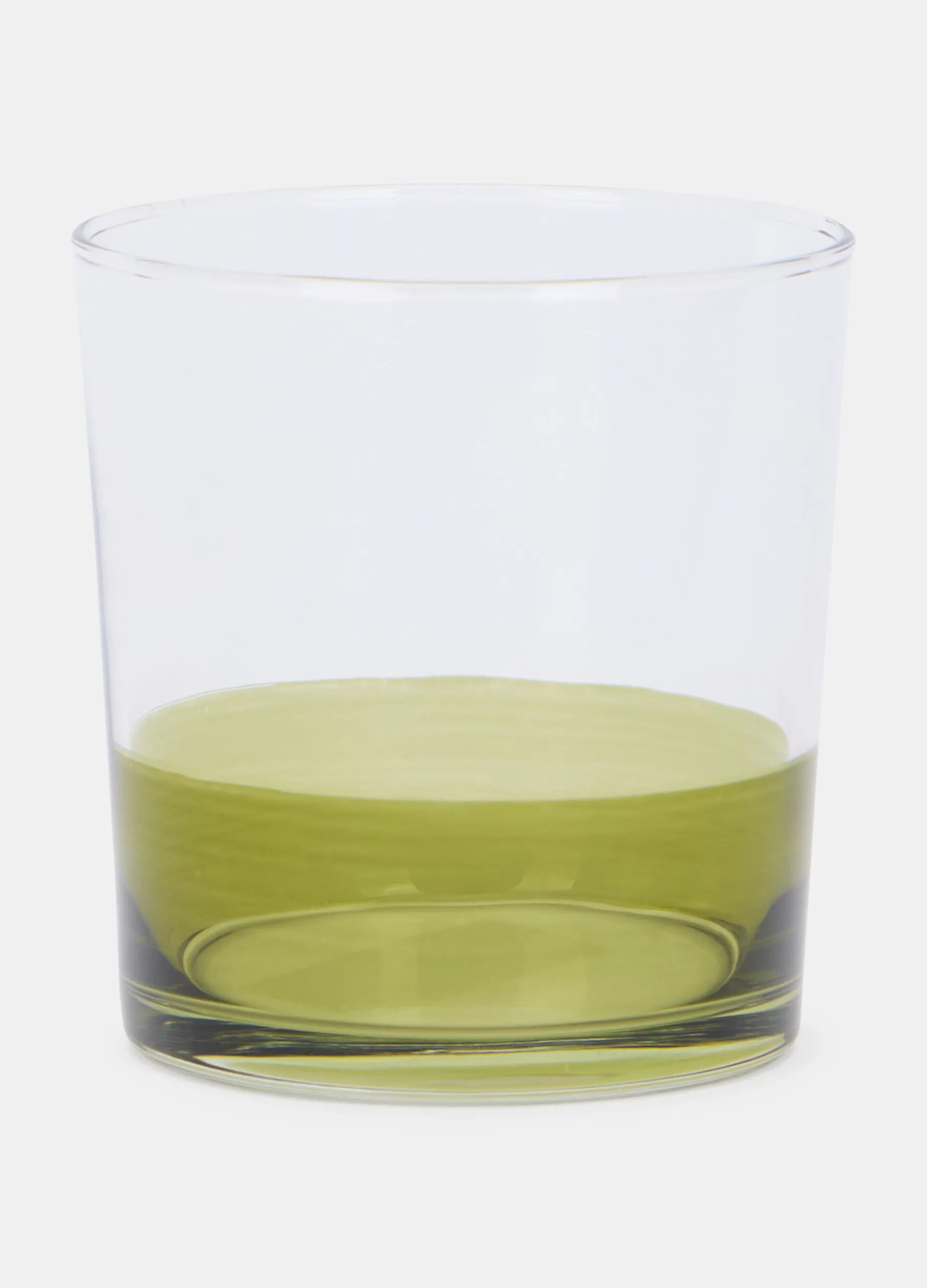 Bicchiere in vetro trasparente, decorato con una fascia color verde oliva nella parte inferiore. Altezza: 9 cm; capacità: 38 CL