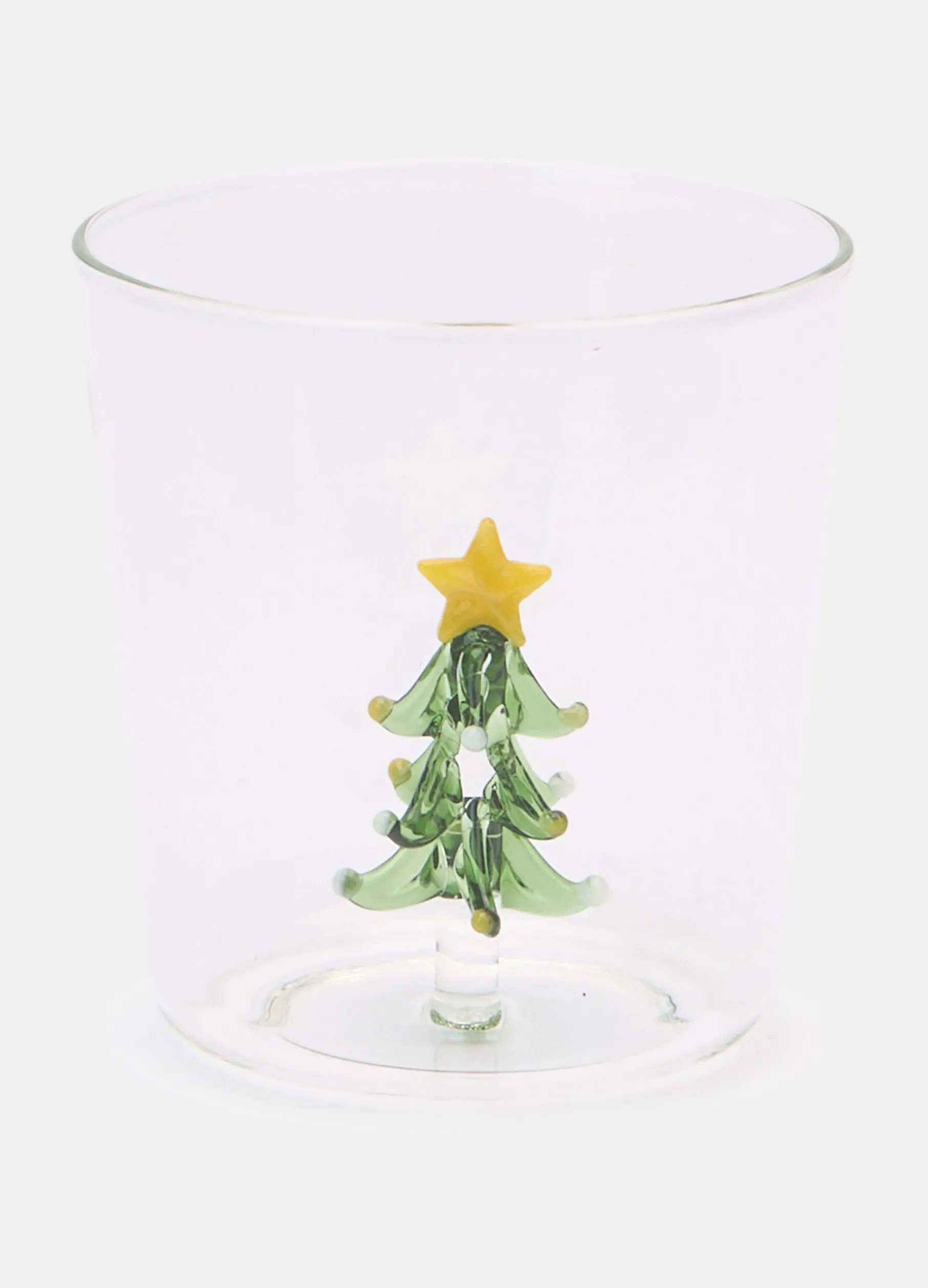 Bicchiere elegante e originale, realizzato in vetro trasparente e sottile con base rotonda e silhouette essenziale, arricchito dalla sagoma di un albero di Natale in vetro colorato all’interno. Altezza: 8,8 cm; diametro: 8,5 cm.