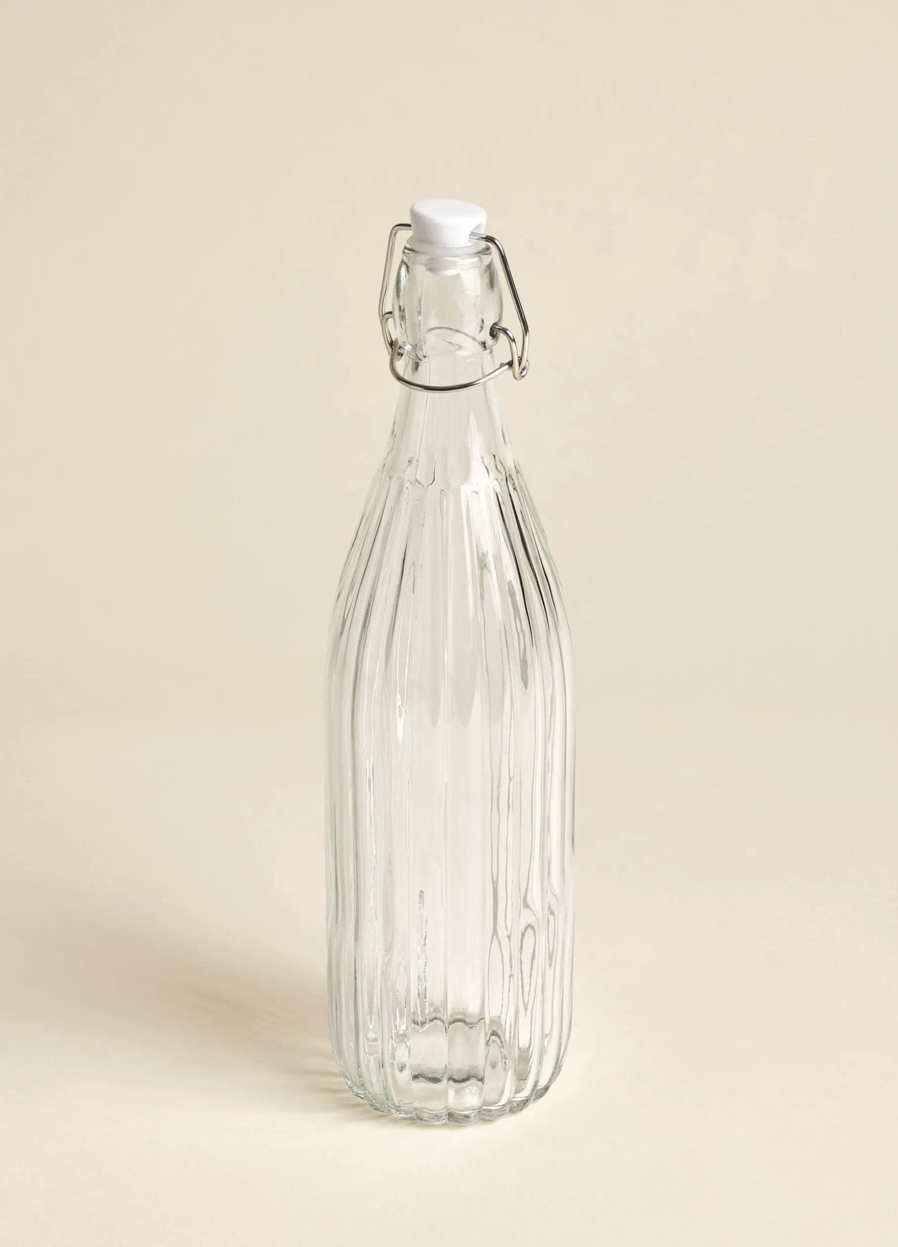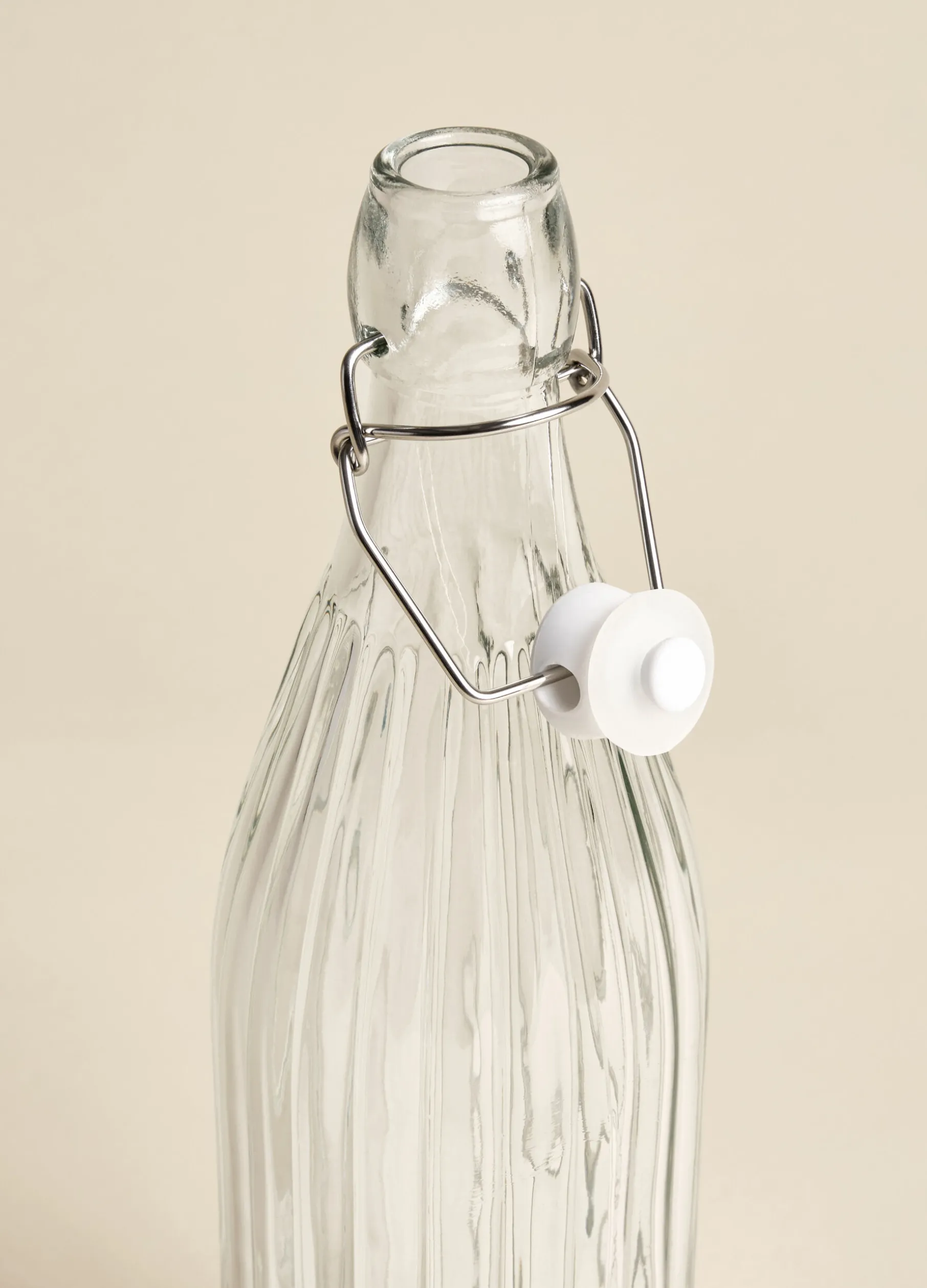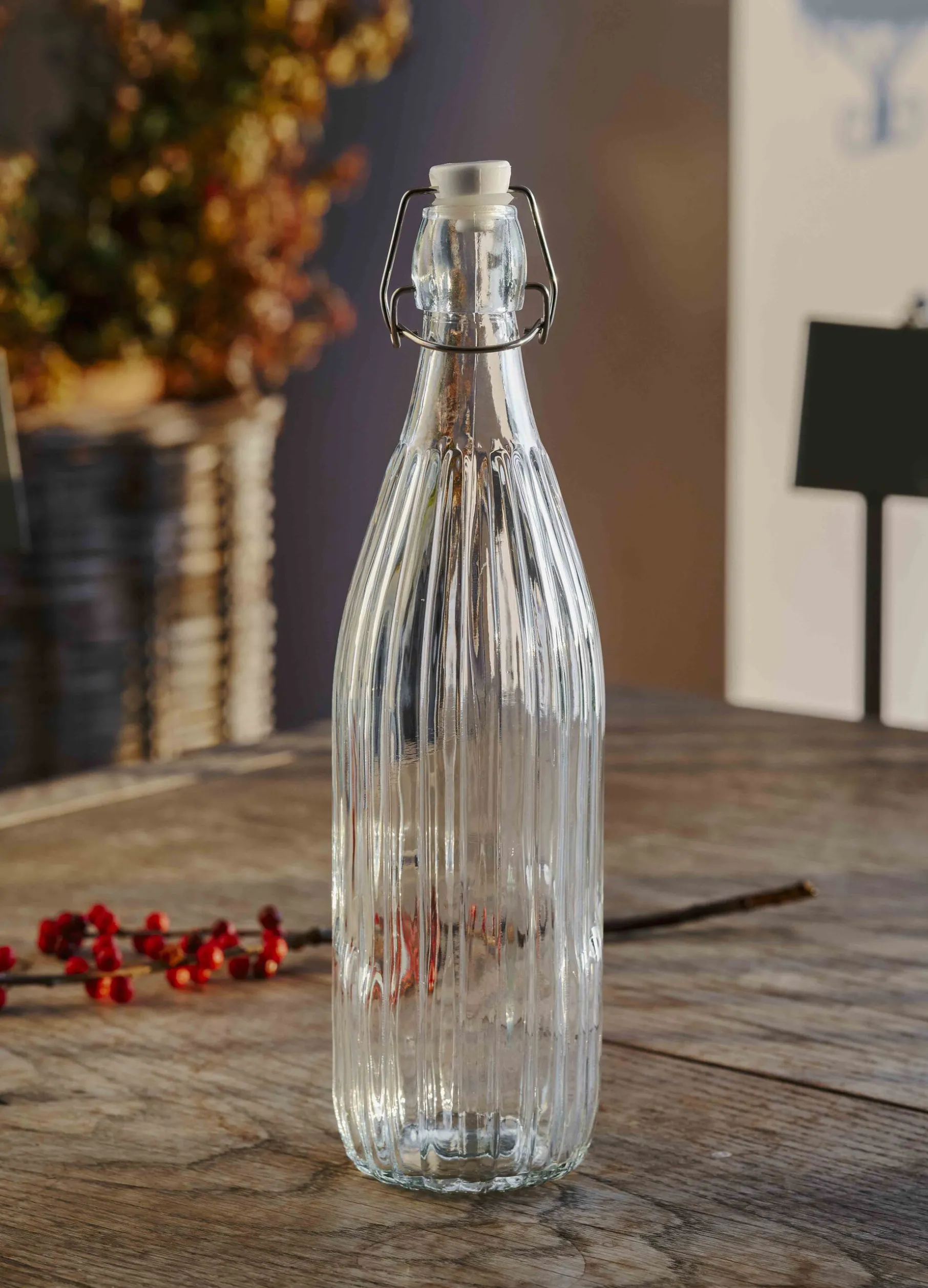 Bottiglia per acqua o altre bevande realizzata in vetro trasparente dalla particolare lavorazione scanalata che crea un effetto a righe. Con tappo ermetico che garantisce una tenuta ottimale ed evita le perdite.