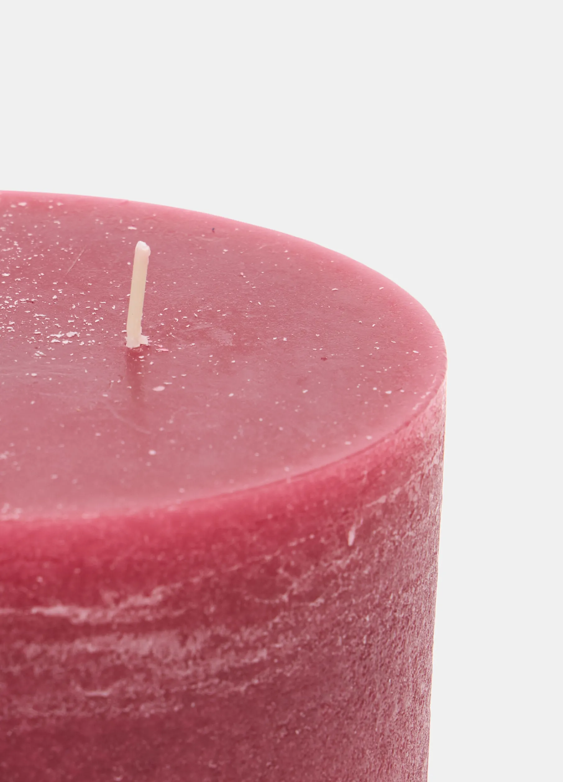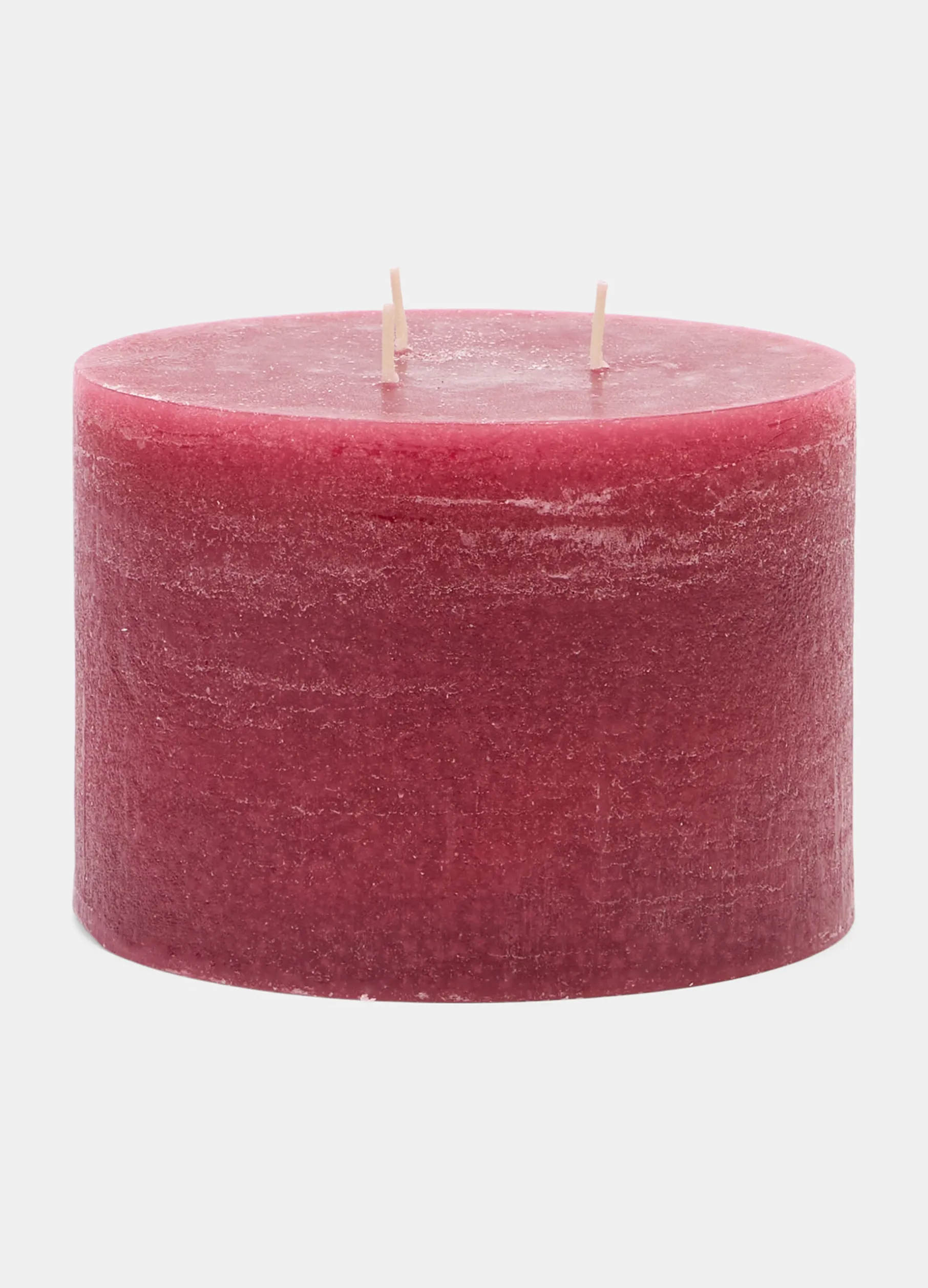 Candela a pilastro bassa e rotonda a 3 stoppini, realizzata in cera rosso intenso e attraversata da caratteristiche venature, con una superficie grezza e irregolare. Altezza: 14 cm; diametro: 10 cm.