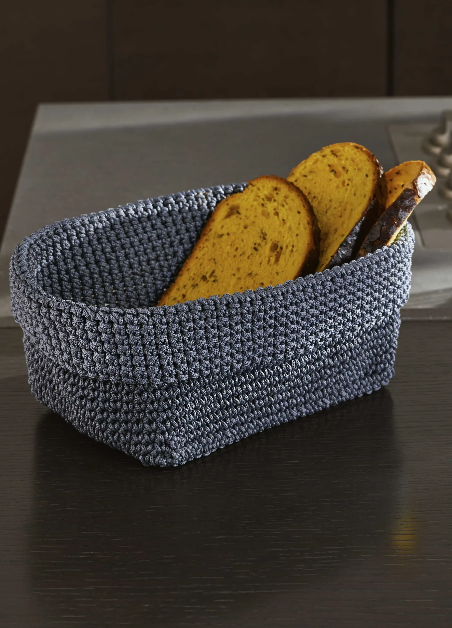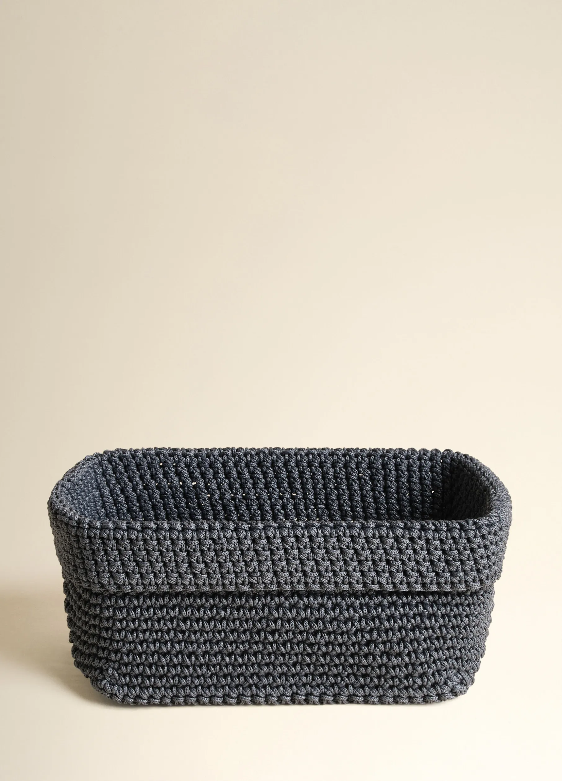 Cestino morbido di forma rettangolare realizzato intrecciando fibre spesse di un materiale pratico e resistente in blu avio. Con risvolto nella parte superiore.