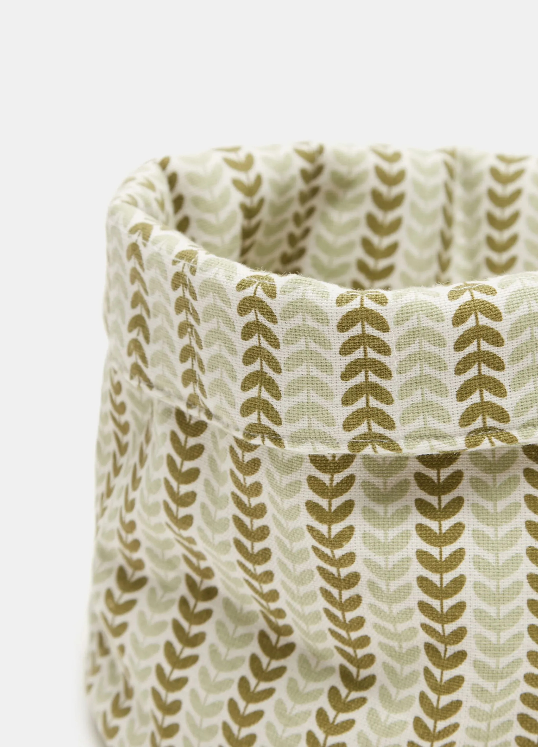 Cesto con stampa foglie in puro cotone, diametro 20 cm. Risvolto al fondo. Linea ECO by Croff.