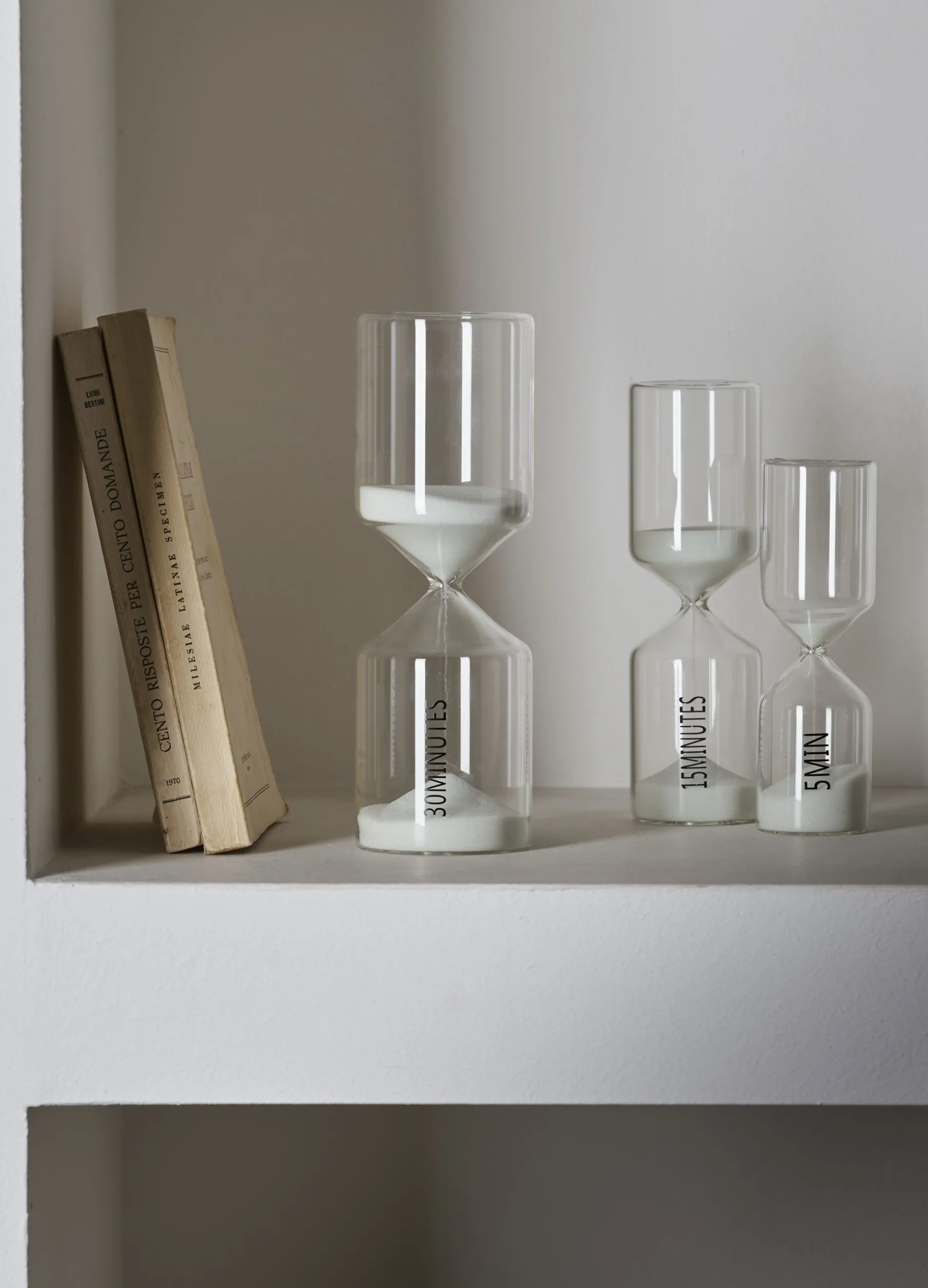 Clessidra in vetro con fine sabbia bianca, con timer da cinque minuti. Una decorazione moderna e funzionale.