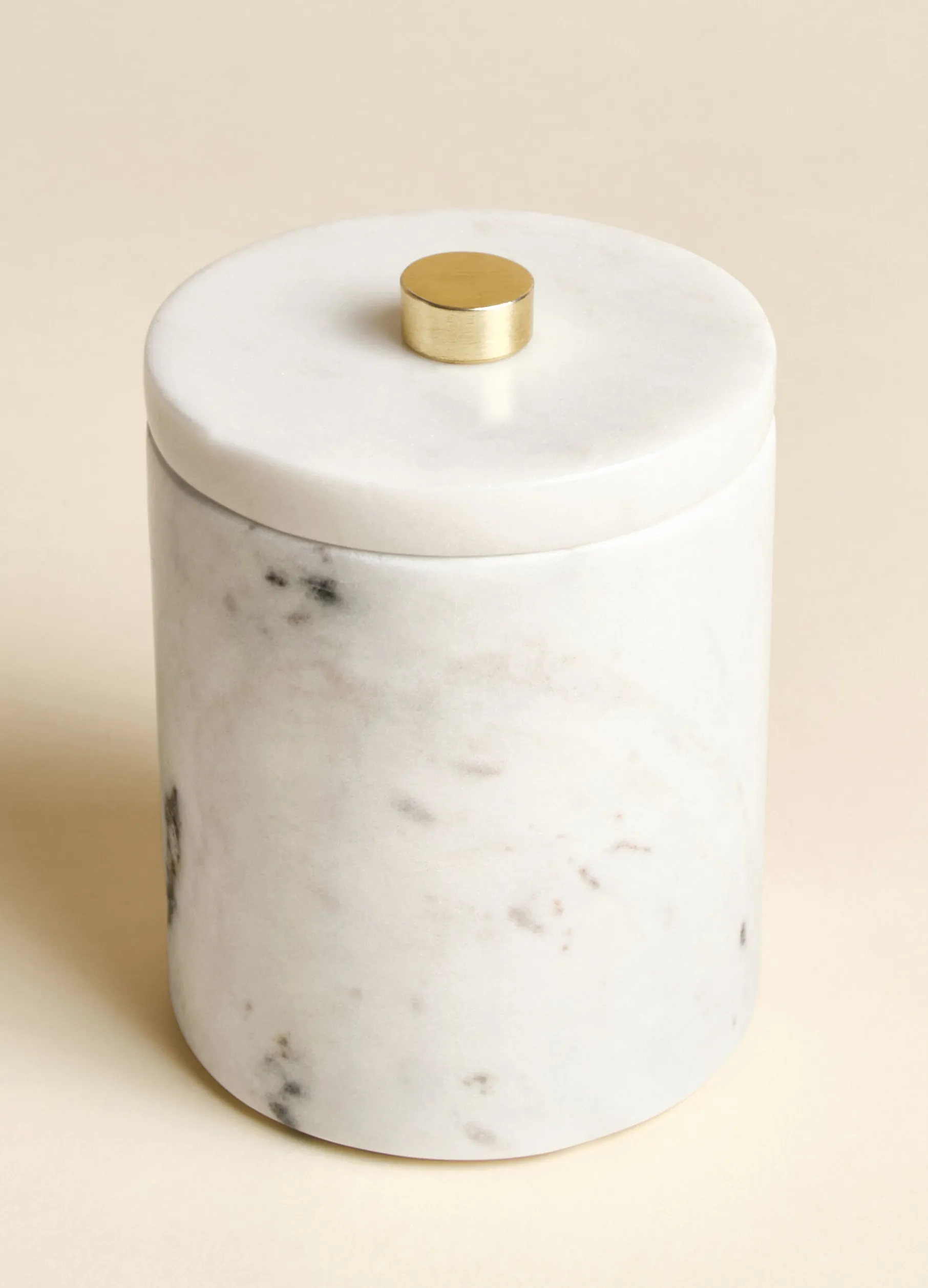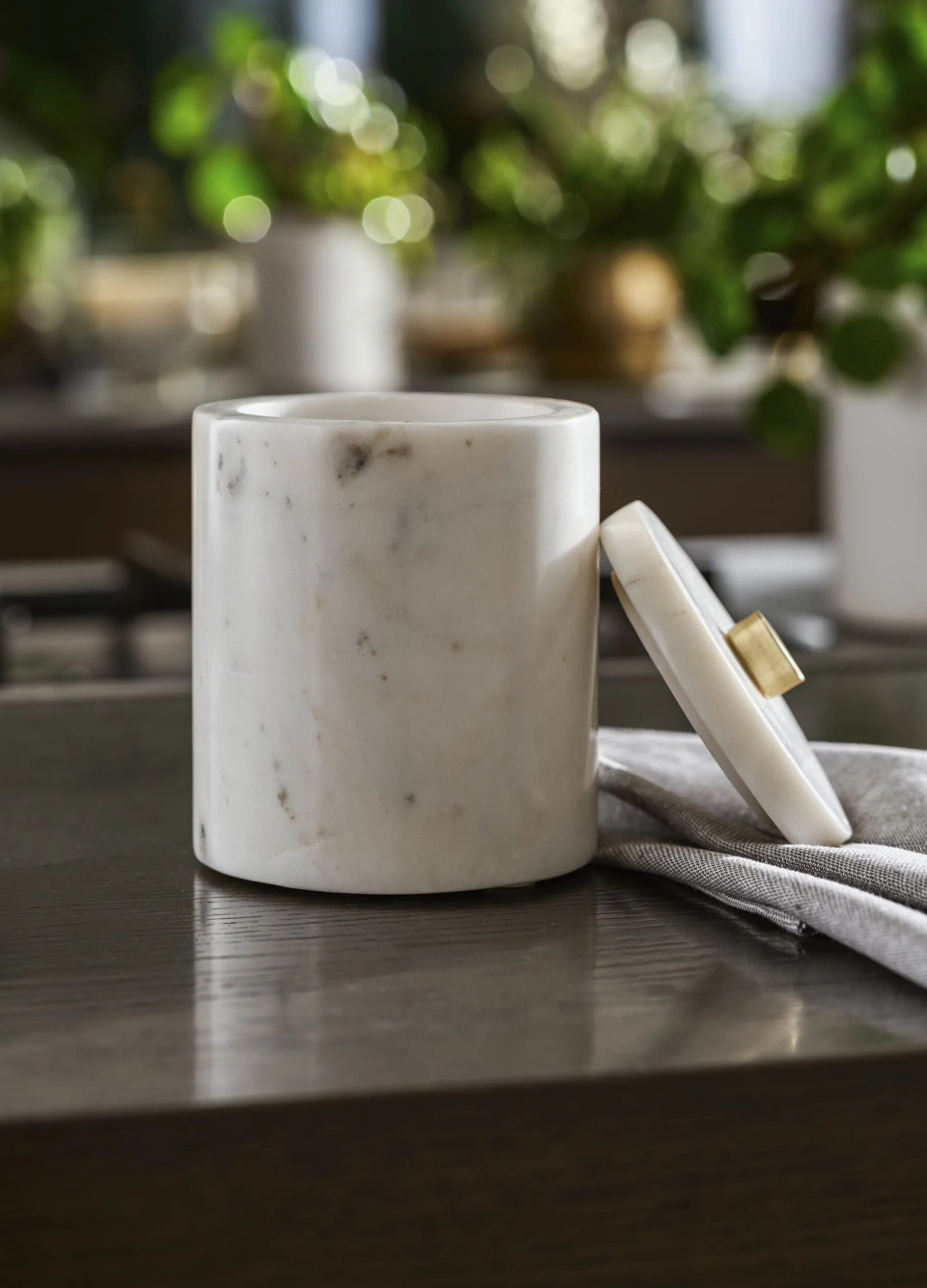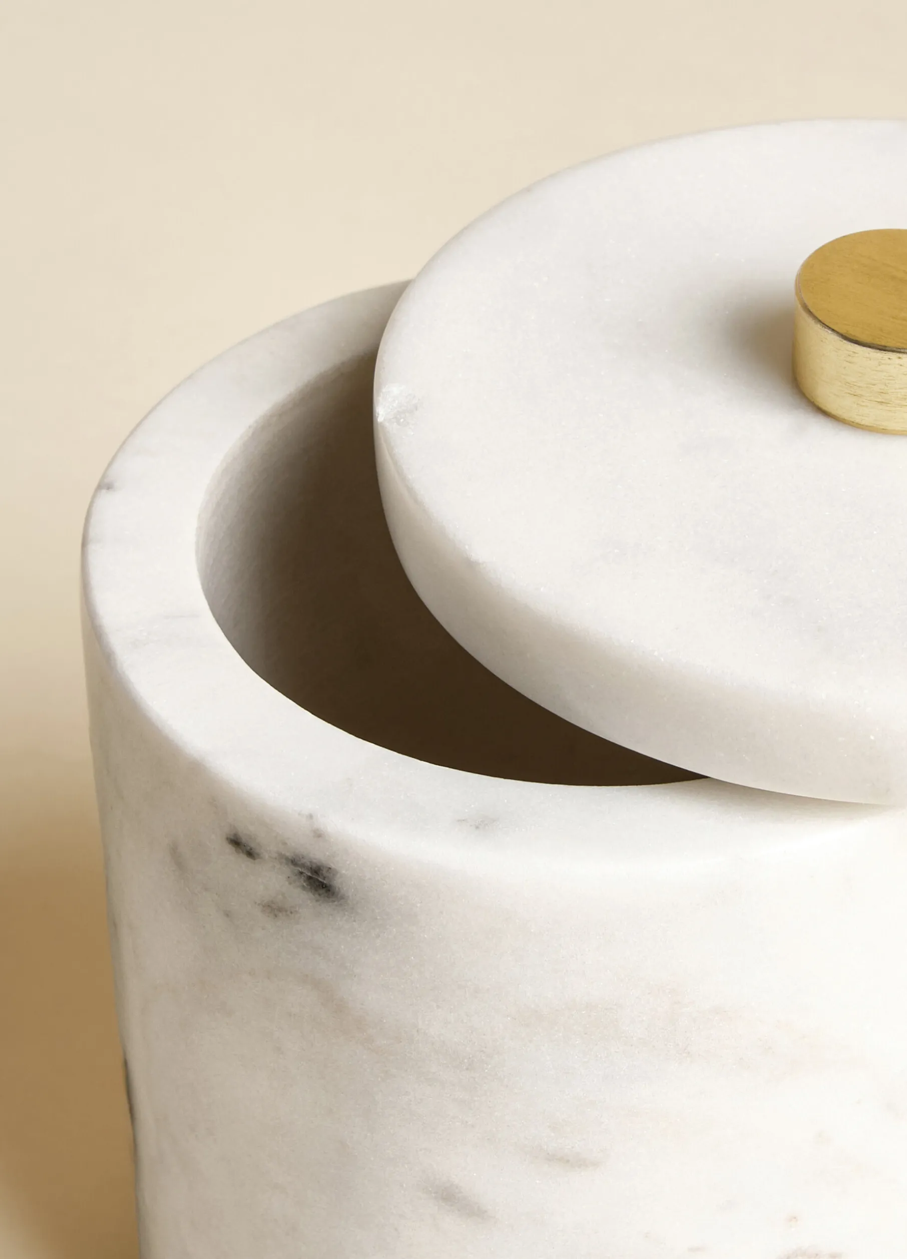 Contenitore di forma cilindrica realizzato in marmo bianco con delicate venature grigie, svolge la doppia funzione di utensile pratico per conservare cibi secchi e oggetto di arredo. Completato dal coperchio nello stesso materiale con pomello in metallo dorato.