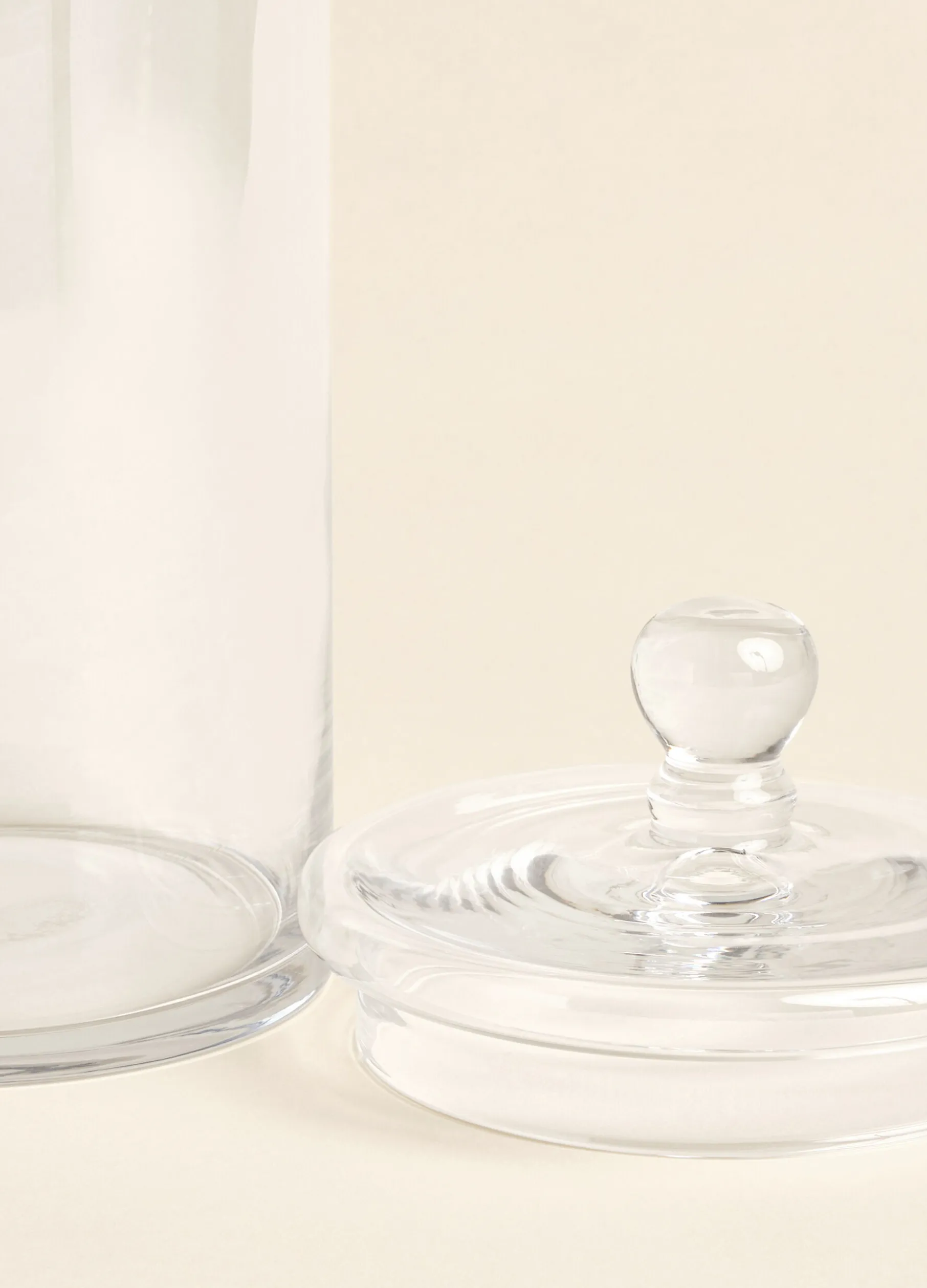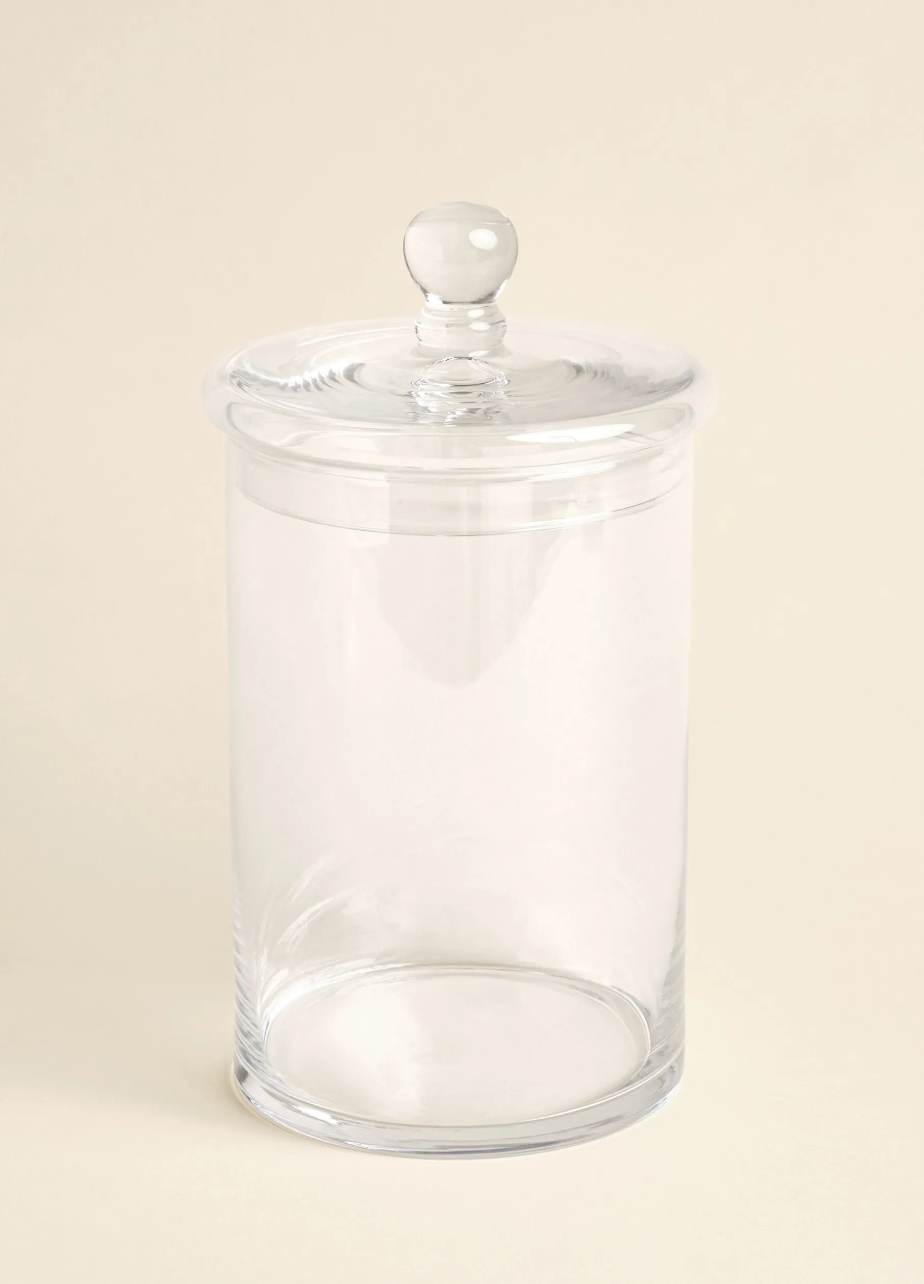 Contenitore per alimenti in vetro trasparente di forma cilindrica, dal gusto semplice ed elegante, completato da un coperchio con pomello nello stesso materiale.