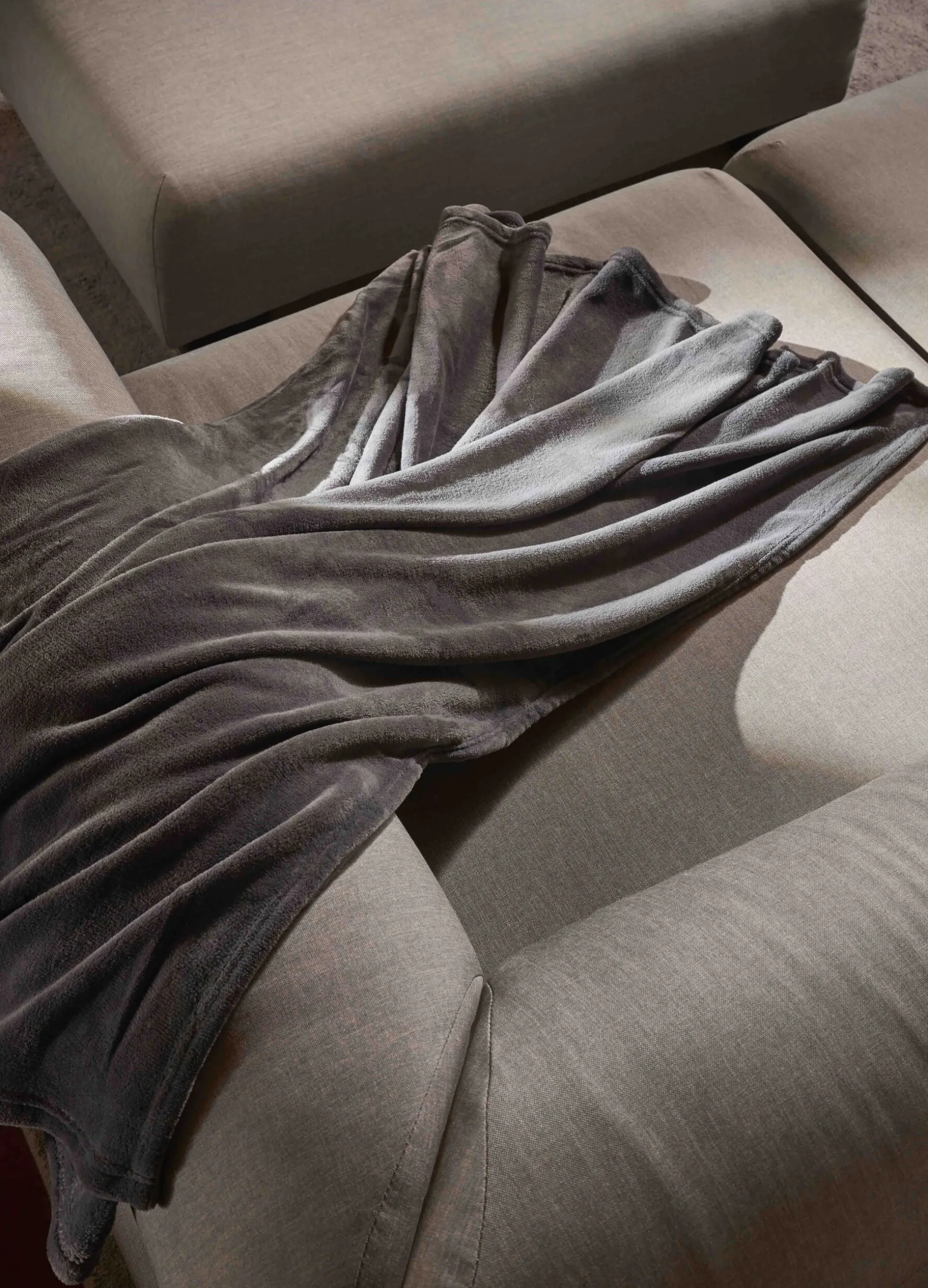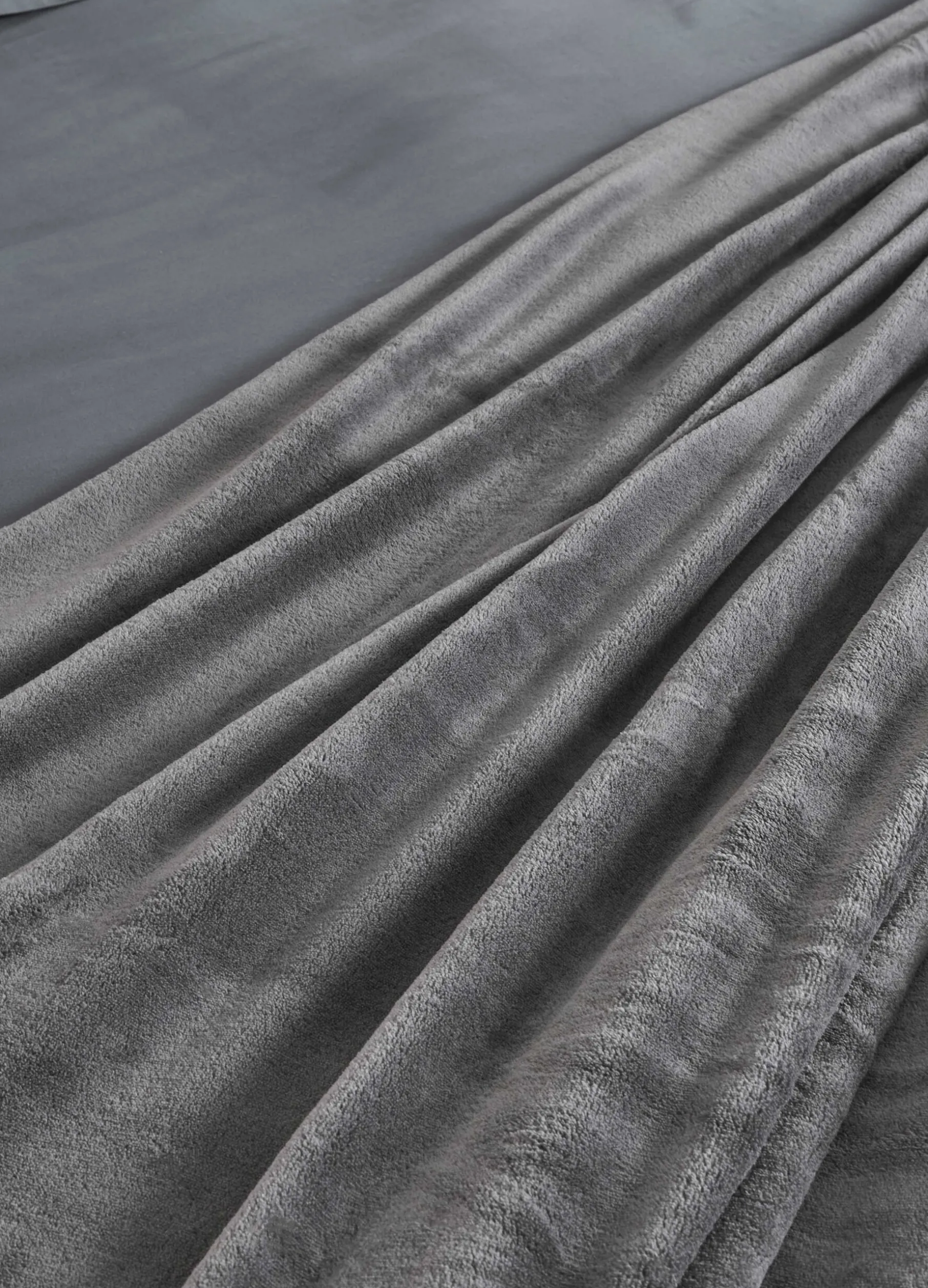 Morbida coperta a due piazze, ideale per letto matrimoniale, realizzata in pile grigio antracite. Il materiale è soffice e avvolgente, perfetto per garantire comfort e calore.