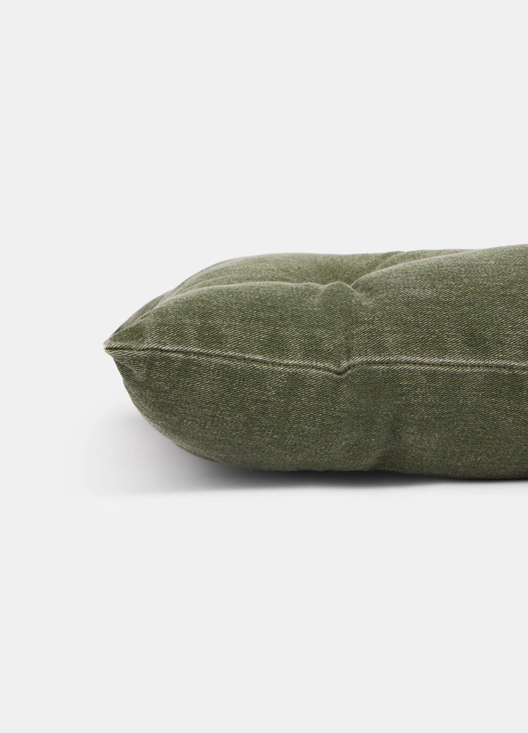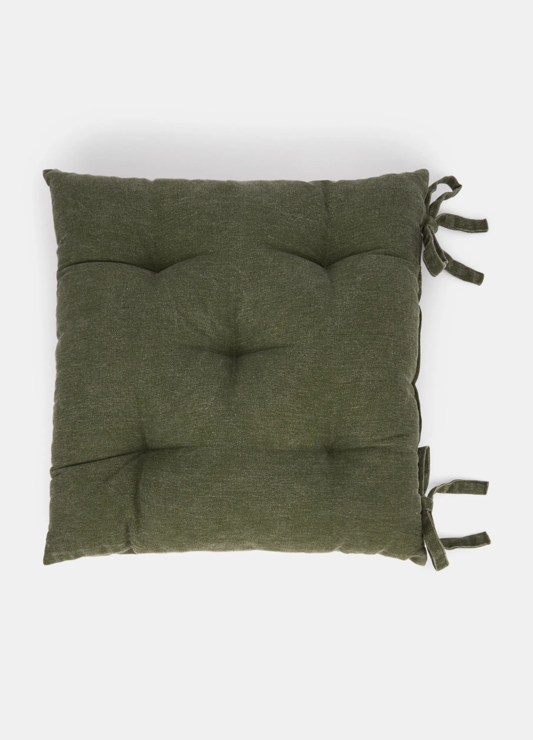 Cuscino quadrato per sedia verde scuro realizzato in cotone lavato: la particolare lavorazione di questo tessuto ricorda l’aspetto del denim, con una texture liscia e una colorazione sfumata. Completo di imbottitura e laccetti per fissarlo alla sedia. Dimensioni: 40 x 40 cm.