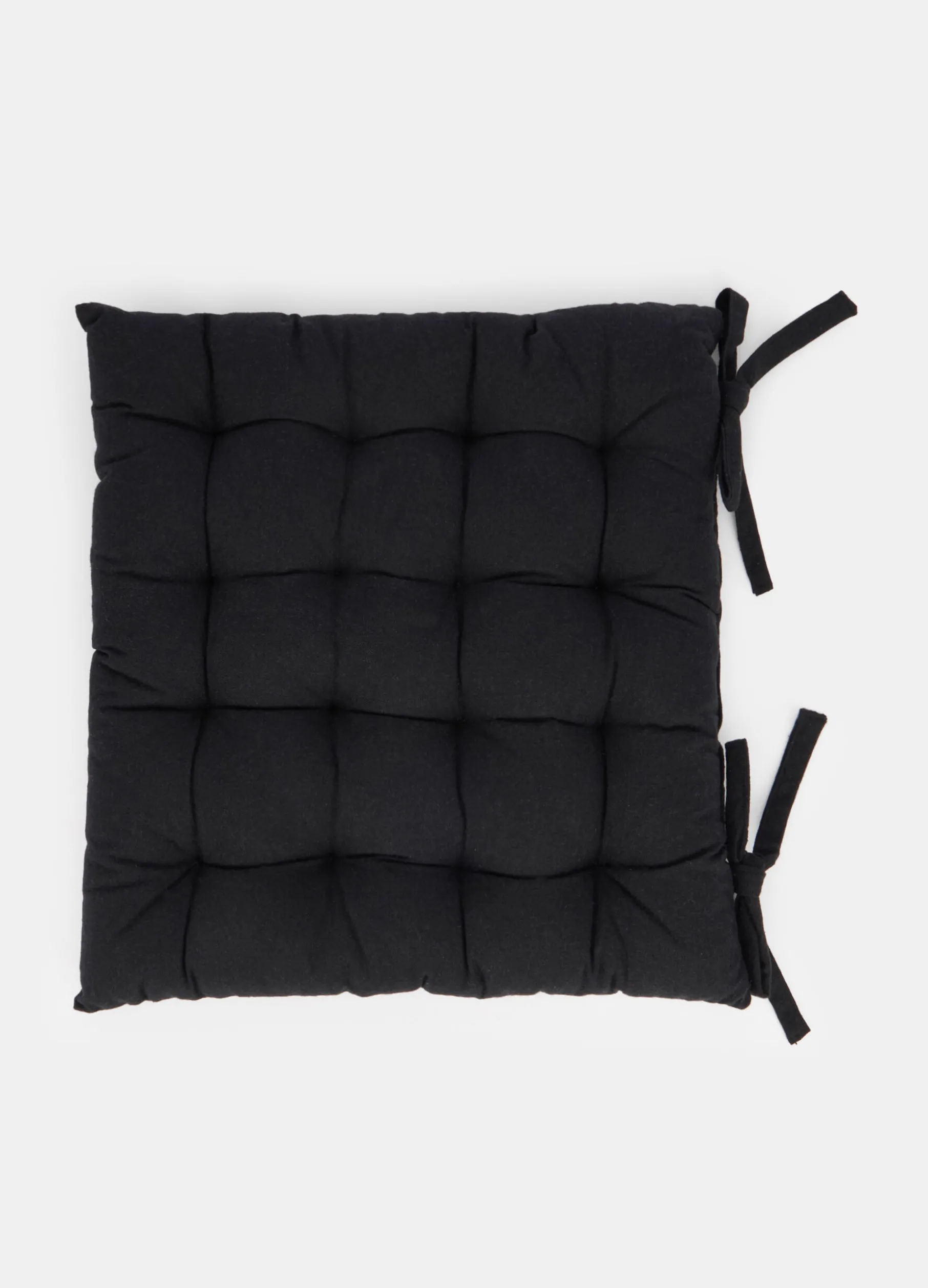 Cuscino quadrato per sedia, completo di imbottitura per garantire il comfort e una seduta corretta. Il tessuto nero a tinta unita ha una texture caratteristica simile alla tela, ed è completato dalla trapuntatura e dai laccetti per fissarlo alla sedia. Dimensioni: 40 x 40 cm.