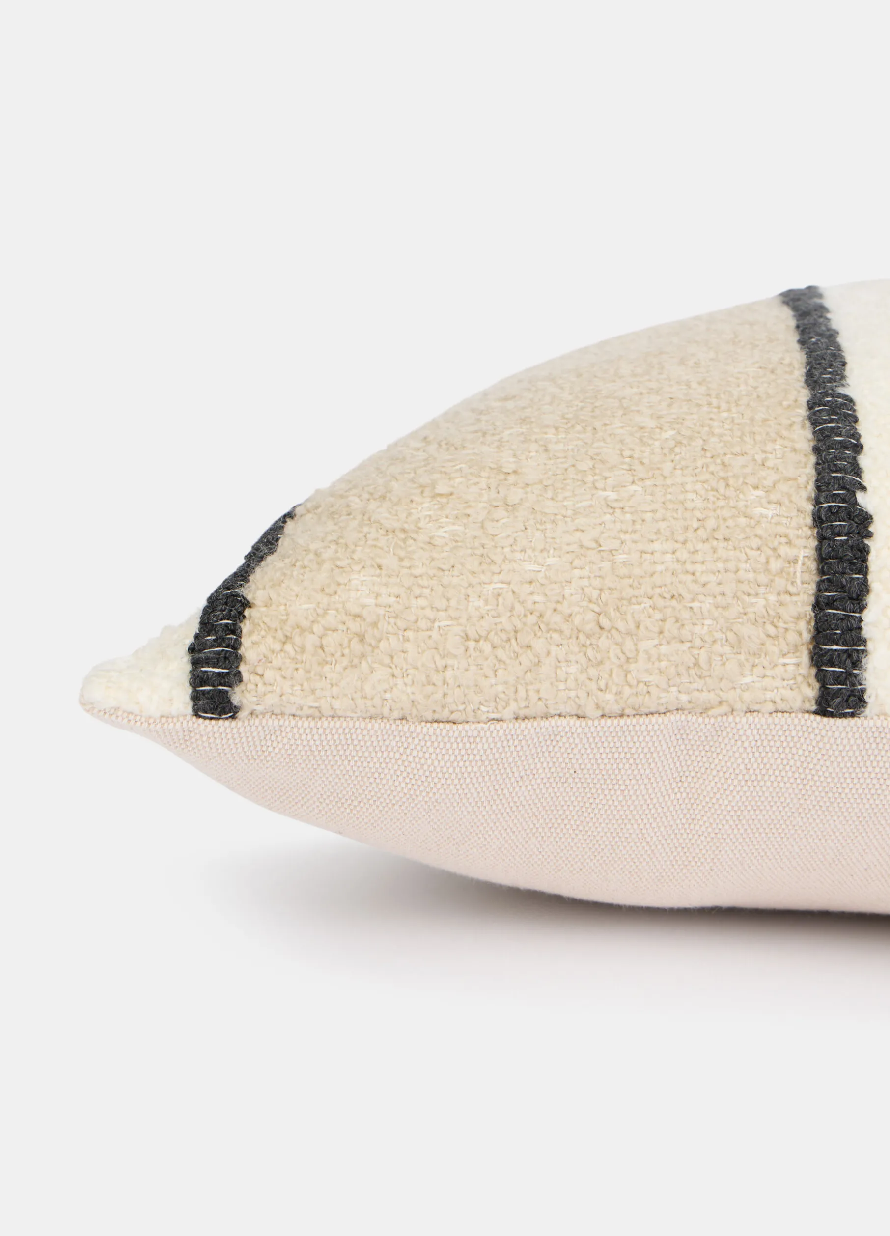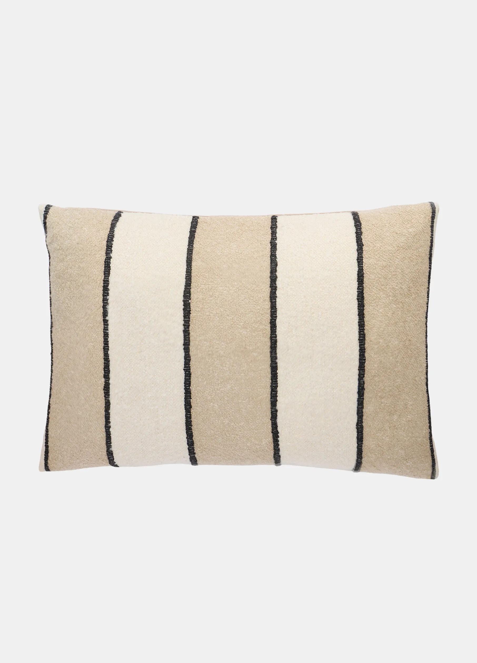 Cuscino imbottito ideale per arredare sia la zona living sia la zona notte. Presenta un motivo a fasce verticali beige e bianche, intervallate da sottili righe nere. Rifinito da una texture materica. Dimensioni: 60 x 40 cm.