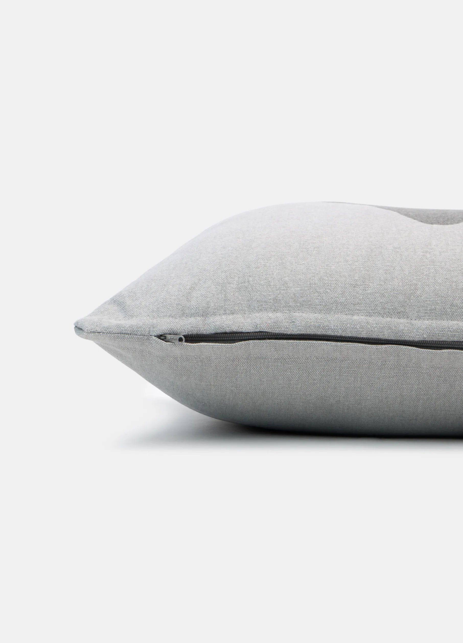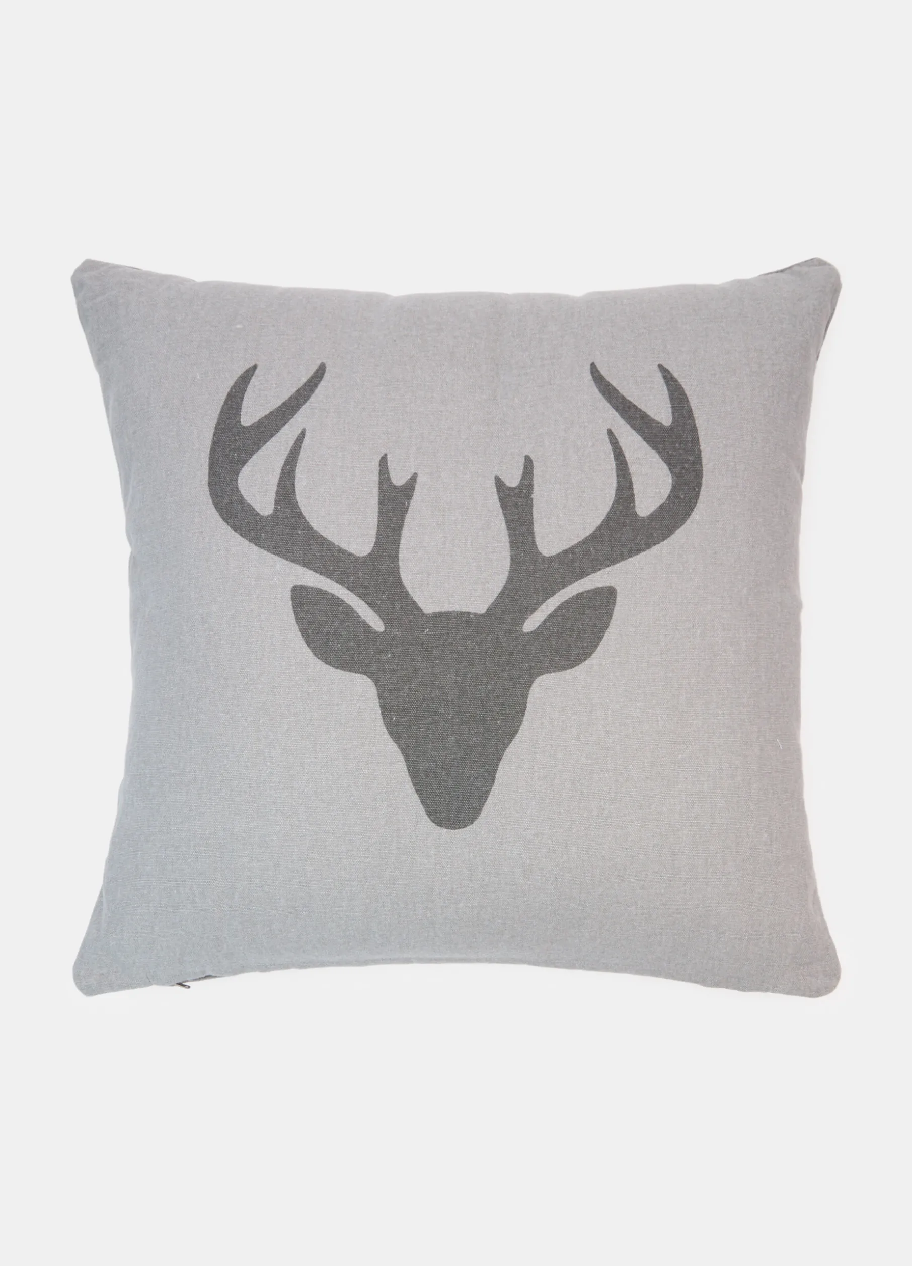 Cucino grigio chiaro, imbottito e sfoderabile, con rivestimento in tela di puro cotone che mette in risalto la trama leggermente irregolare del tessuto e la stampa centrale, con la silhouette stilizzata di una renna. Dimensioni: 45 x 45 cm.