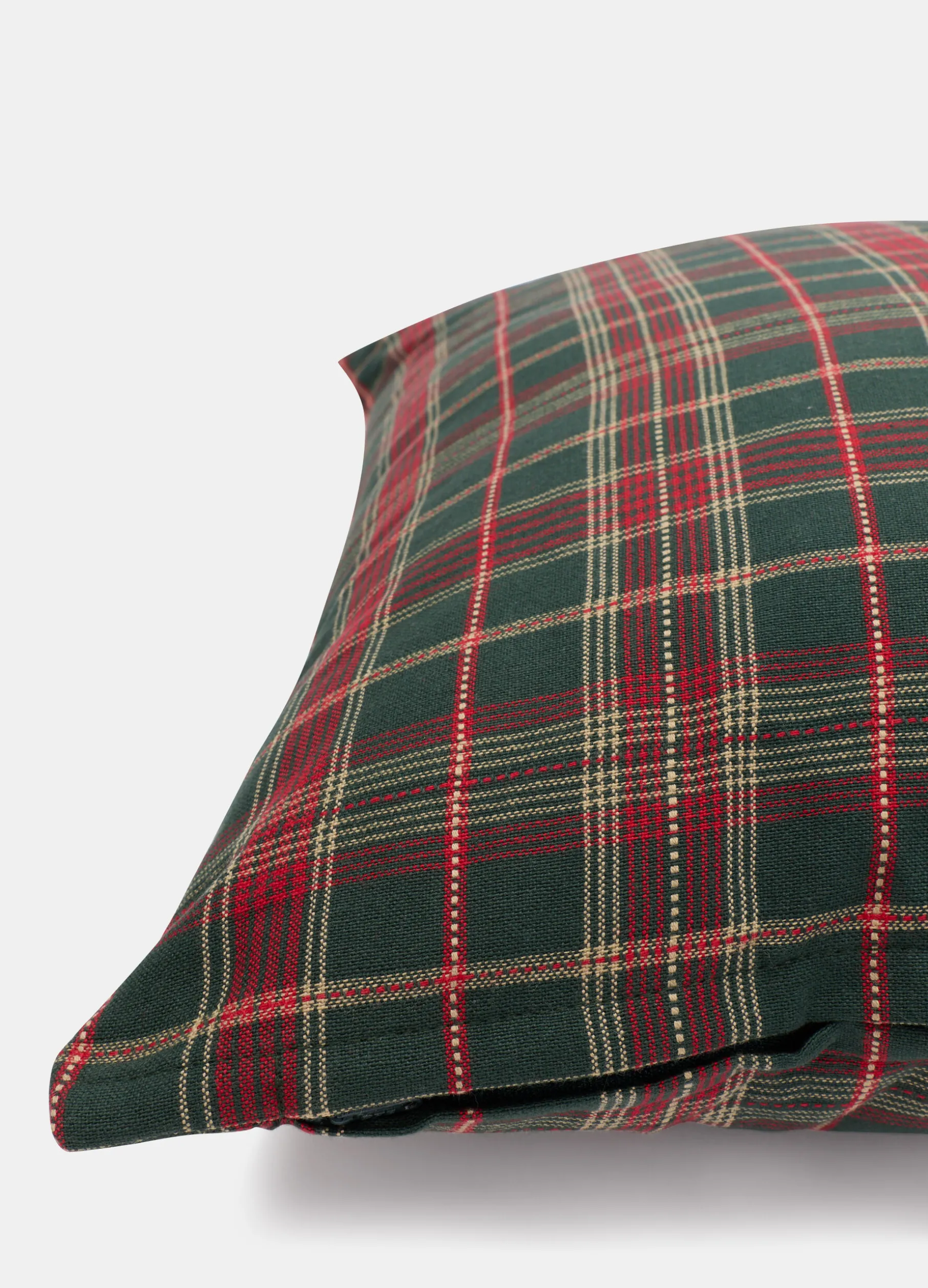 Cuscino quadrato, perfetto per il salotto o per rallegrare altri ambienti della casa, completo di imbottitura e rivestimento sfoderabile in cotone verde scuro a scacchi ispirato al classico tartan e arricchito da un simpatico orsetto ricamato. Dimensioni: 45 x 45 cm.
