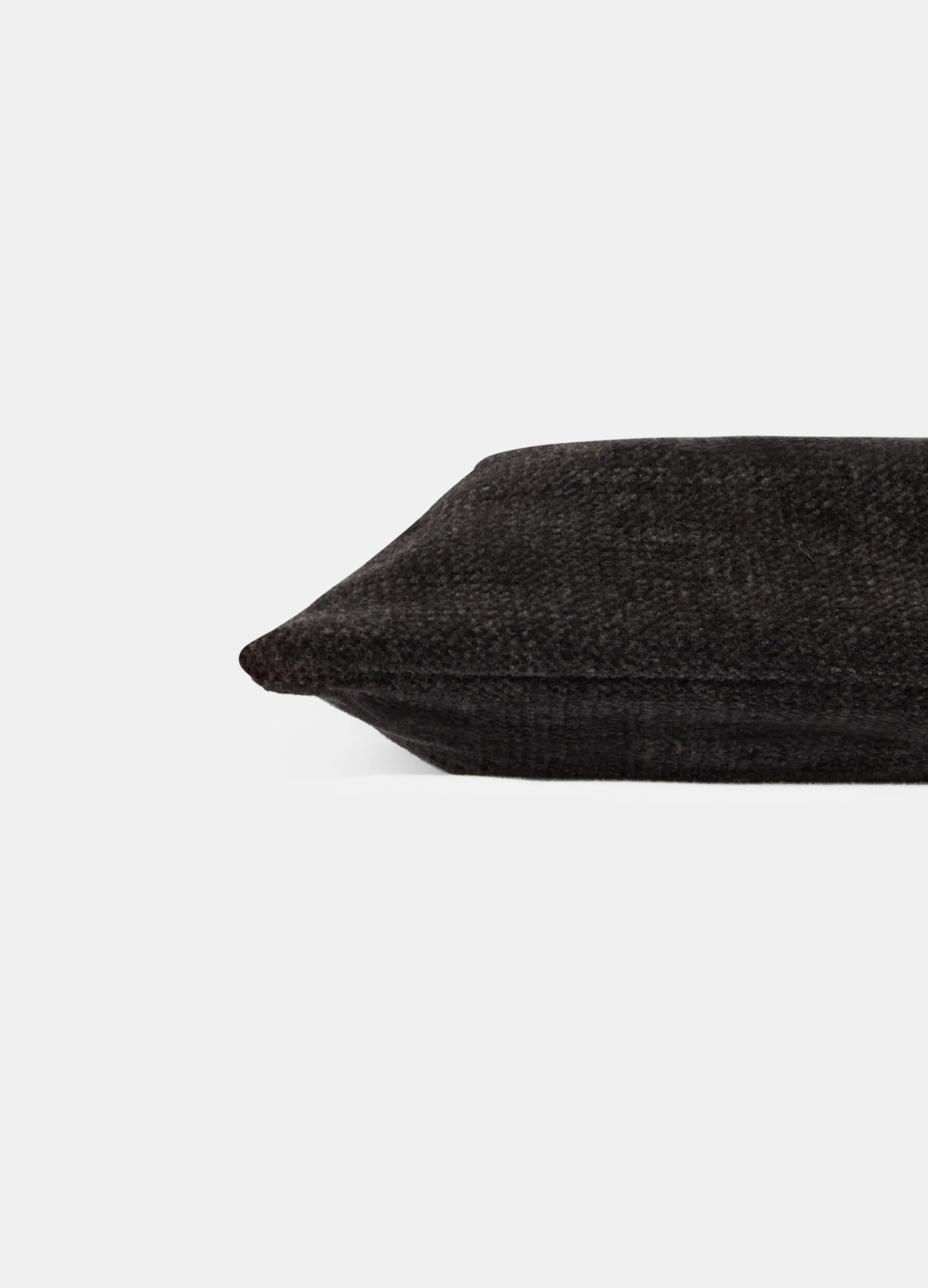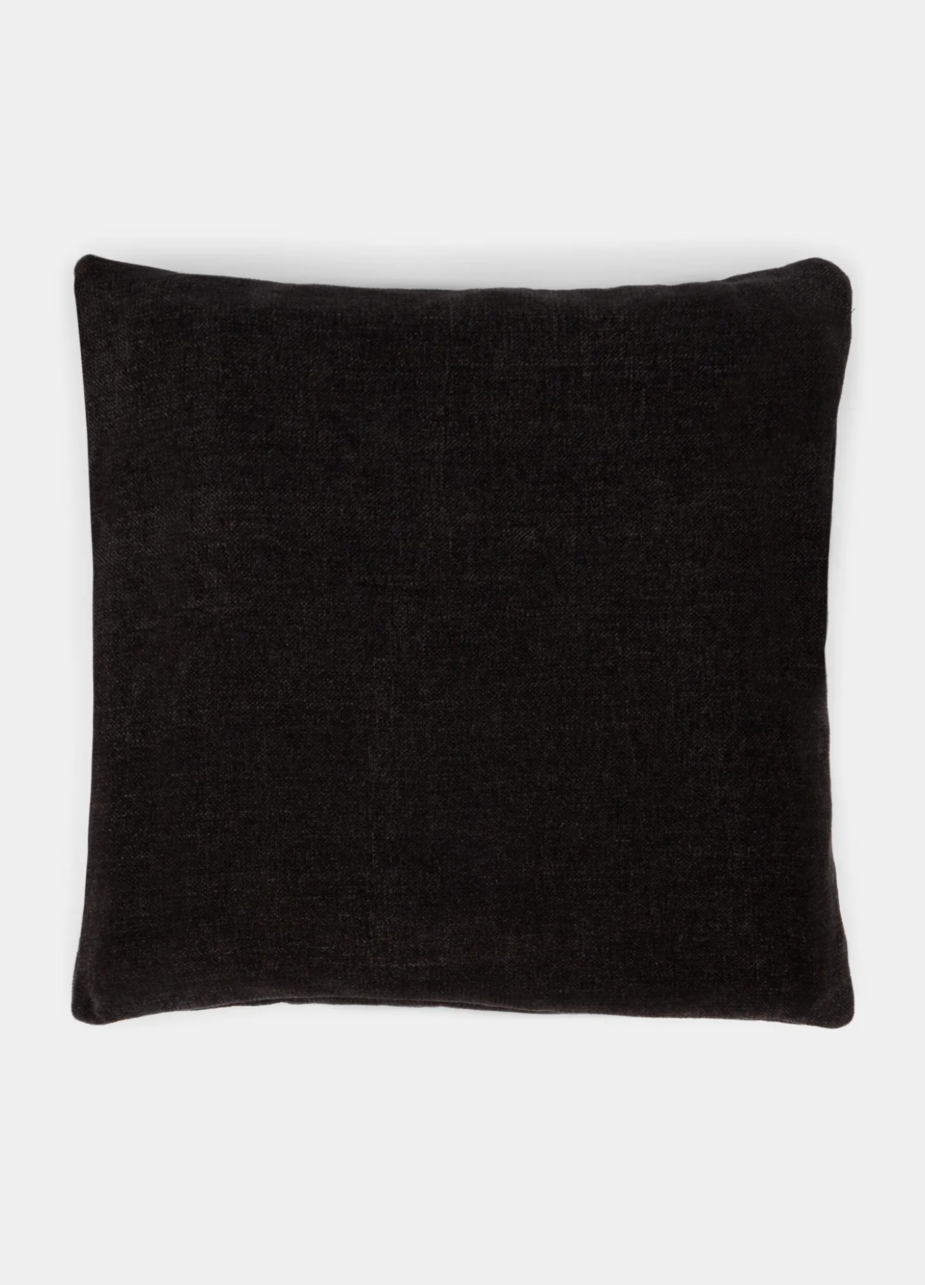 Cuscino quadrato con morbida imbottitura, rivestito in velluto nero dalla caratteristica texture liscia e dalla colorazione lievemente cangiante. Dimensioni: 45 x 45 cm.