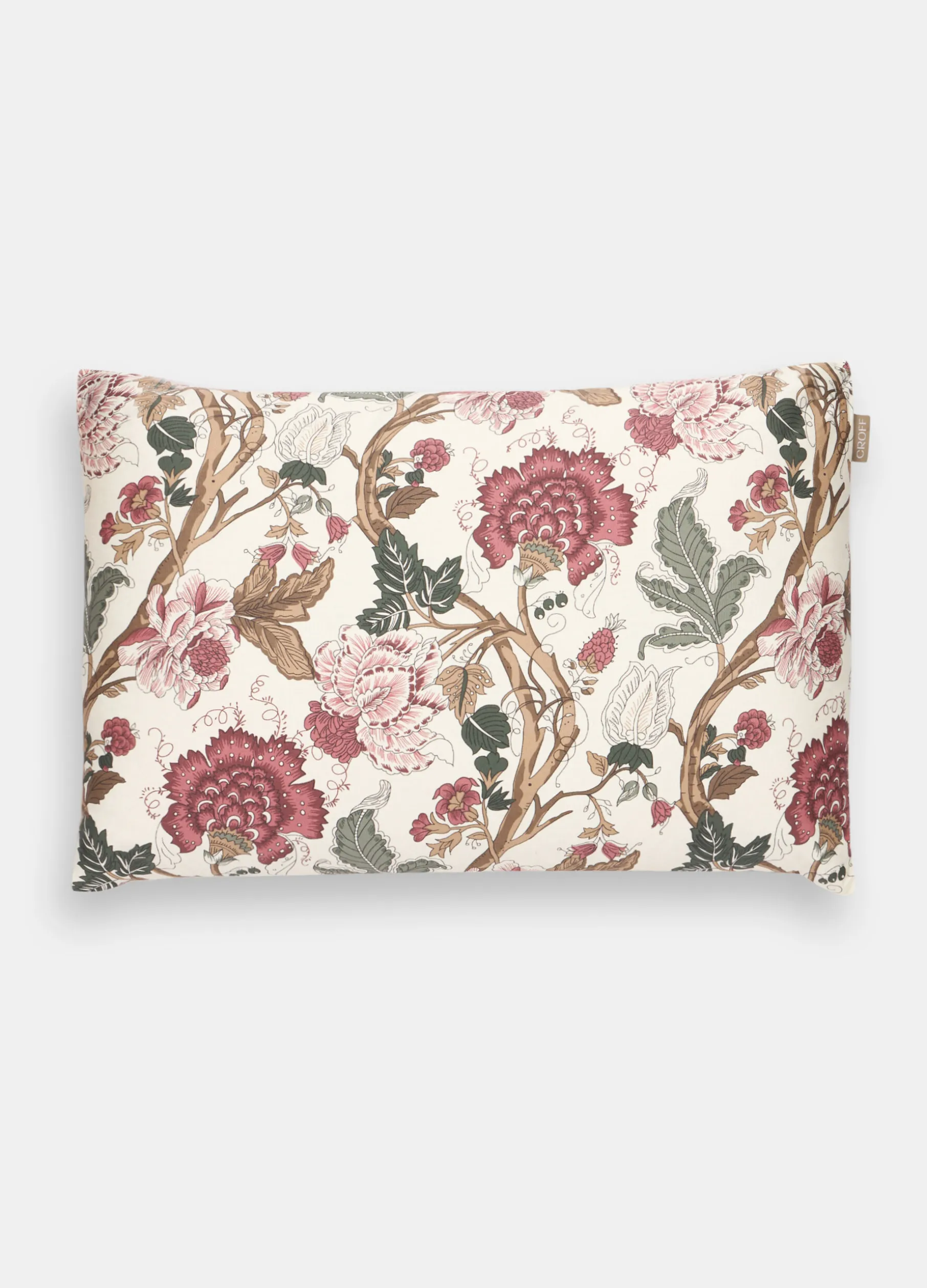 Cuscino rettangolare in puro cotone completo di imbottitura, ideale per decorare diversi spazi in casa. Lo sfondo bianco è arricchito da un motivo floreale di ispirazione fantastica in tonalità delicate. Dimensioni: 60 x 40 cm.