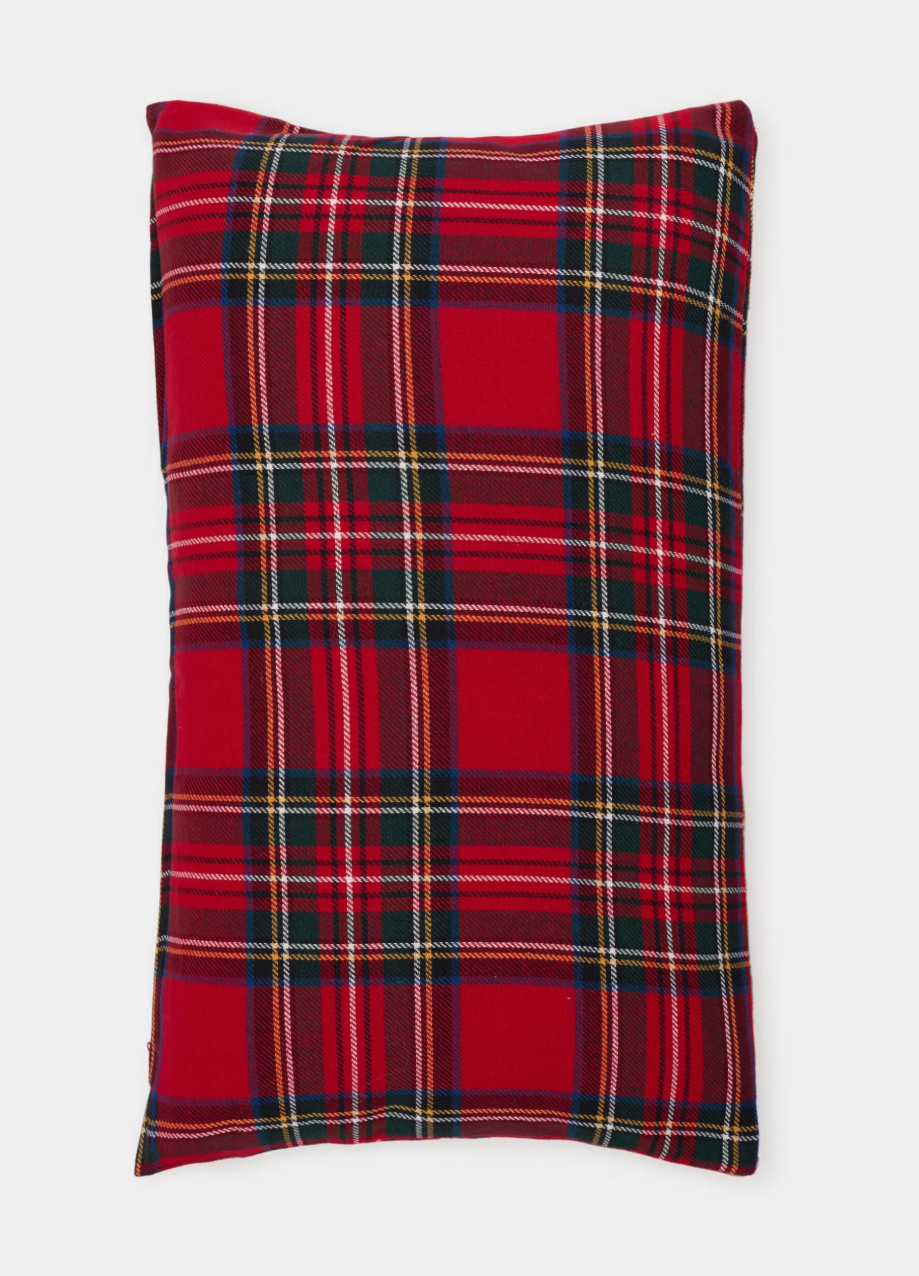 Cuscino rettangolare imbottito, ideale sul divano o per rallegrare qualsiasi ambiente, rivestito in cotone tartan che intreccia filati di diversi colori su fondo rosso. Dimensioni: 50 x 30 cm.