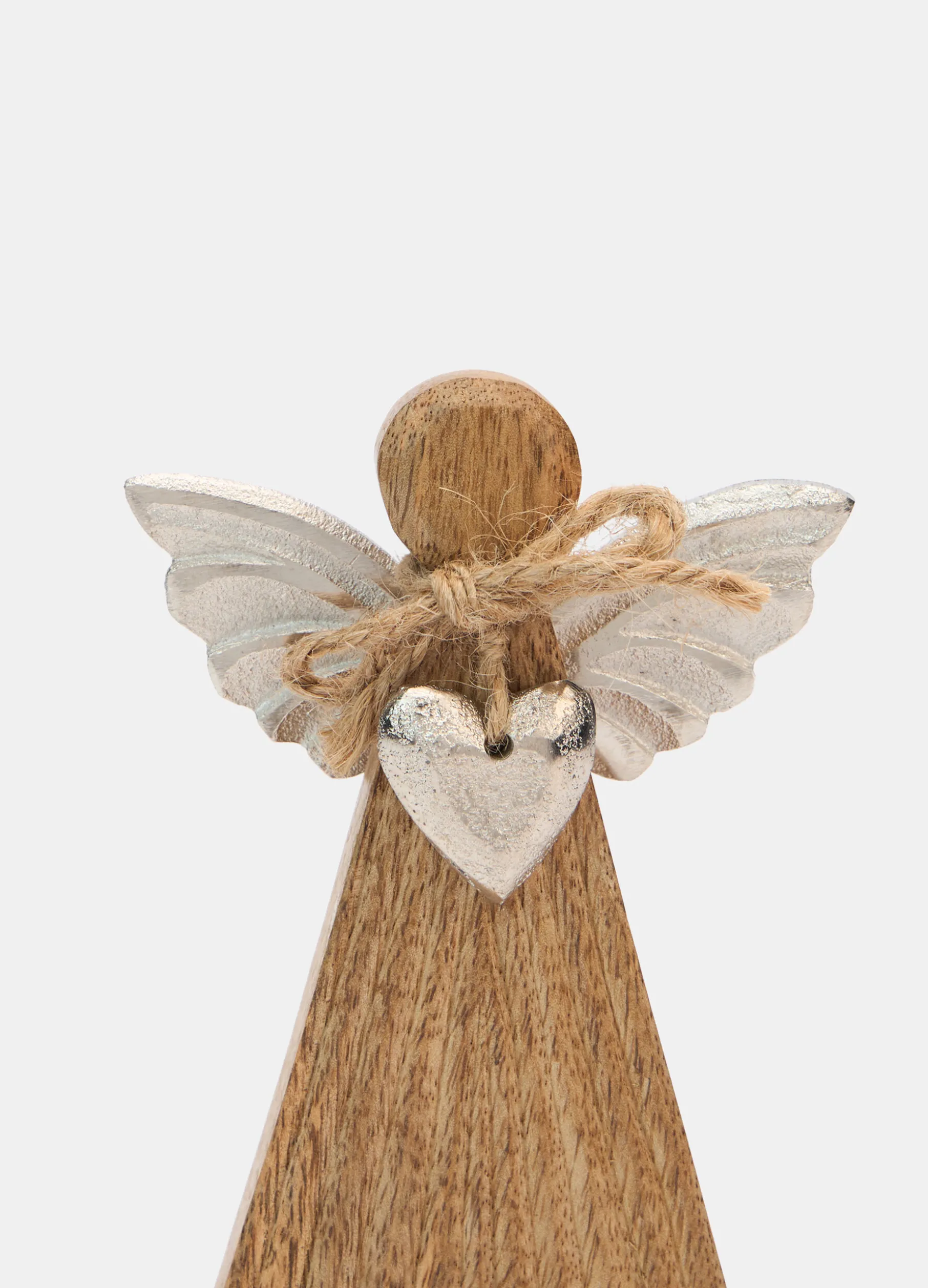 Elegante decorazione composta da una base in legno chiaro con inserto in legno a forma di angioletto, completo di ali e ciondolo a cuore in metallo, che rimanda alle atmosfere invernali e festive. Dimensioni: 10 x 17 x 5 cm.