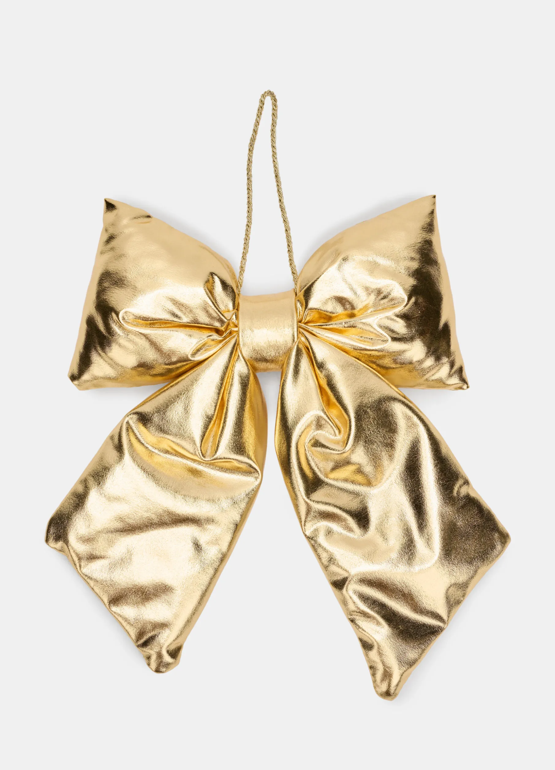 Fiocco decorativo dorato in tessuto lamè dalla caratteristica finitura metallizzata, che illumina e rallegra l’atmosfera. Completo di cordino dorato per appenderlo all’albero di Natale, alle maniglie o ai pomelli. Dimensioni: 23 x 18 cm.