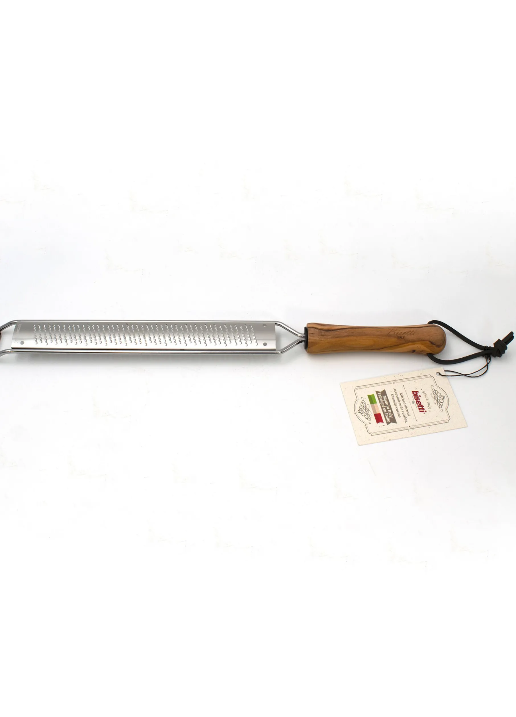 Grattugia gourmet in acciaio a fori fini con manico in legno di ulivo massello. Made in Italy. Dimensioni 39,5cm.