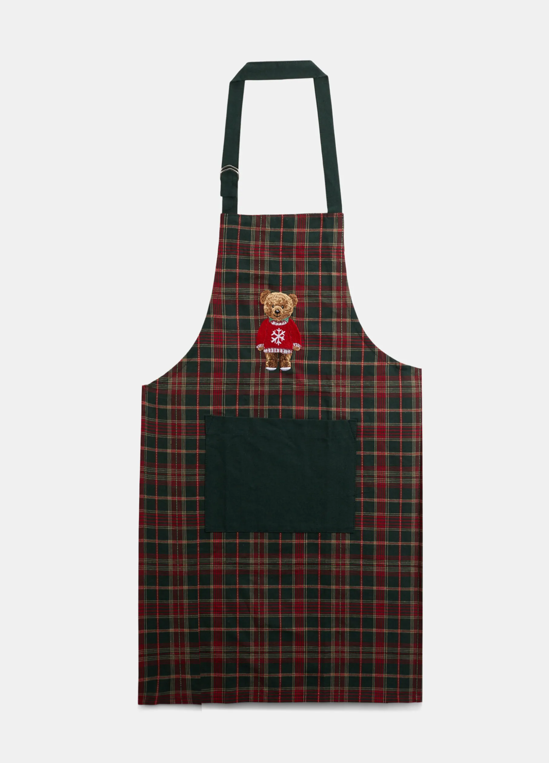 Grembiule da cucina sopra il ginocchio in puro cotone, versatile e resistente, caratterizzato dal tradizionale motivo tartan nei toni del verde scuro e del rosso, più festoso e allegro grazie all’applicazione Teddy Bear ricamata sul davanti. Con tasca frontale e fibbia regolabile al collo. Dimensioni: 70 x 50 cm.