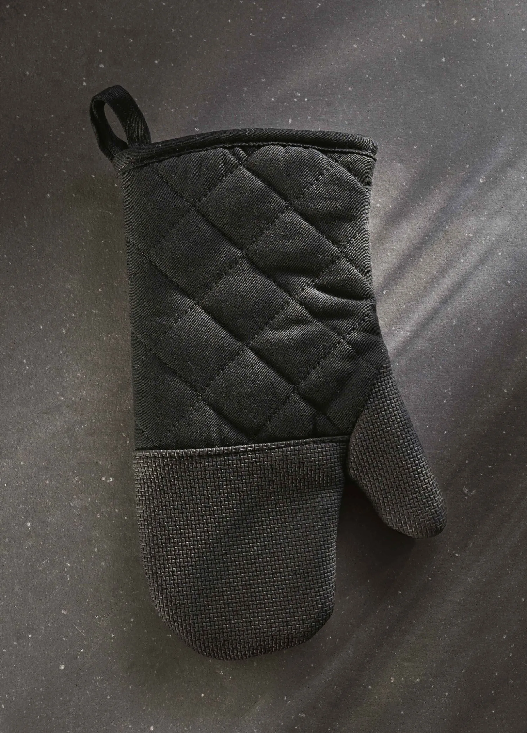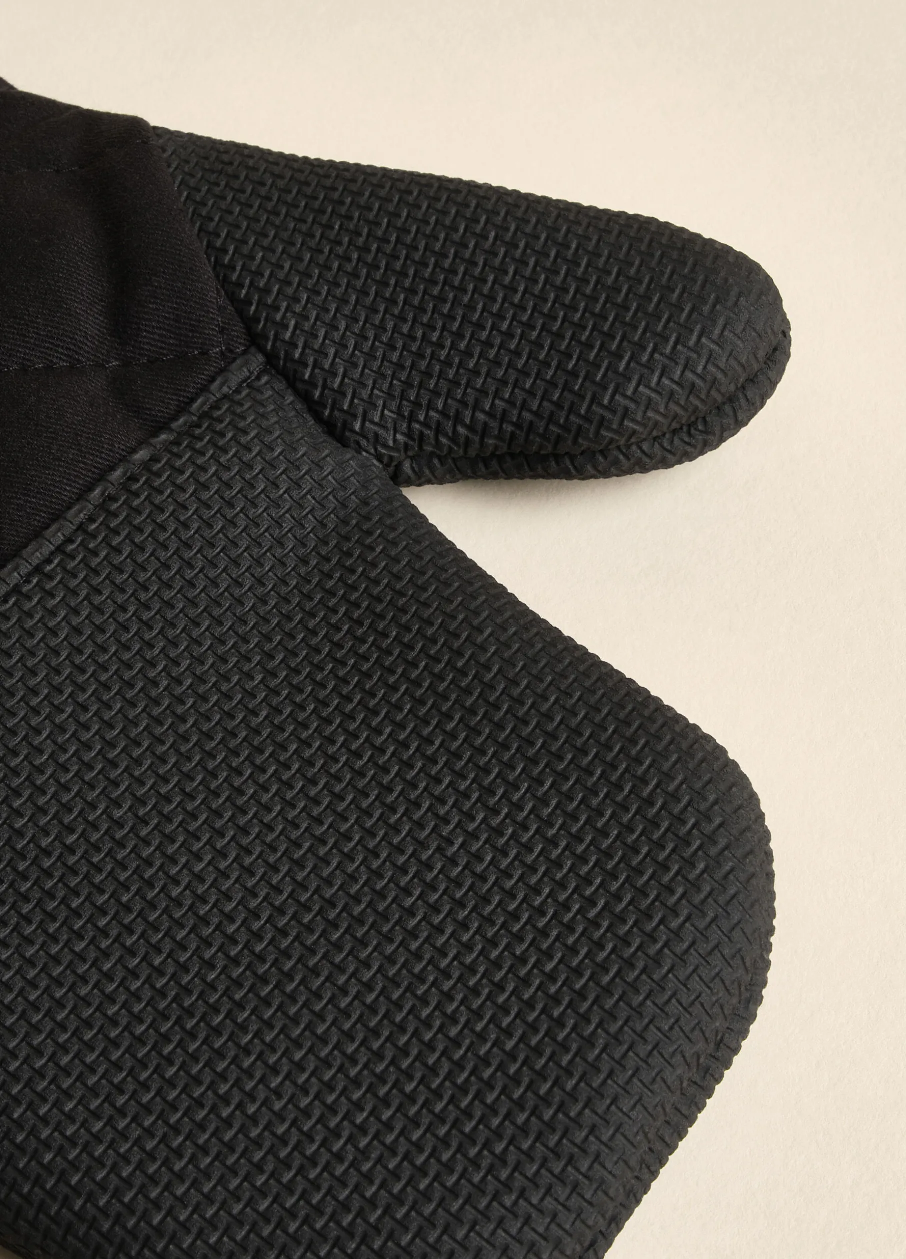Guanto da cucina nero pratico e funzionale, realizzato in un mix di cotone resistente e neoprene, un materiale impermeabile che isola dal calore, estremamente funzionale grazie anche alla texture irregolare che migliora la presa. Con laccetto per appenderlo. Dimensioni: 21 x 17,5 cm.
