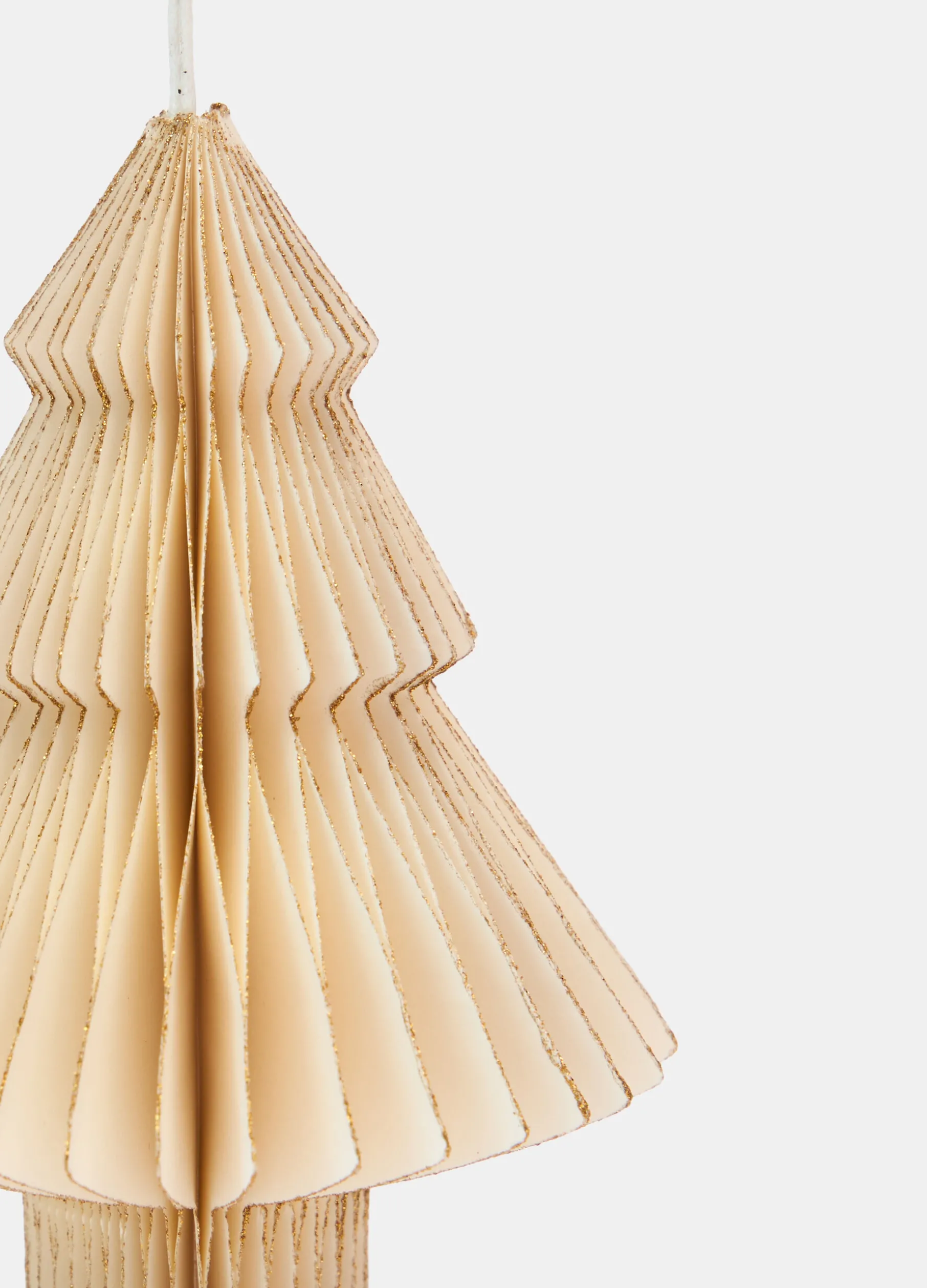 Delicato ornamento a forma di alberello da appendere all’albero di Natale o per rallegrare l’atmosfera domestica realizzato in carta giallo oro accuratamente tagliata e piegata e cosparsa di glitter. Completo di laccetto in tessuto abbinato. Altezza: 10 cm.