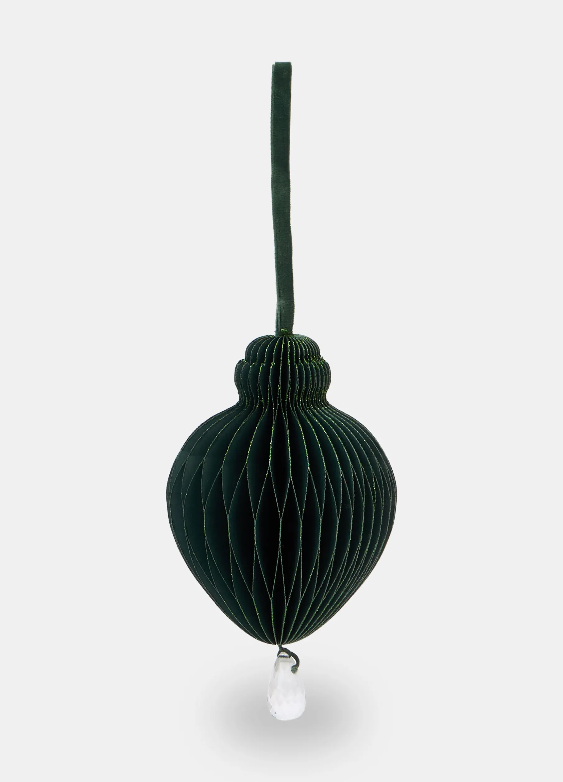 Delicato ornamento da appendere all’albero di Natale o per rallegrare l’atmosfera domestica realizzato in carta verde scuro accuratamente tagliata e piegata e cosparsa di glitter. Completo di laccetto in tessuto e perlina di vetro sul fondo. Altezza: 10 cm.