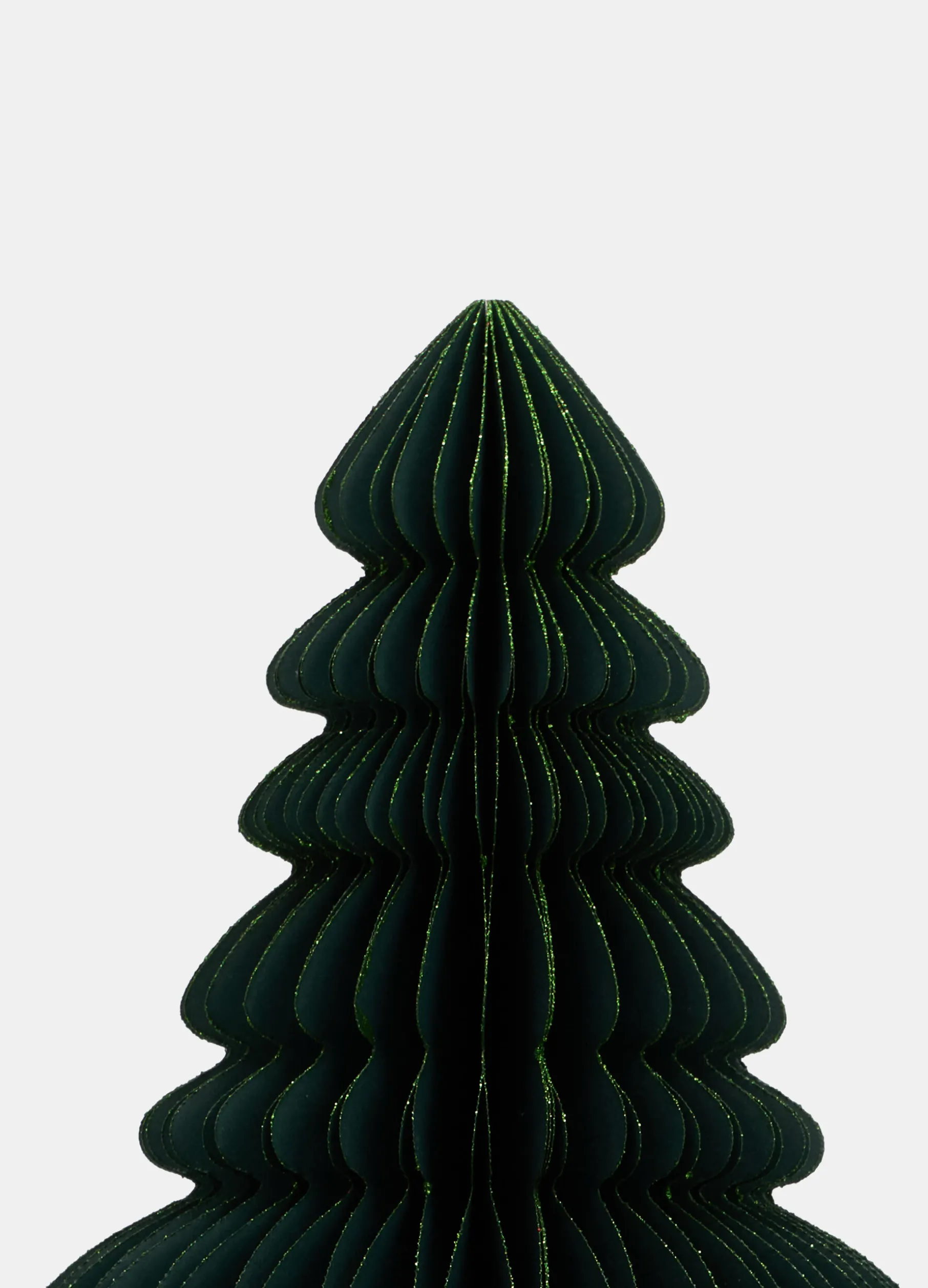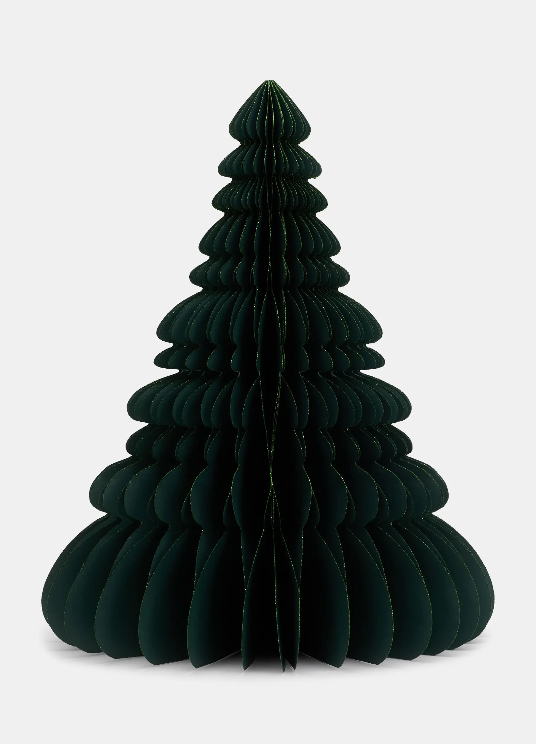 Alberello decorativo verde scuro in versione large realizzato in carta spessa e consistente, piegata e ritagliata con cura per ricreare questo simbolo delle feste. Completato da una spolverata di glitter in tono. Altezza: 40 cm.