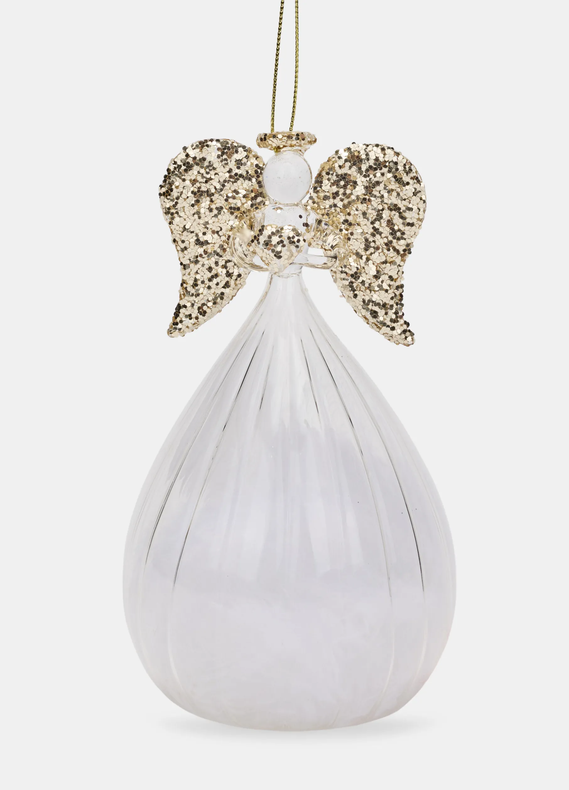 Delicato ornamento natalizio in vetro soffiato trasparente a forma di angioletto, con aureola e ali ricoperte da paillette dorate. Completo di cordino per appenderlo all’albero di Natale, alle maniglie o ai pomelli. Altezza: 15 cm; diametro: 8,5 cm.