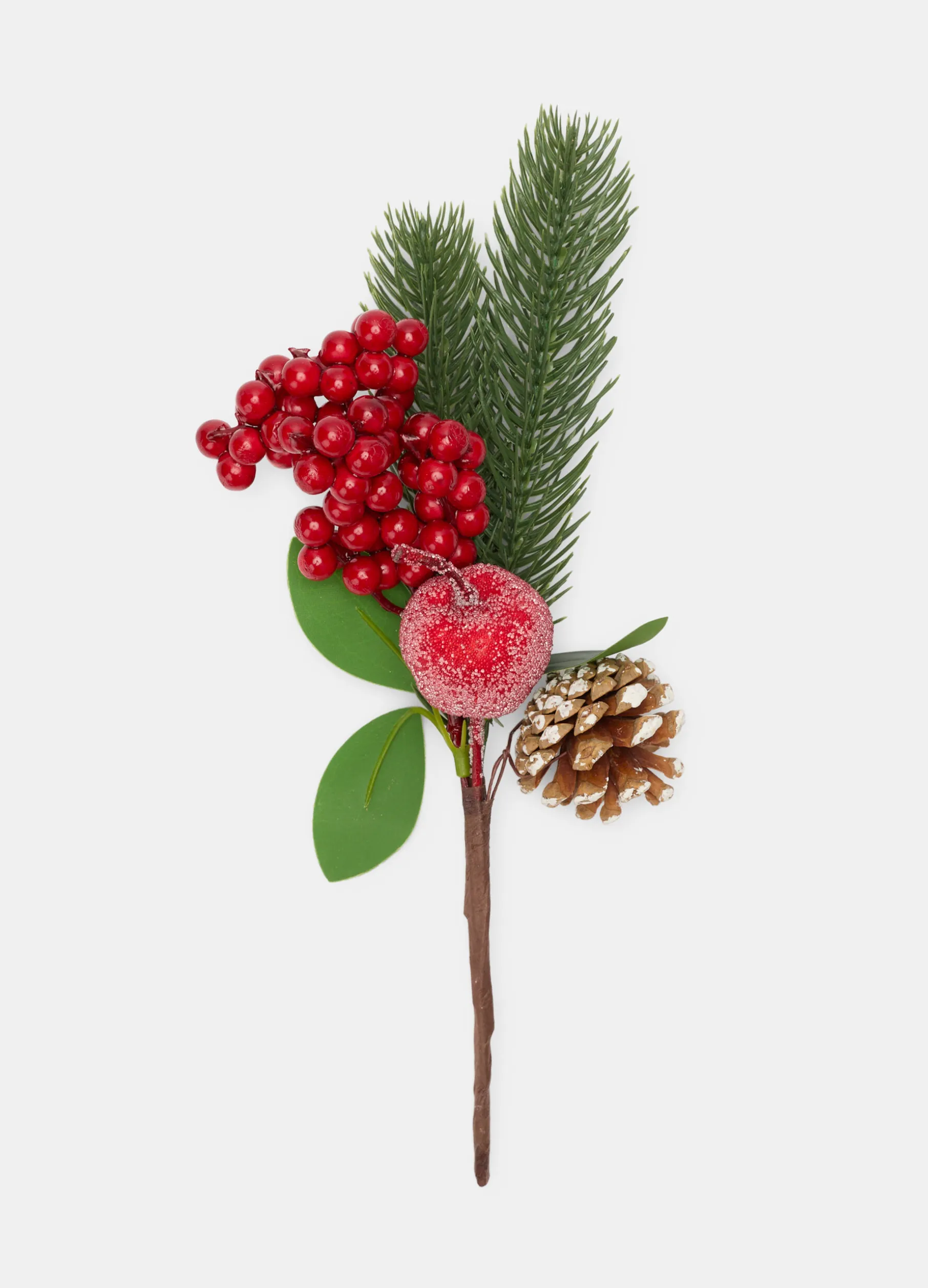 Allegro ornamento, perfetto per arricchire l’albero di Natale o gli altri ambienti della casa, composto da un ramoscello verde di pino, bacche rosso intenso, una pigna e una mela innevata. Dimensioni: 26 x 10 x 10 cm.