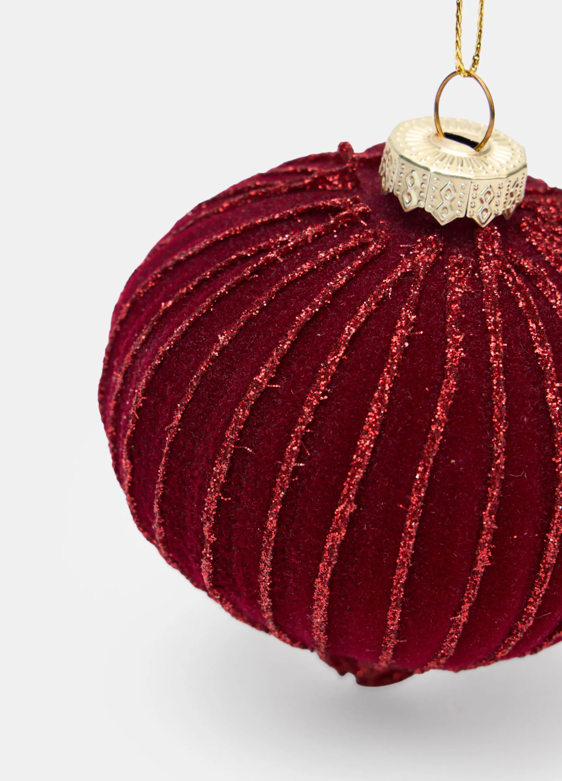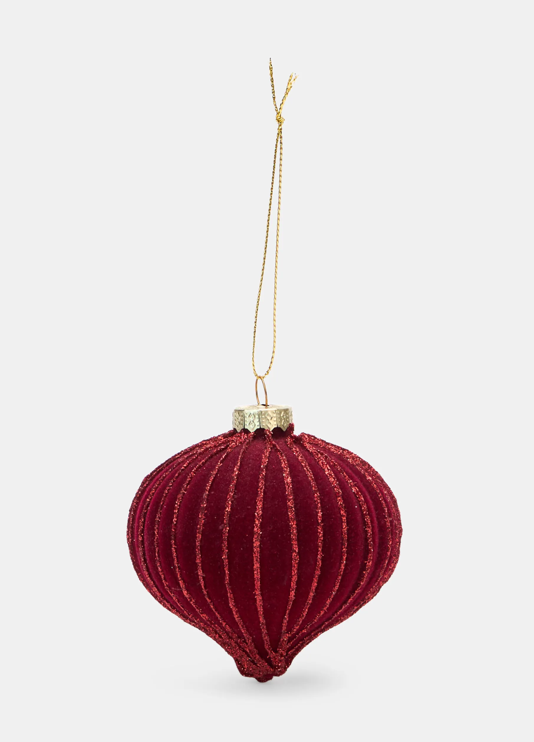 Pallina decorativa a goccia in vetro, completa di cordino per appenderla all’albero di Natale, rivestita in morbido velluto di colore bordeaux. Arricchita da profili glitterati lungo le scanalature. Diametro: 8 cm.