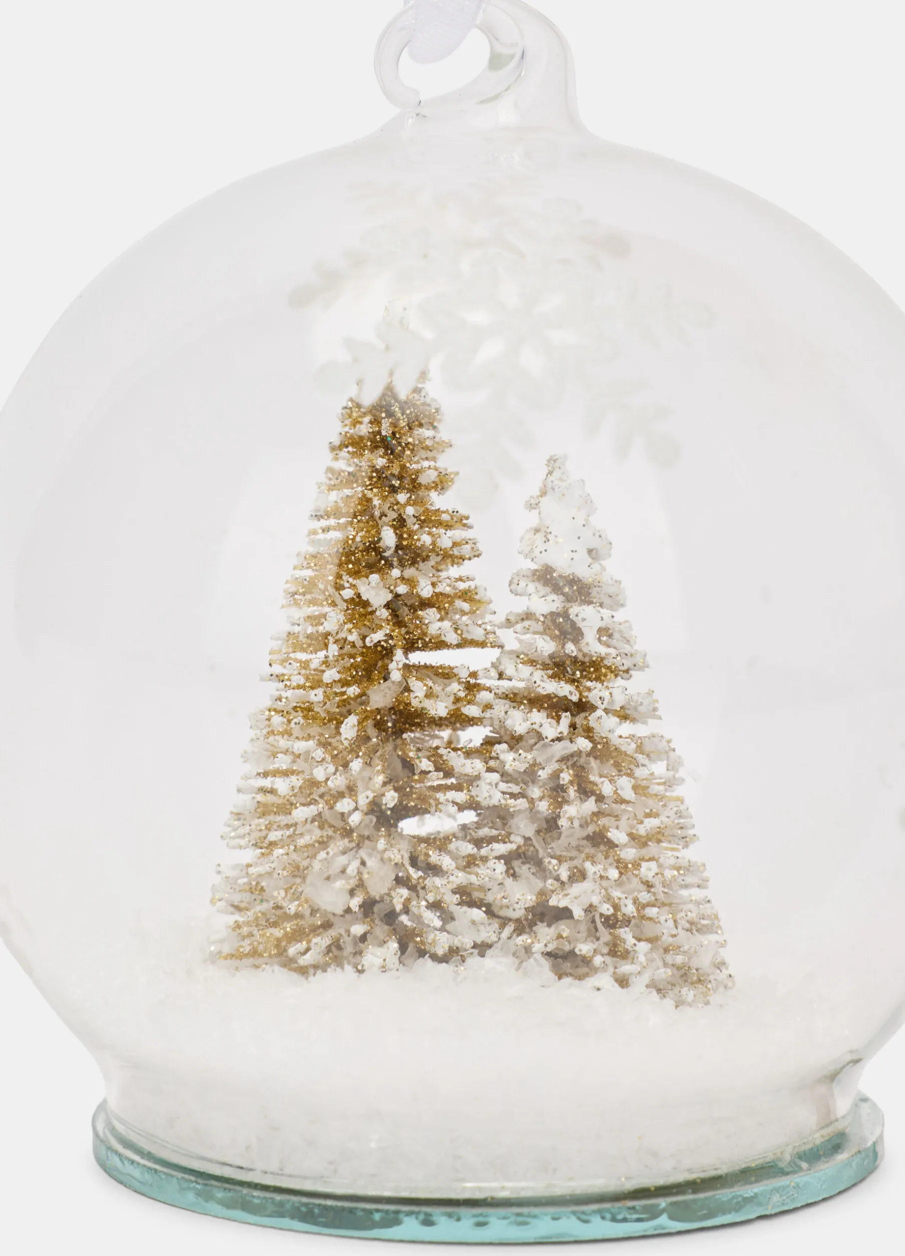 Decorazione natalizia stile palla di neve in vetro trasparente con abeti innevati, completa di cordino in tessuto per appenderla all’albero di Natale. Diametro: 8 cm.