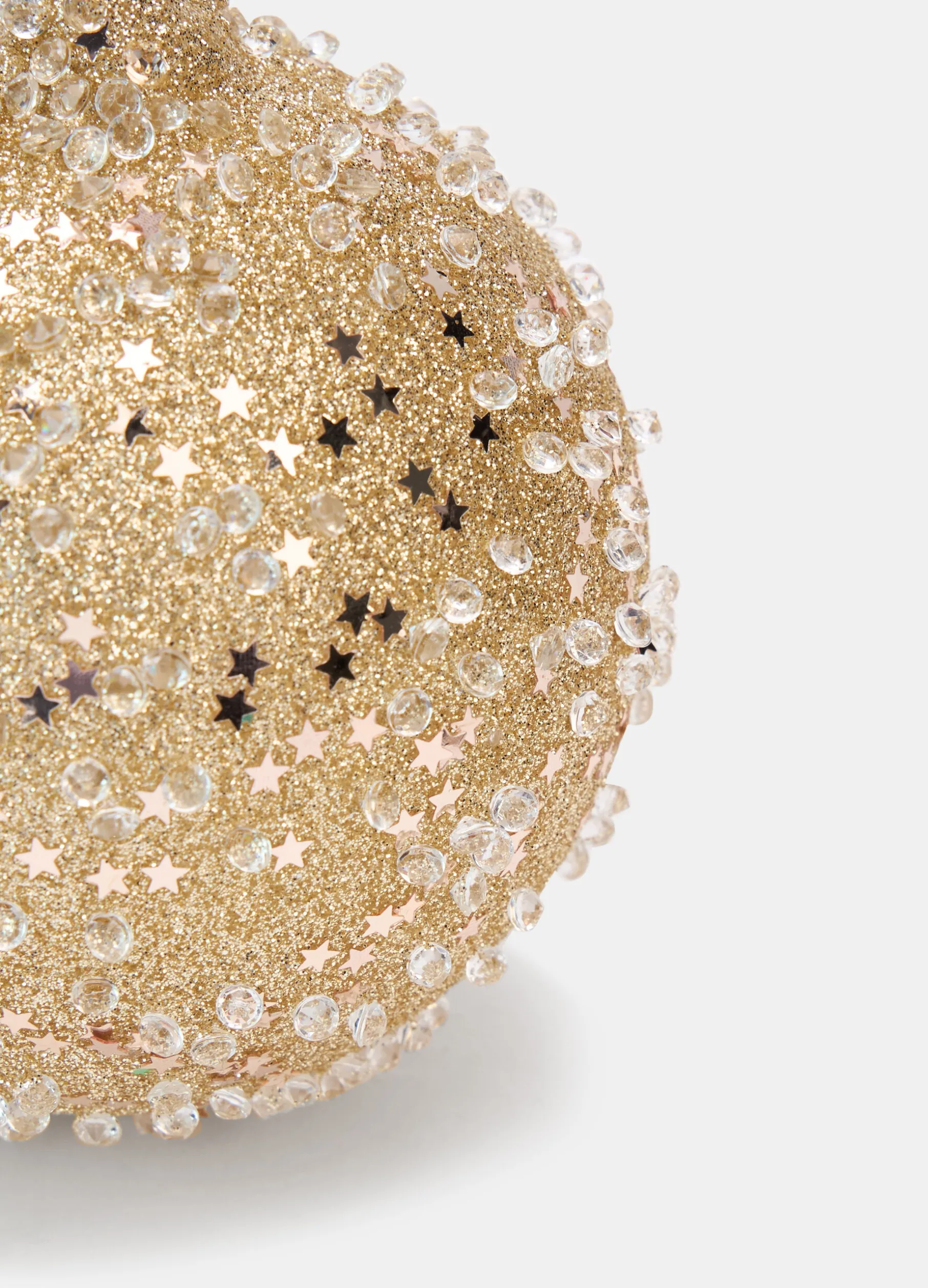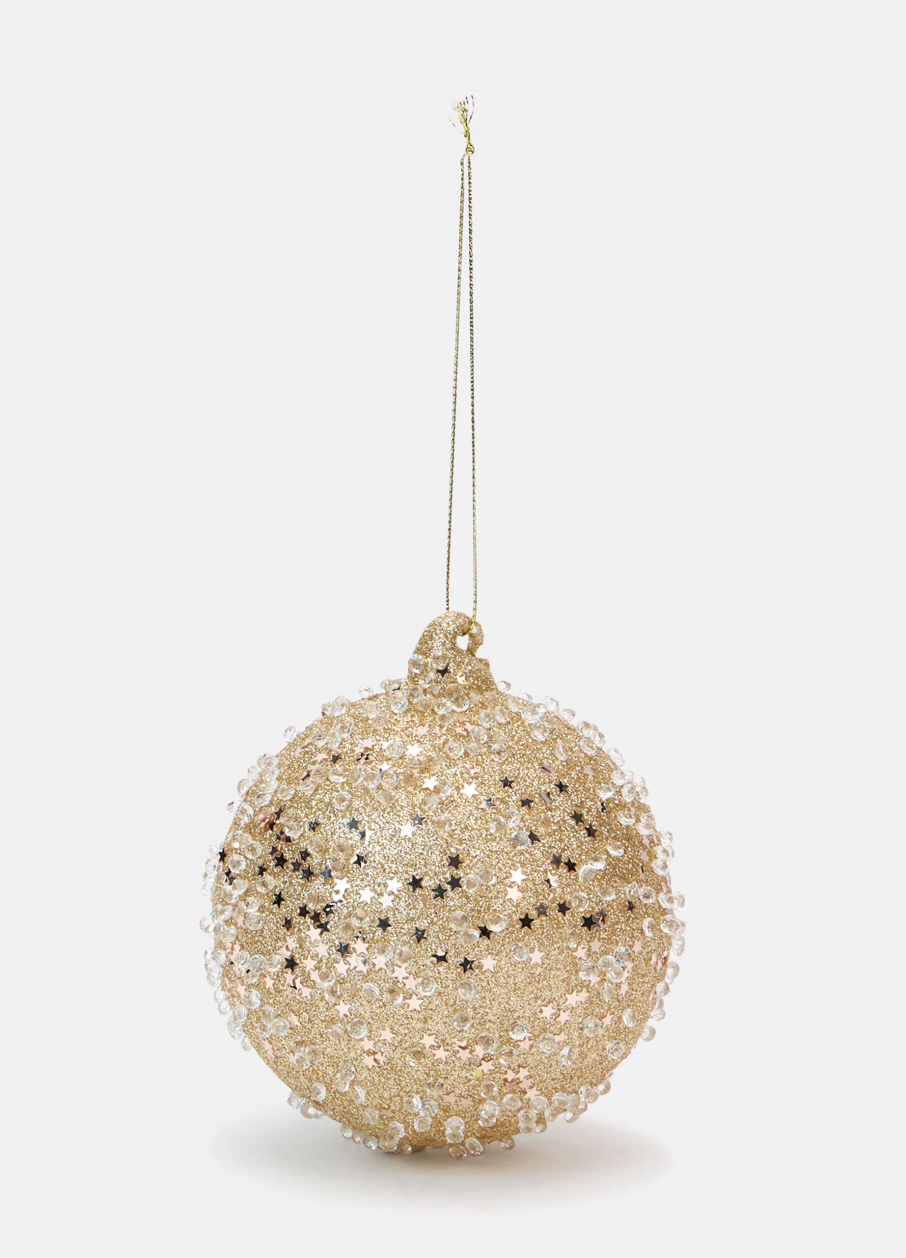 Pallina decorativa in vetro, completa di cordino per appenderla all’albero di Natale, ricoperta di glitter dorato, stelline e delicate perline in vetro trasparente. Diametro: 10 cm.
