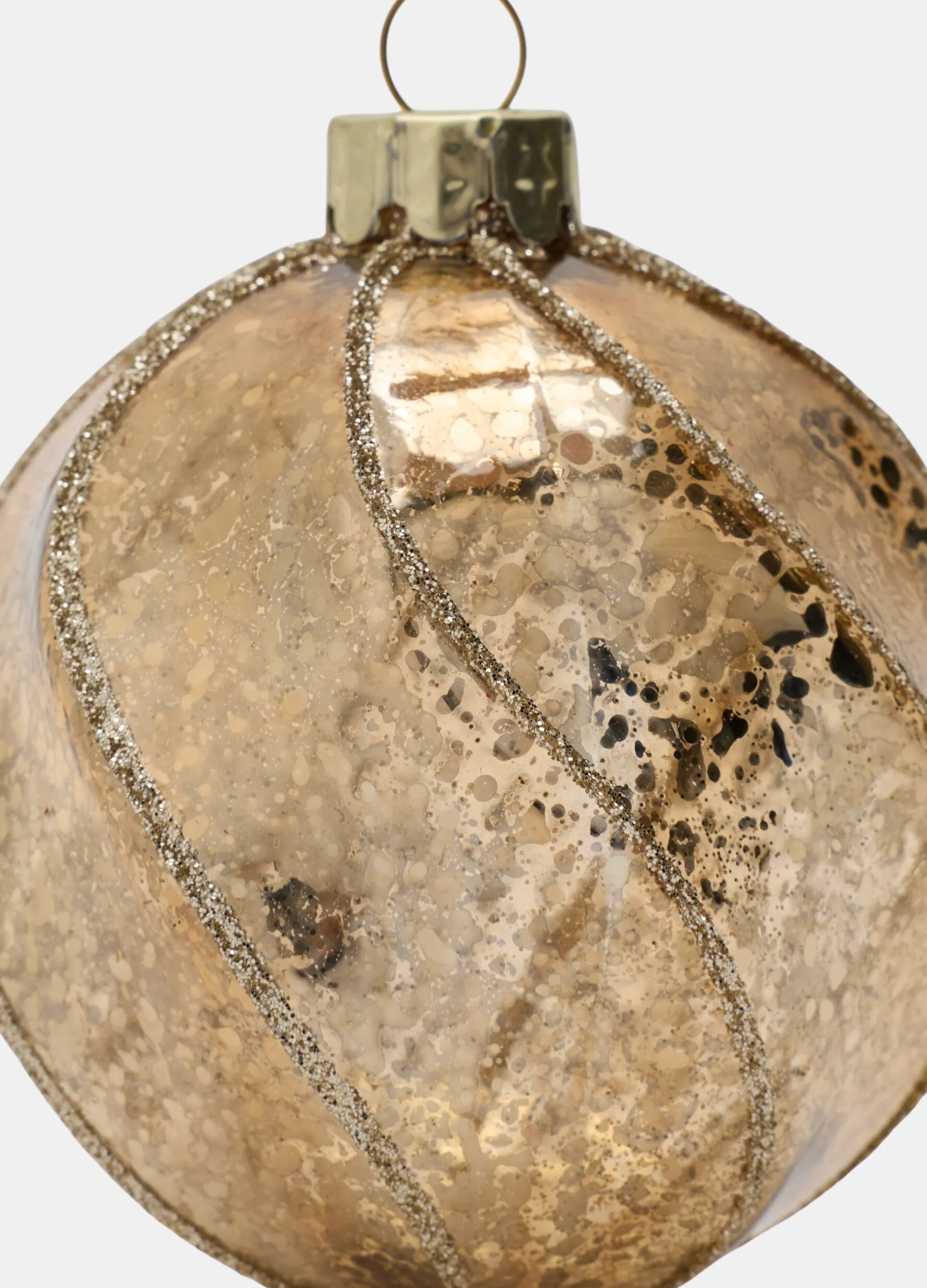 Elegante pallina decorativa in vetro dipinto con tinte seppia e trattato per ottenere un effetto anticato. Completata da sottili strisce glitterate a spirale e dal cordino per appenderla all’albero di Natale. Diametro: 8 cm.
