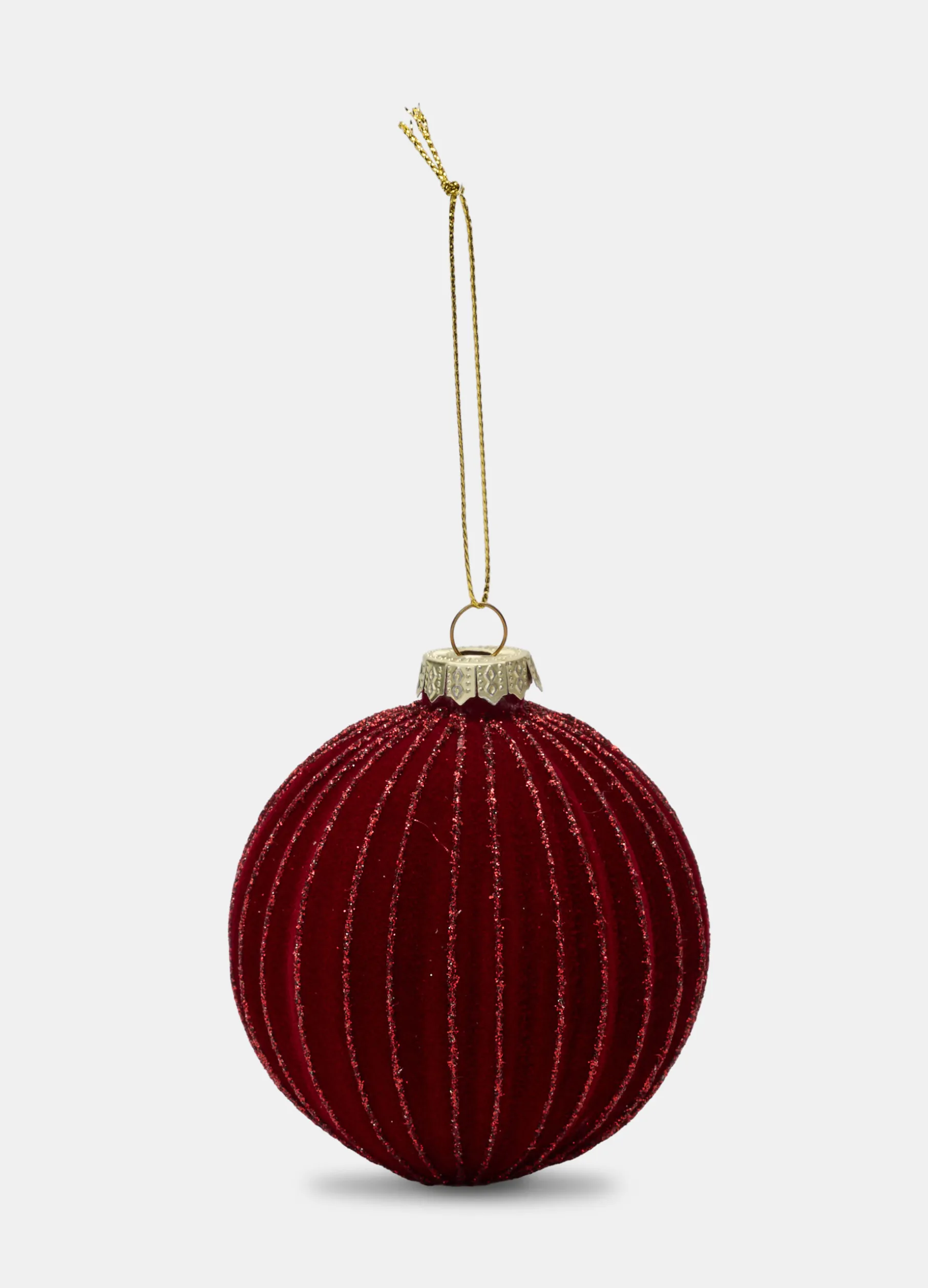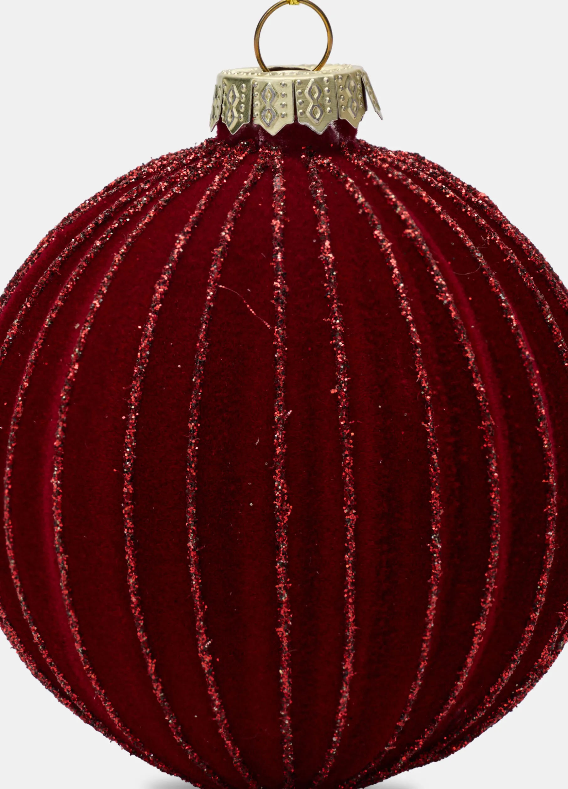 Pallina decorativa in vetro, completa di cordino per appenderla all’albero di Natale, rivestita in morbido velluto di colore bordeaux. Arricchita da profili glitterati lungo le scanalature. Diametro: 8 cm.
