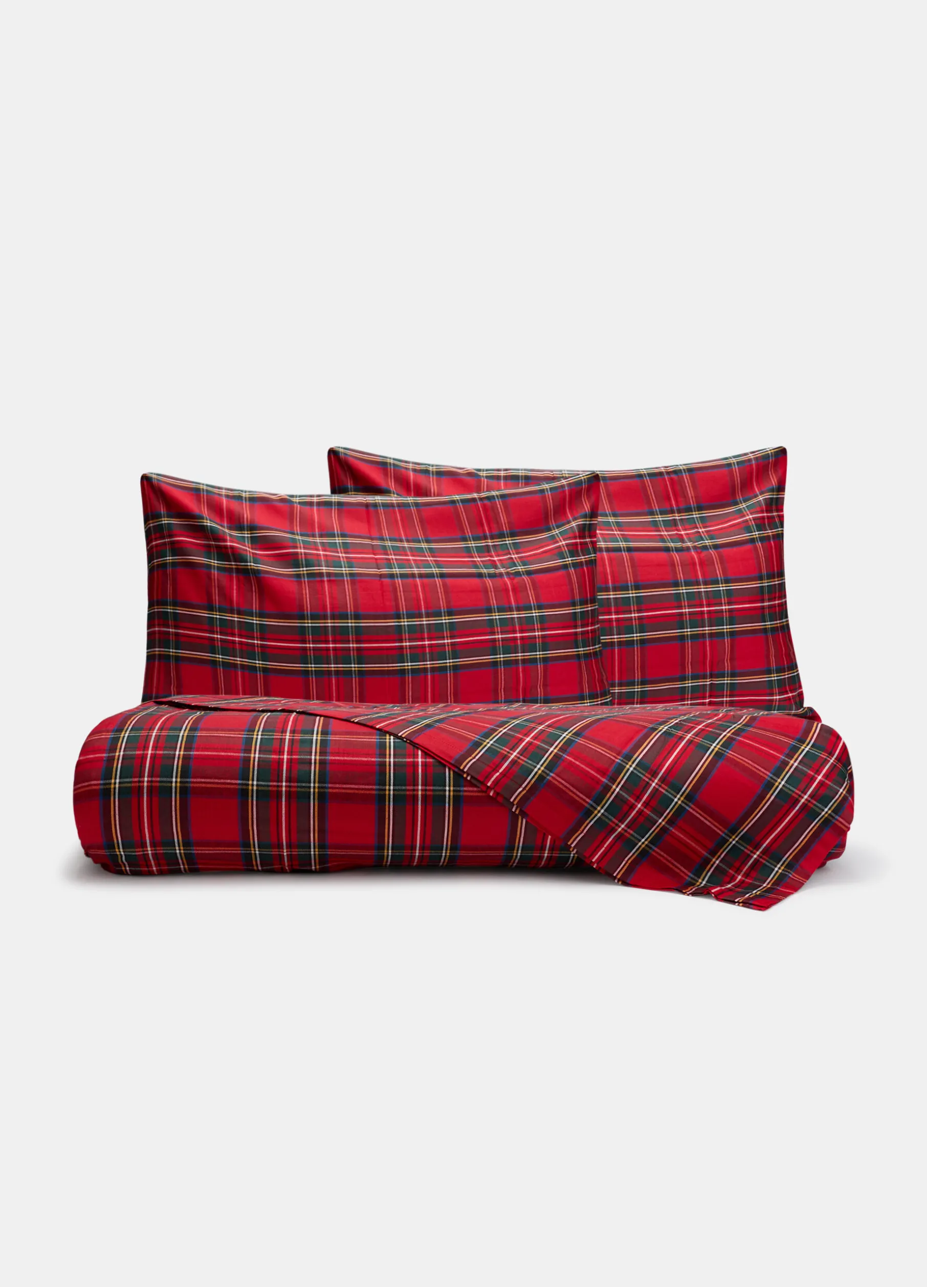 Set con copripiumino e federe per letto matrimoniale a due piazze in puro cotone tinto filo: la particolare tecnica di colorazione permette di creare il motivo a scacchi rossi intrecciando fili di tonalità diverse. Composta da copripiumino 200 x 250 cm e due federe 50 x 80 cm.