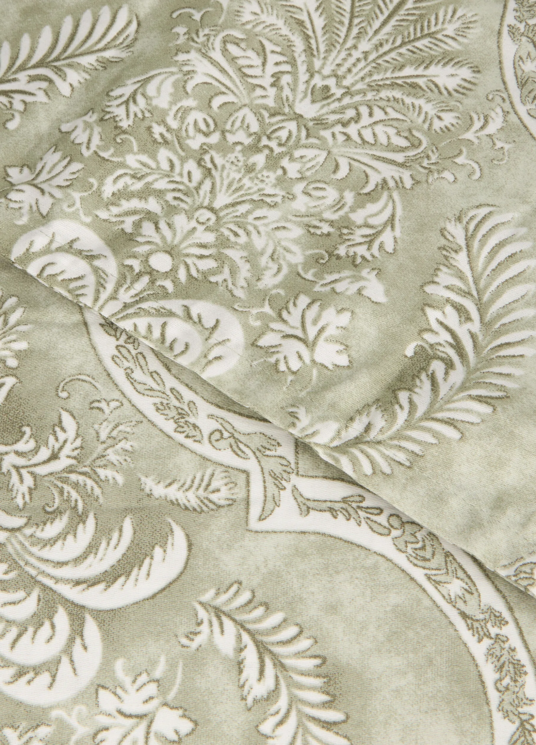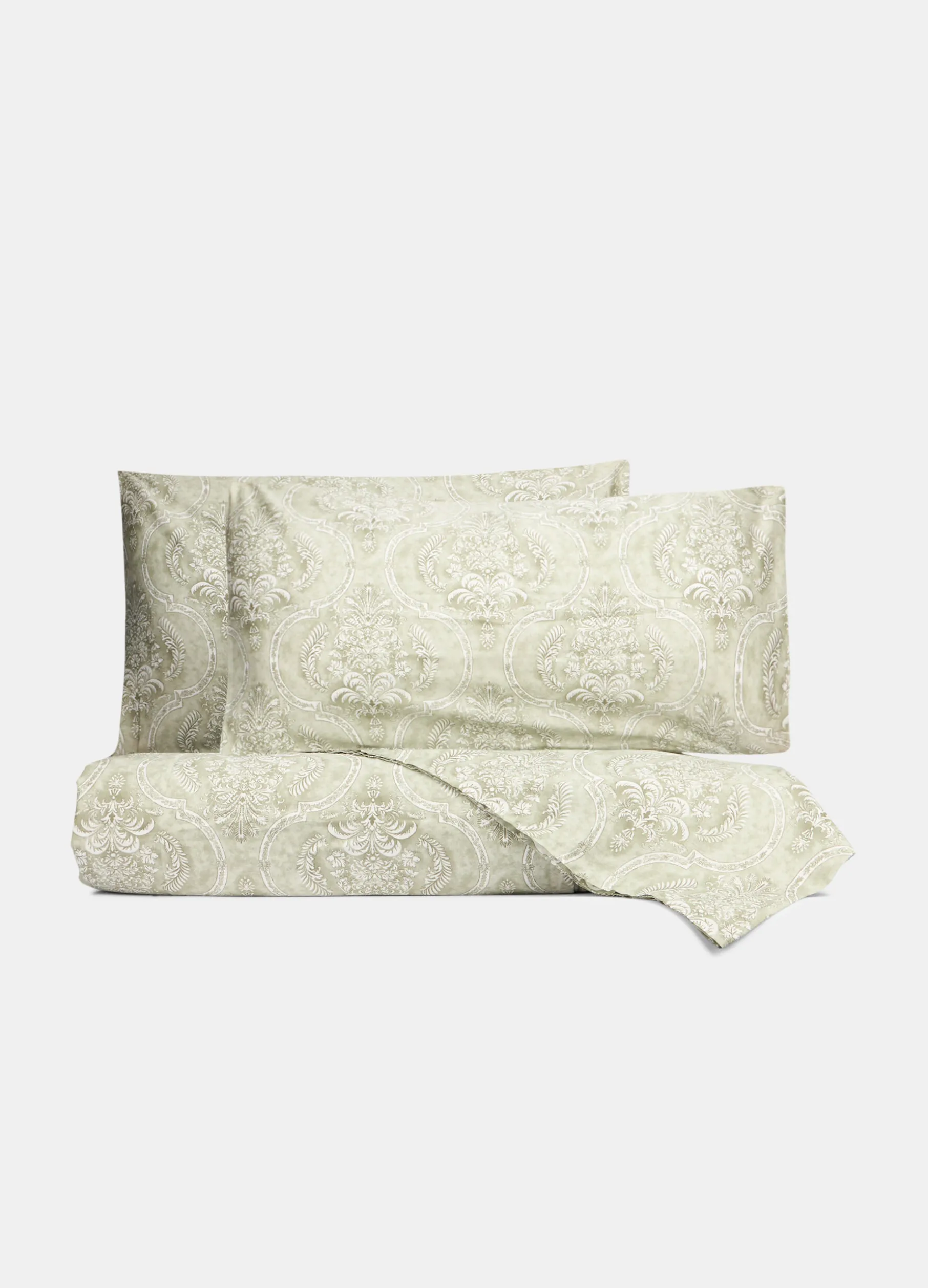 Elegante parure letto con federe e copripiumino a due piazze, realizzata in puro raso di cotone: il filato è intessuto con una speciale tecnica che lo rende più liscio e scorrevole, esaltando i colori. La stampa riprende decori classici su fondo verde chiaro. Composta da copripiumino 250 x 200 cm e due federe 50 x 80 cm.