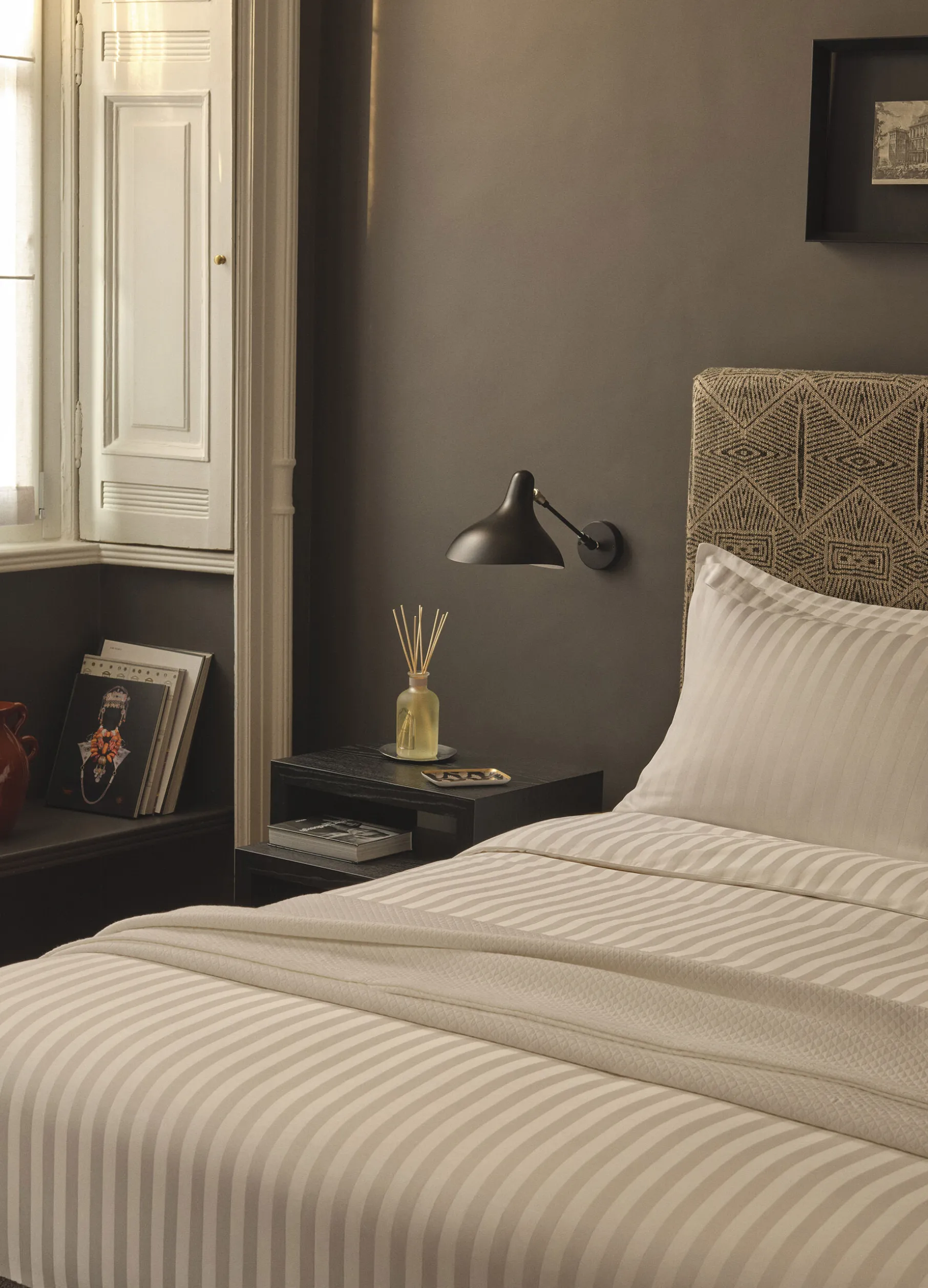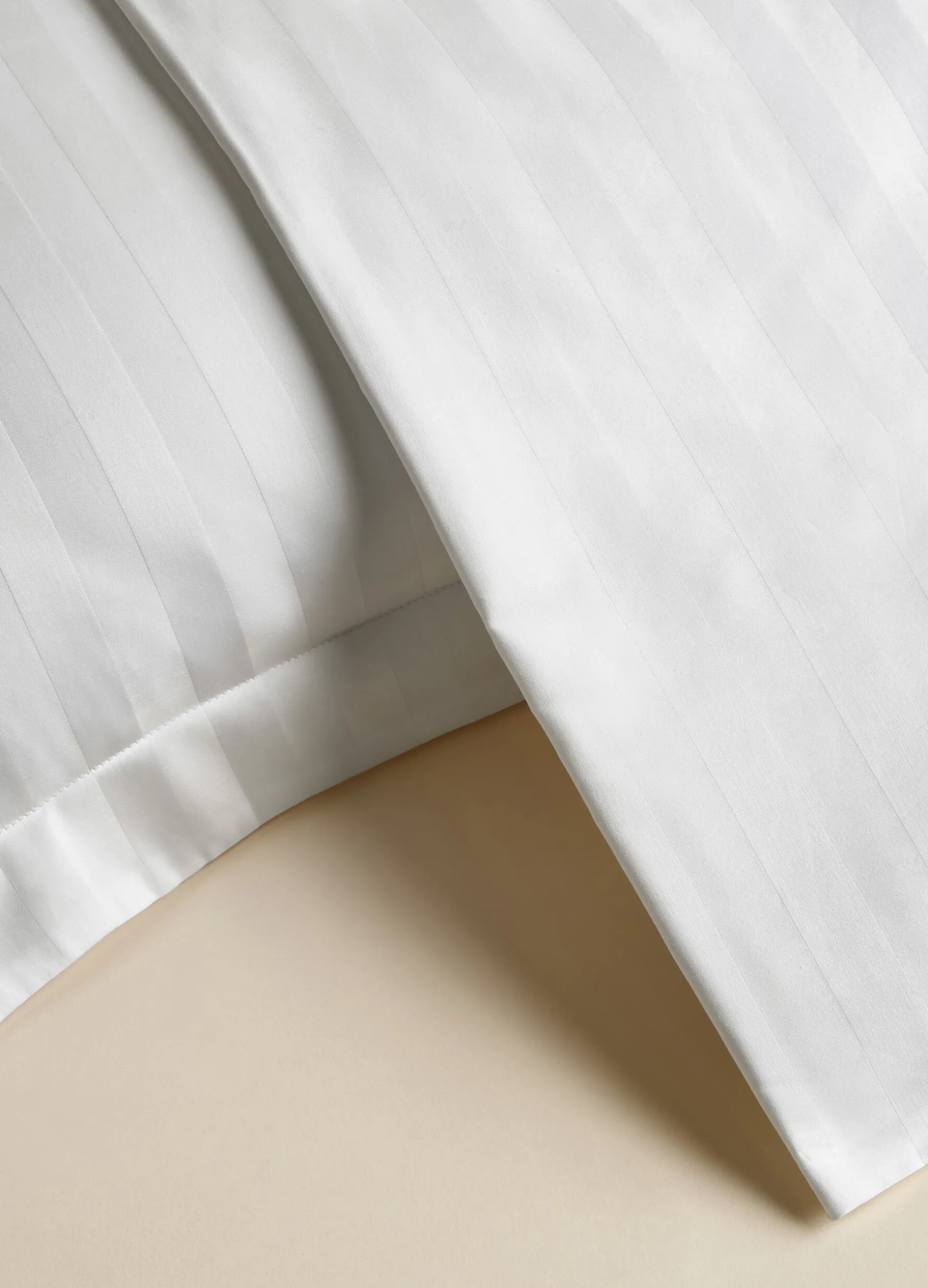 Parure per letto singolo con copripiumino bianco candido realizzato in puro raso di cotone, dalla superficie liscia e fresca, arricchito da righe jacquard tono su tono. Composta da copripiumino 200 x 150 x 40 cm e una federa 50 x 80 cm.