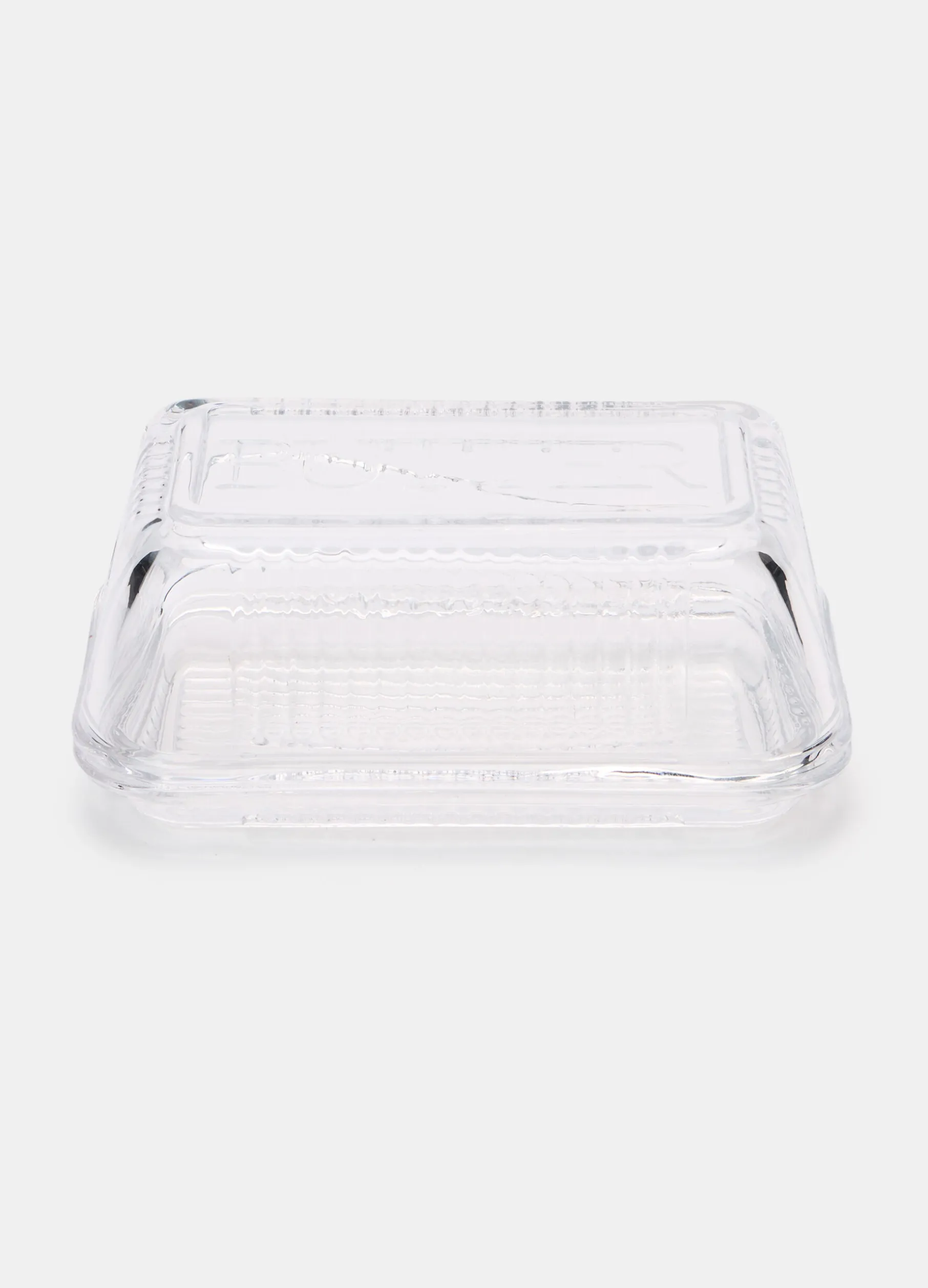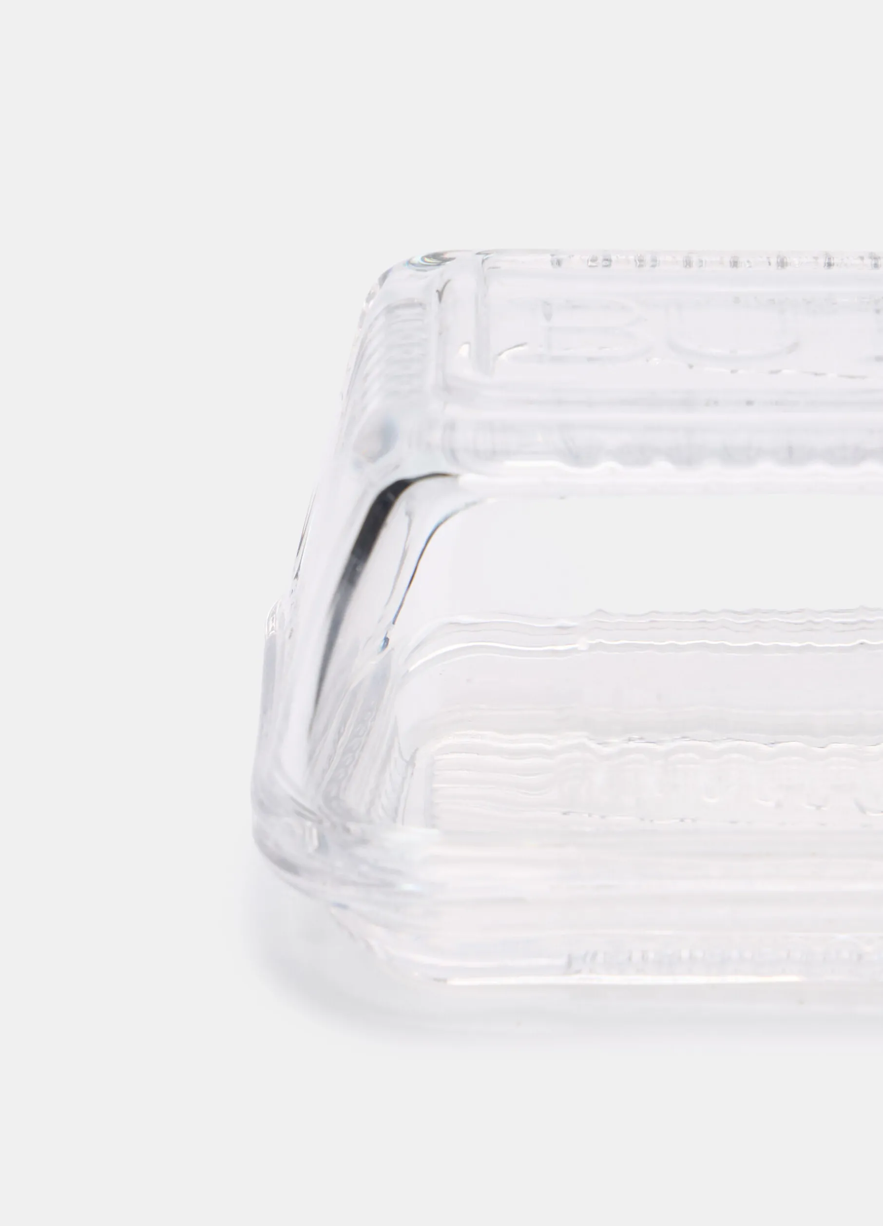 Piattino da burro rettangolare in vetro trasparente con coperchio abbinato, un dettaglio ricercato che arricchisce con semplicità il look della cucina. Dimensioni: 10,2 x 16,9 x 7,8 cm.