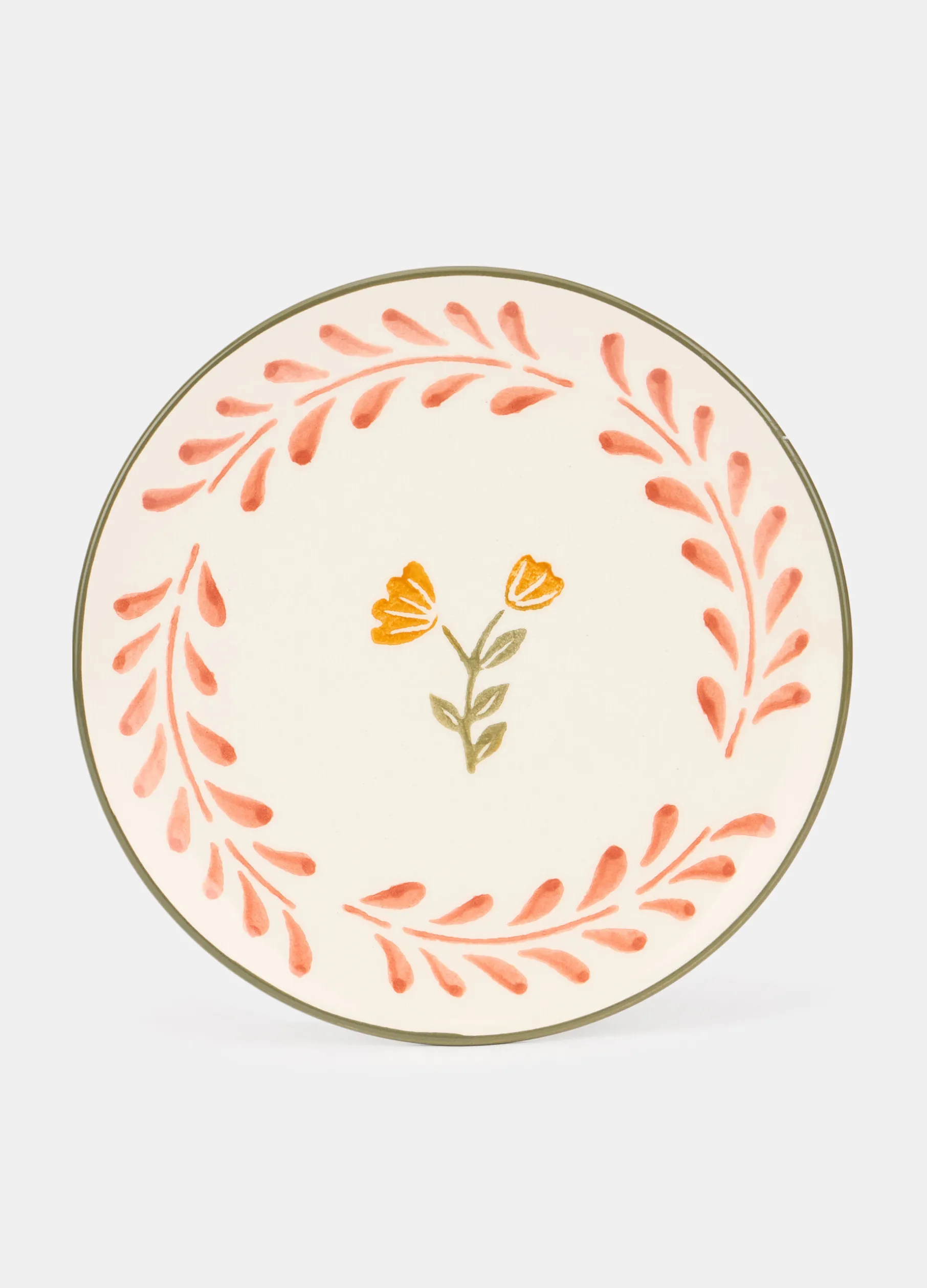 Piattino da dessert realizzato in ceramica spessa e resistente dalla ricercata colorazione bianco avorio. La decorazione floreale in tonalità a contrasto è completata dal bordo verde che segna il profilo. Diametro: 21 cm.