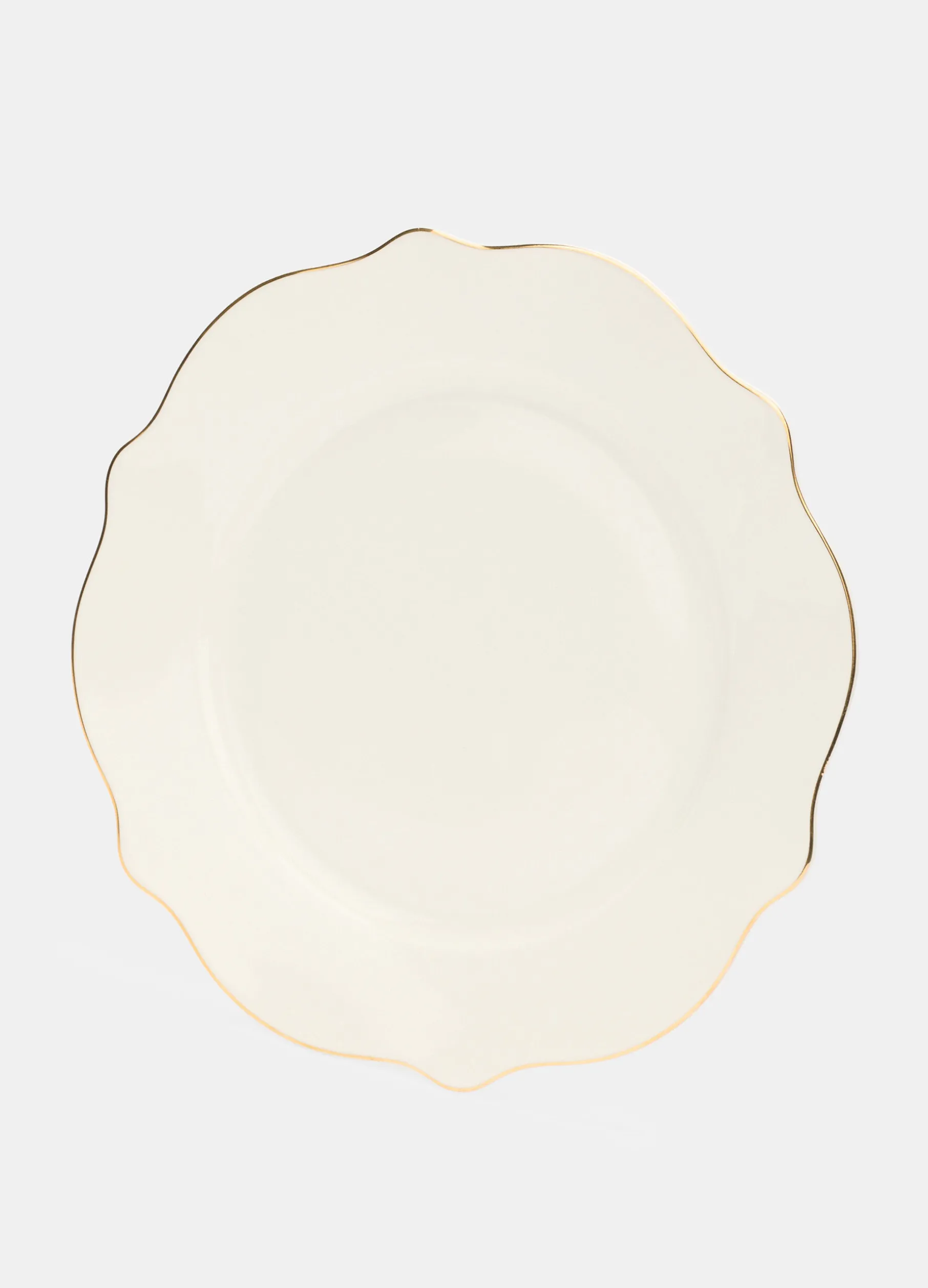 Piatto piano con bordo ondulato, parte del servizio tavola coordinato, realizzato in porcellana bone china, caratterizzata dalla colorazione avorio, maggiore resistenza e un aspetto leggermente traslucido. Completato da profili dorati. Diametro: 36 cm.