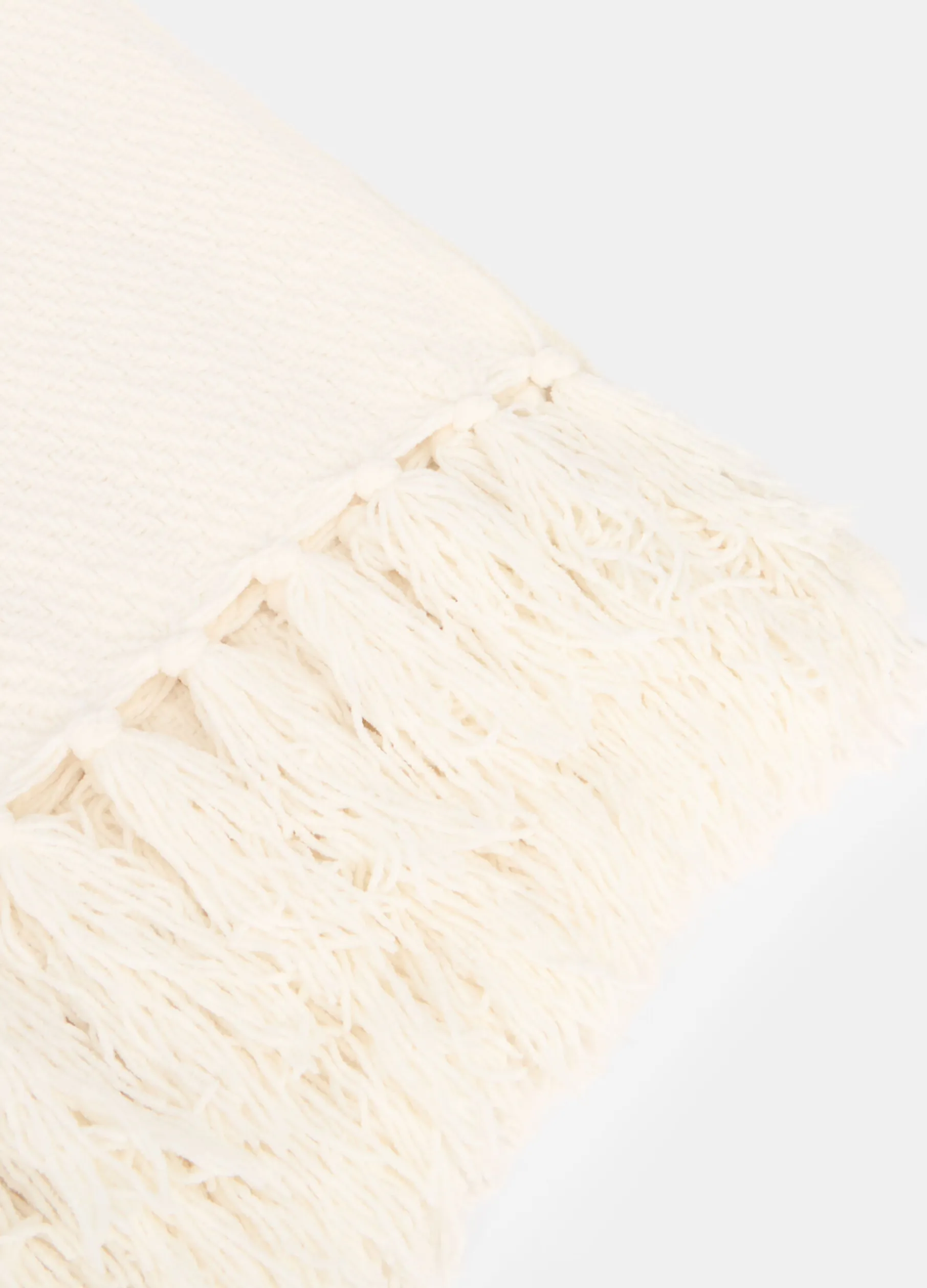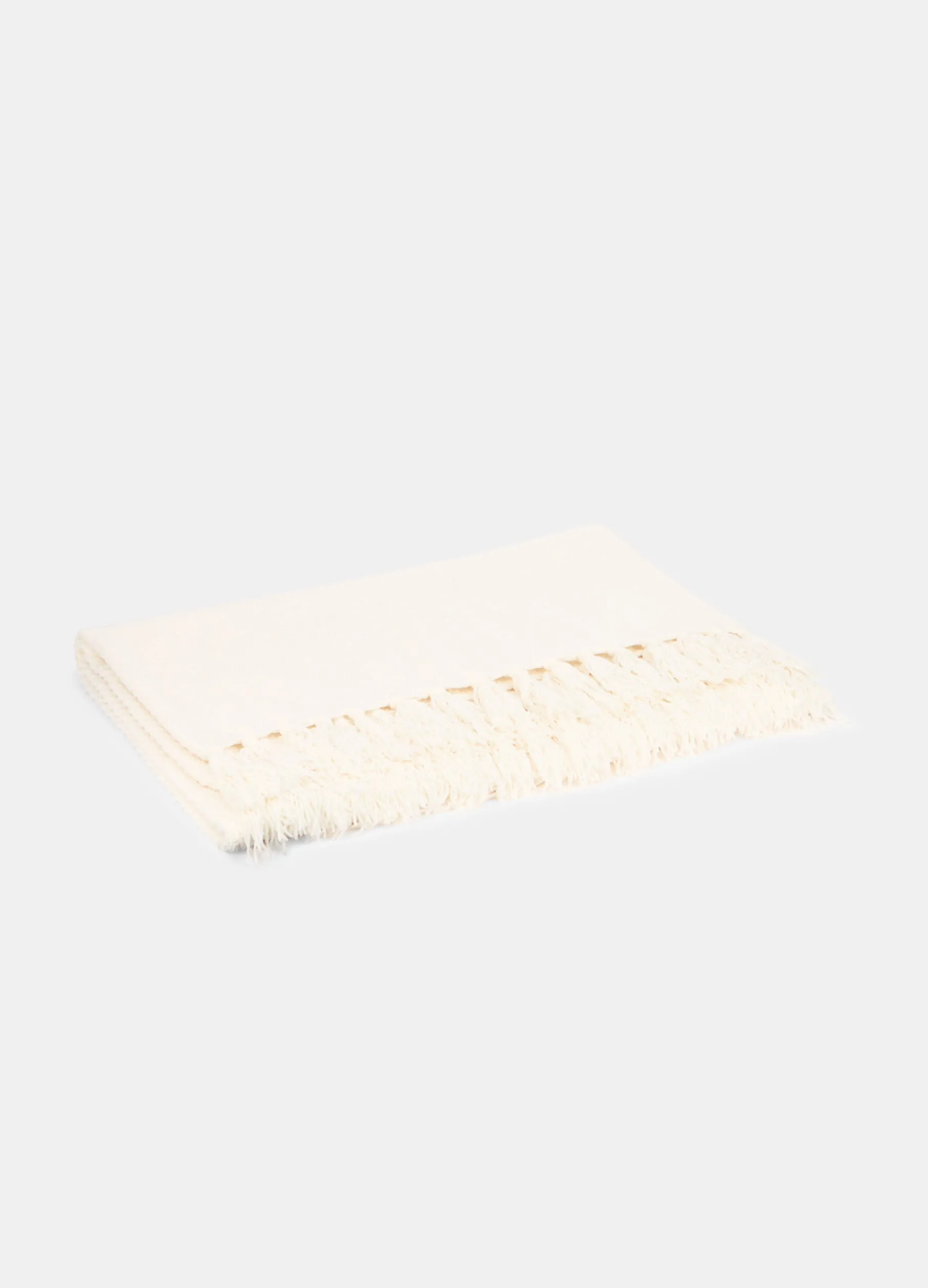 Plaid leggero e avvolgente in tessuto bianco avorio, caratterizzato da una particolare texture intrecciata che crea un effetto quasi tridimensionale. Completato da frange annodate sui lati corti. Dimensioni: 152 x 127 cm.
