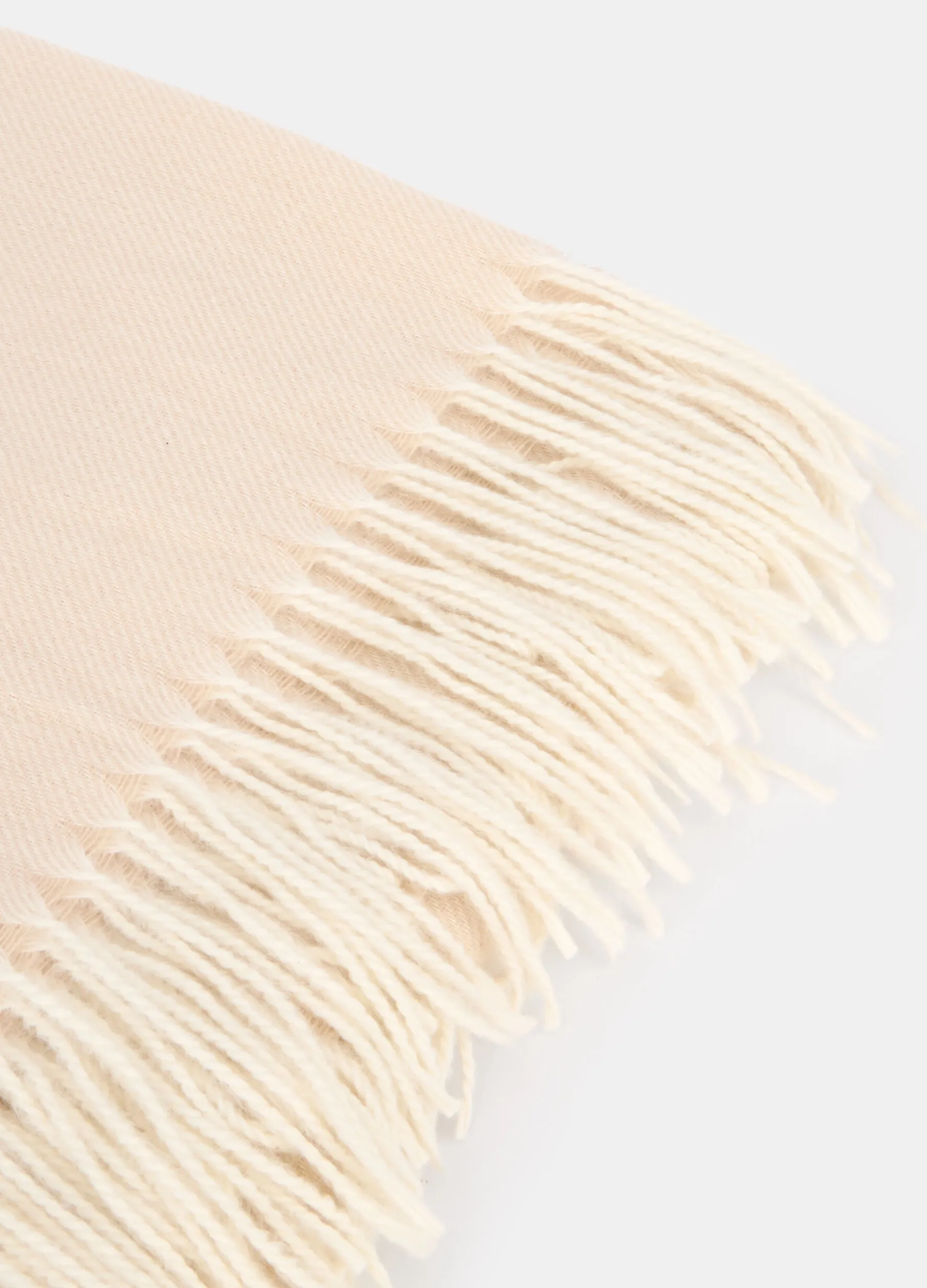 Plaid leggero e soffice, realizzato in tessuto beige chiaro leggermente vaporoso e avvolgente e caratterizzato dal motivo diagonale visibile su tutta la superficie. Completato da frange bianche attorcigliate sui lati corti. Dimensioni: 160 x 130 cm.