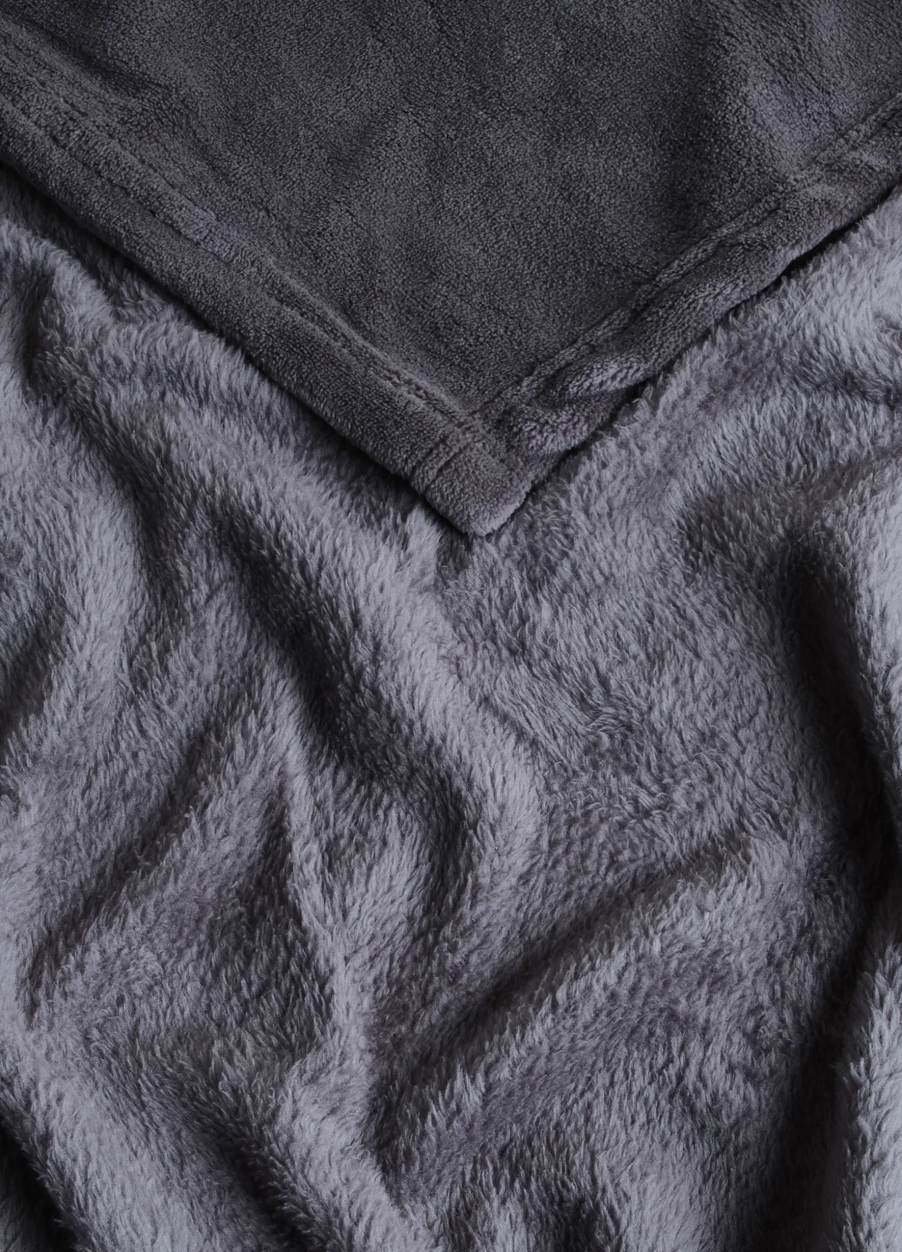 Morbido plaid realizzato in pile grigio antracite. Il materiale è soffice e avvolgente, perfetto per garantire comfort e calore.