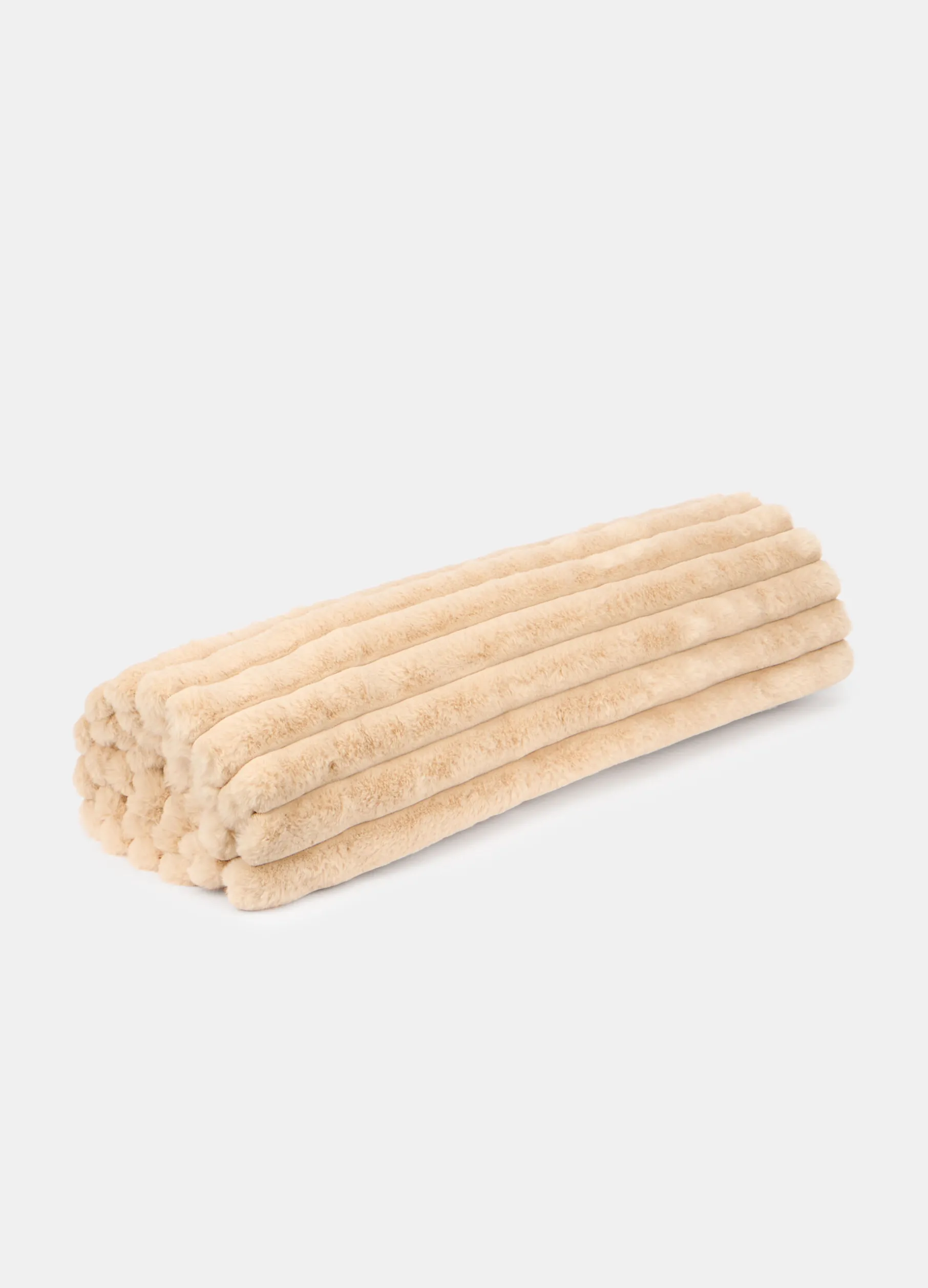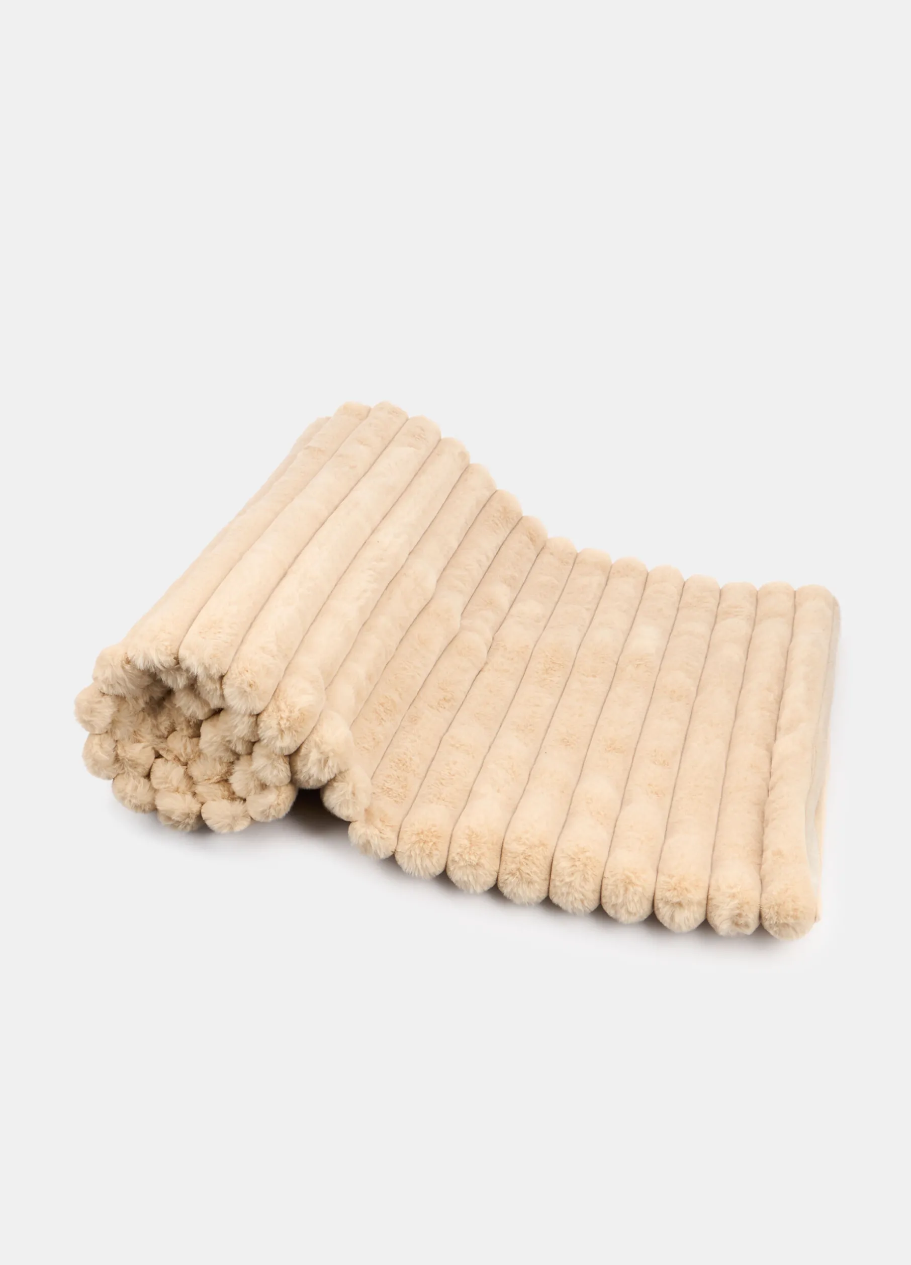 Plaid rettangolare, perfetto per la camera da letto o per rendere più accogliente il salotto, realizzato in soffice e caldo peluche beige chiaro, caratterizzato da una trapuntatura orizzontale. Dimensioni: 160 x 130 cm.