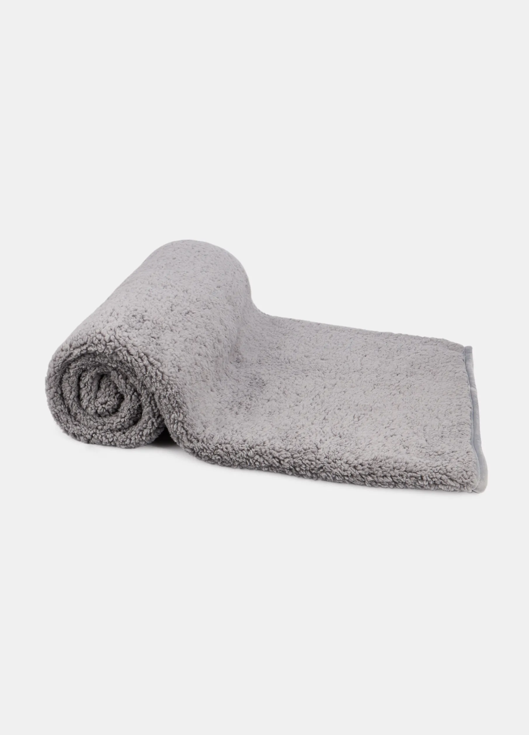 Plaid o coperta per letto singolo, realizzata in un particolare tessuto tecnico grigio scuro che riproduce la caratteristica texture dello shearling, calda e avvolgente. Dimensioni: 170 x 130 cm.