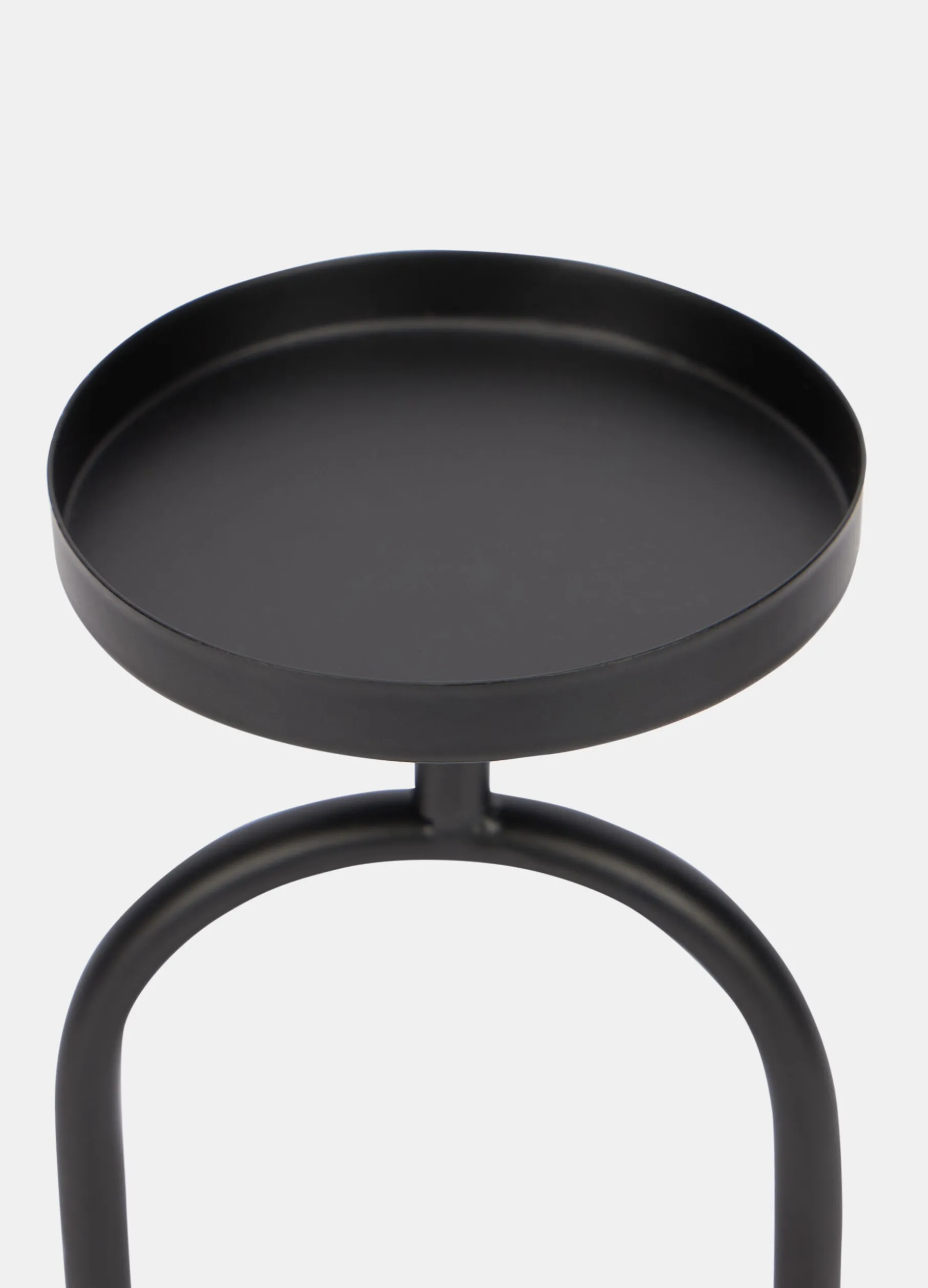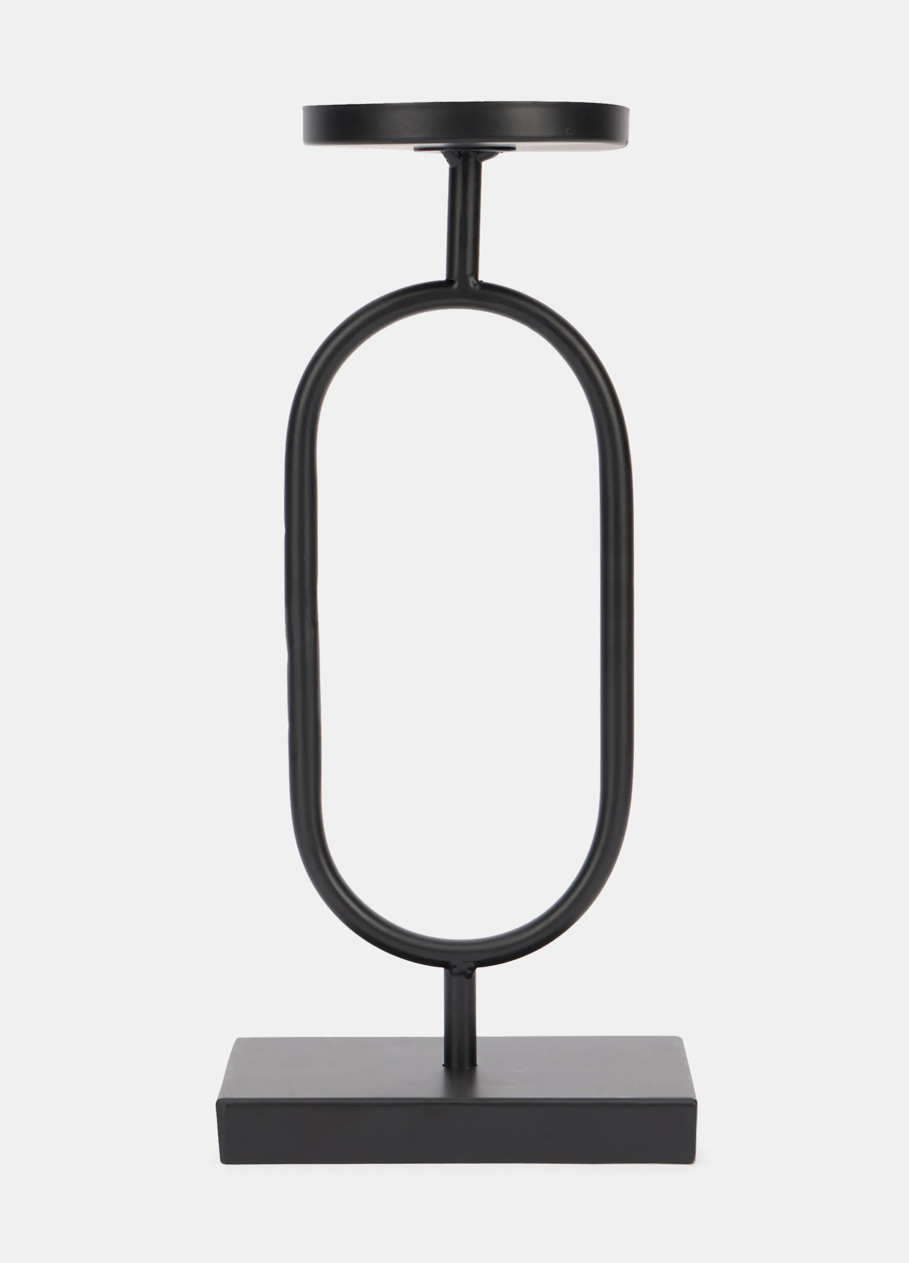 Portacandele nero in ferro verniciato dalla silhouette inconfondibile: la piattaforma rialzata poggia su una costruzione tubolare di forma ovale, che arricchisce qualsiasi ambiente con un tocco di design. Dimensioni: 25,5 x 12,8 x 8,5 cm.