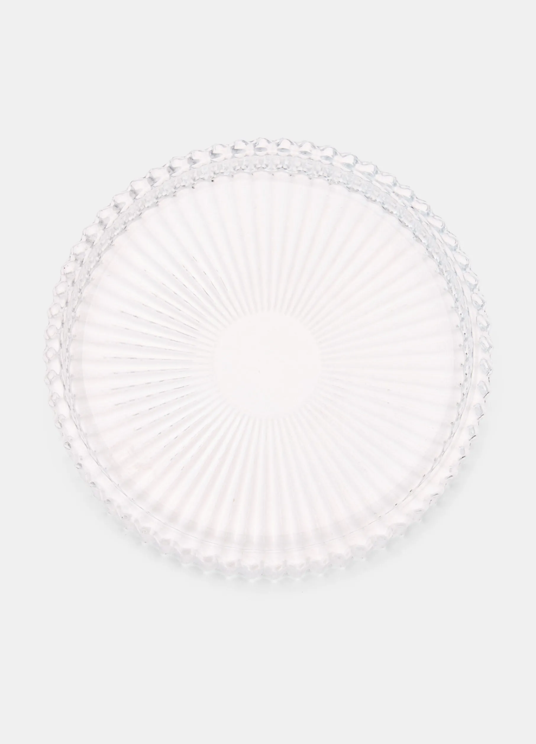 Elegante vassoietto portacandele a base rotonda con bordo basso, realizzato in vetro trasparente e scanalato. Diametro: 10 cm.