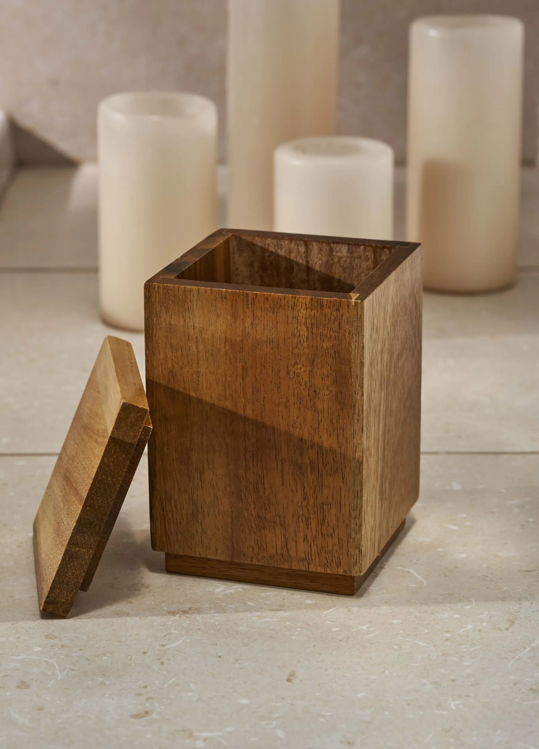 Portaspazzolini con coperchio in legno di acacia.